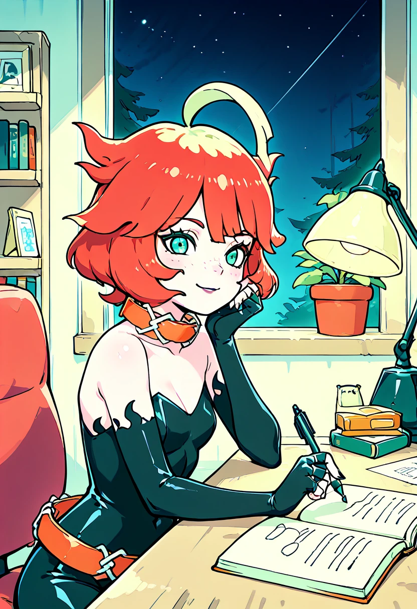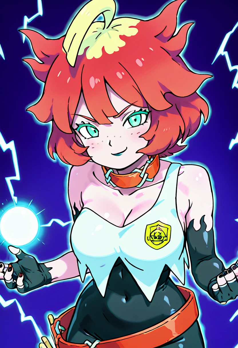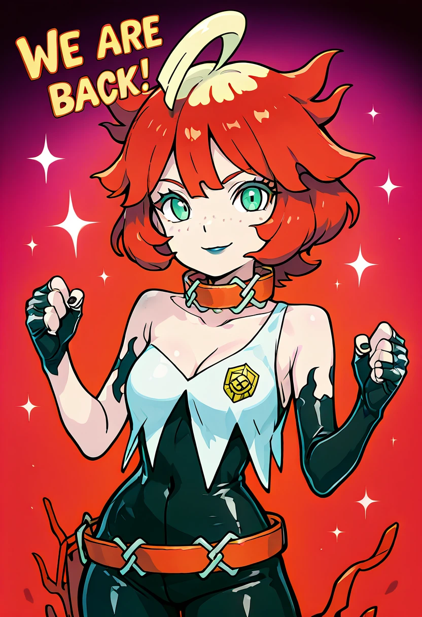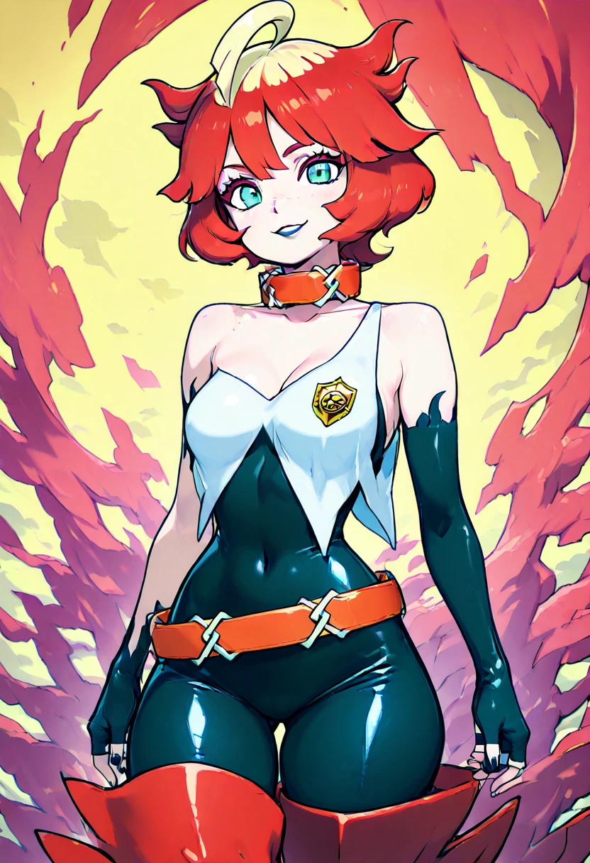 zzMela, green eyes, ahoge, freckles, red hair, multicolored hair, two-tone hair, short hair, black gloves, collar, fingerless gloves, bare shoulders, black bodysuit, nail polish, collarbone, large breasts,