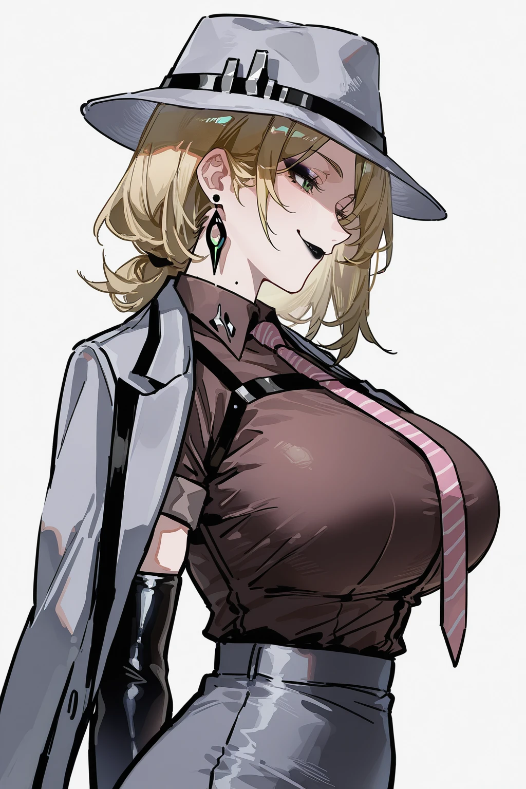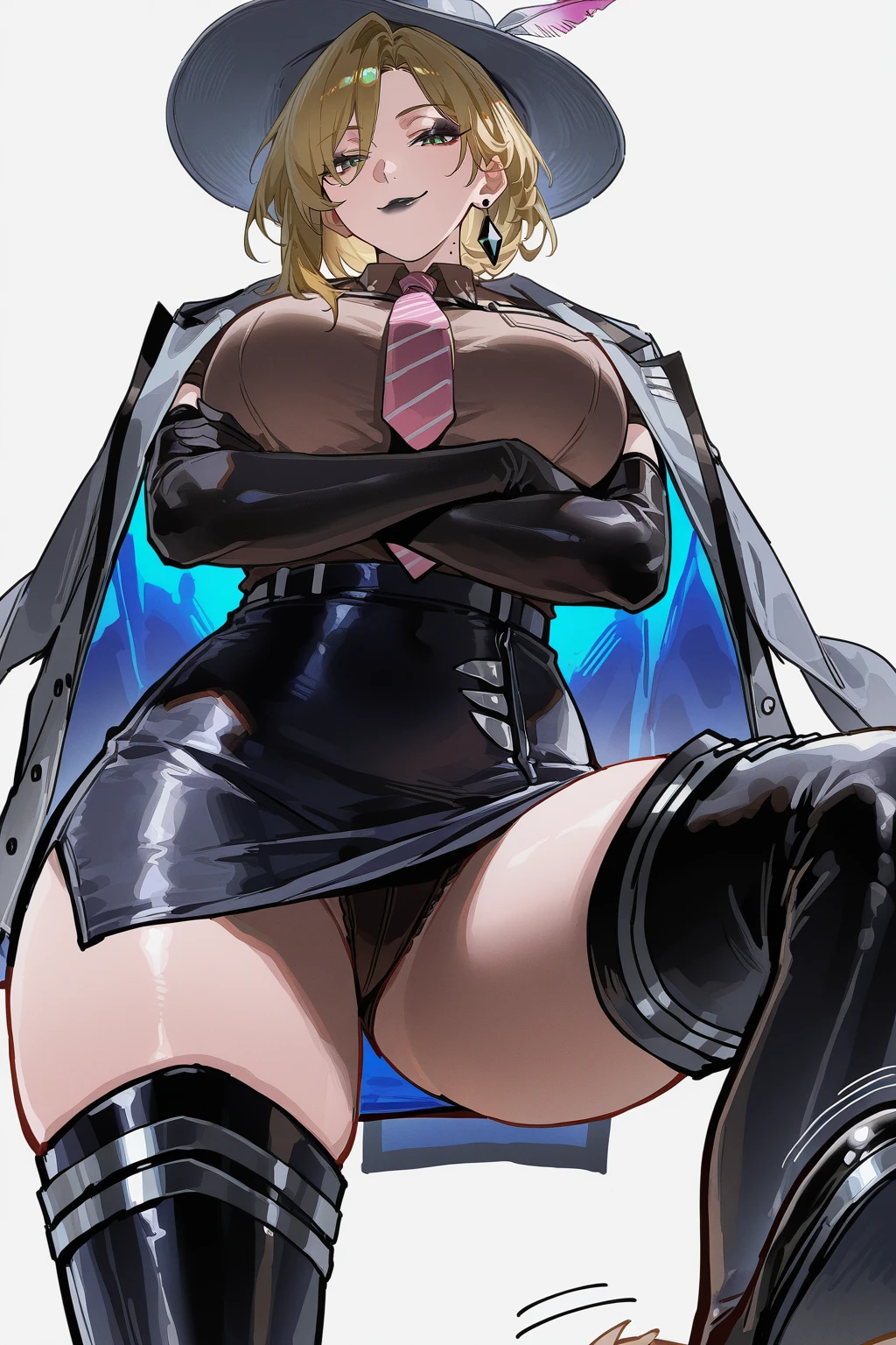 single earring, brown shirt, collared shirt, pink striped necktie, jacket on shoulders, grey jacket, grey pencil skirt, black elbow gloves,hat feather,thigh boots