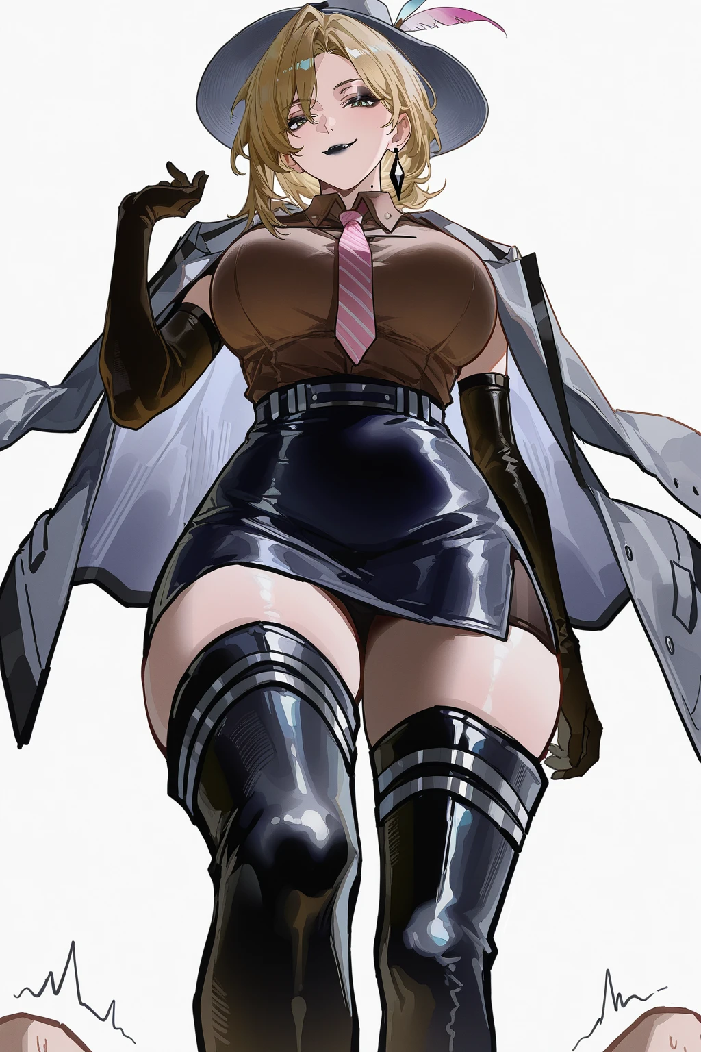 Clothes: single earring, brown shirt, collared shirt, pink striped necktie, jacket on shoulders, grey jacket, grey pencil skirt, black elbow gloves, hat feather, thigh boots