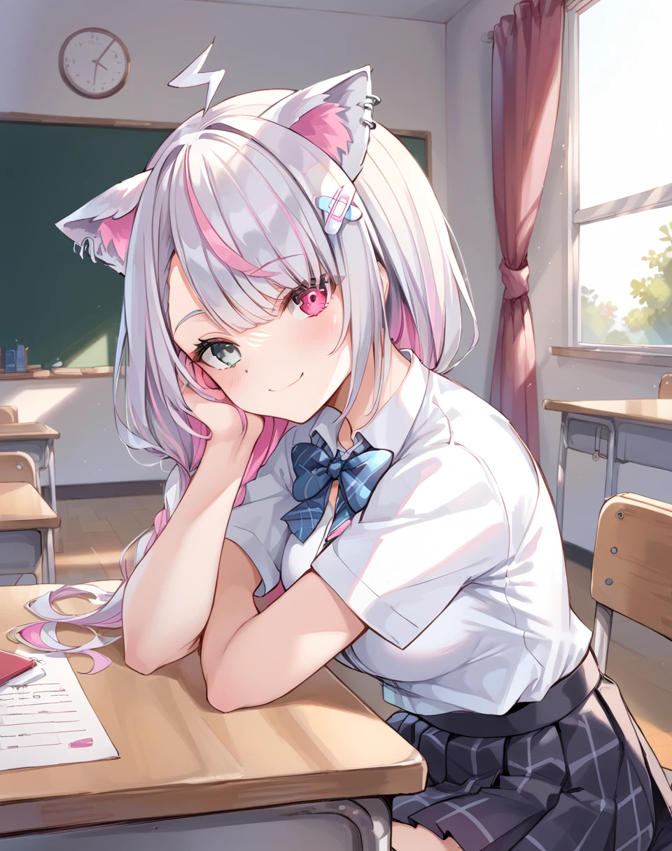lolo_vt, long hair, white hair, streaked hair, brided ponytail, heterochromia, grey eye, pink eye, barcode, virtual youtuber, cat ears, multicolored hair, barcode tattoo, pink hair, ahoge,