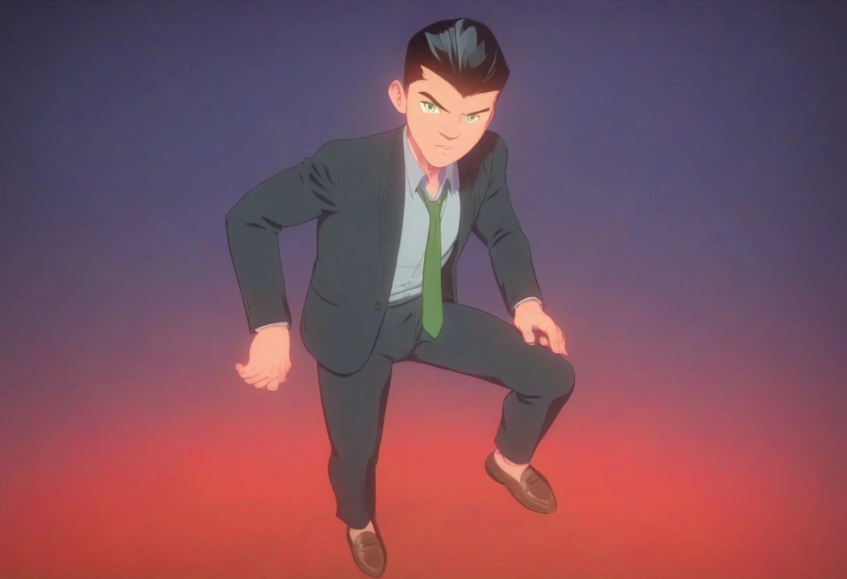 necktie, formal, green necktie, suit, jacket, pants, shirt, shoes, brown footwear, gradient,