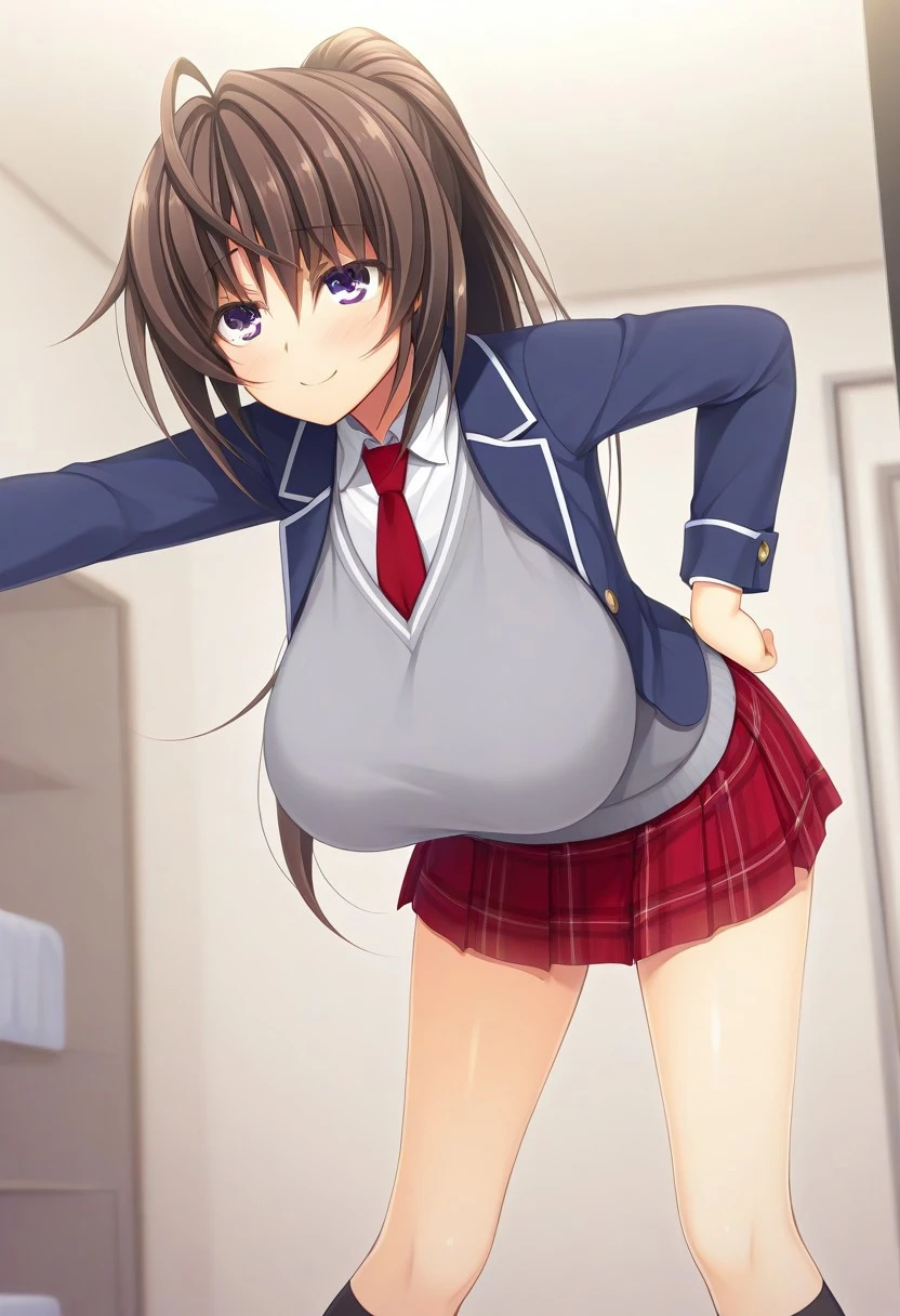 Suzuka Ashiya, purple eyes, brown hair, long hair, ponytail, ahoge,