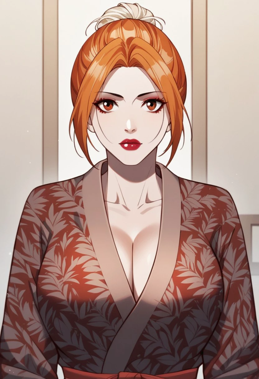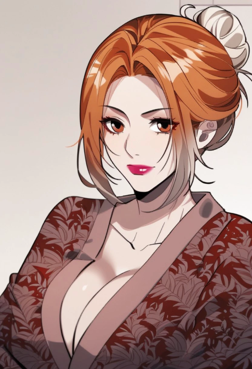 single hair bun, cleavage, red kimono, print kimono,