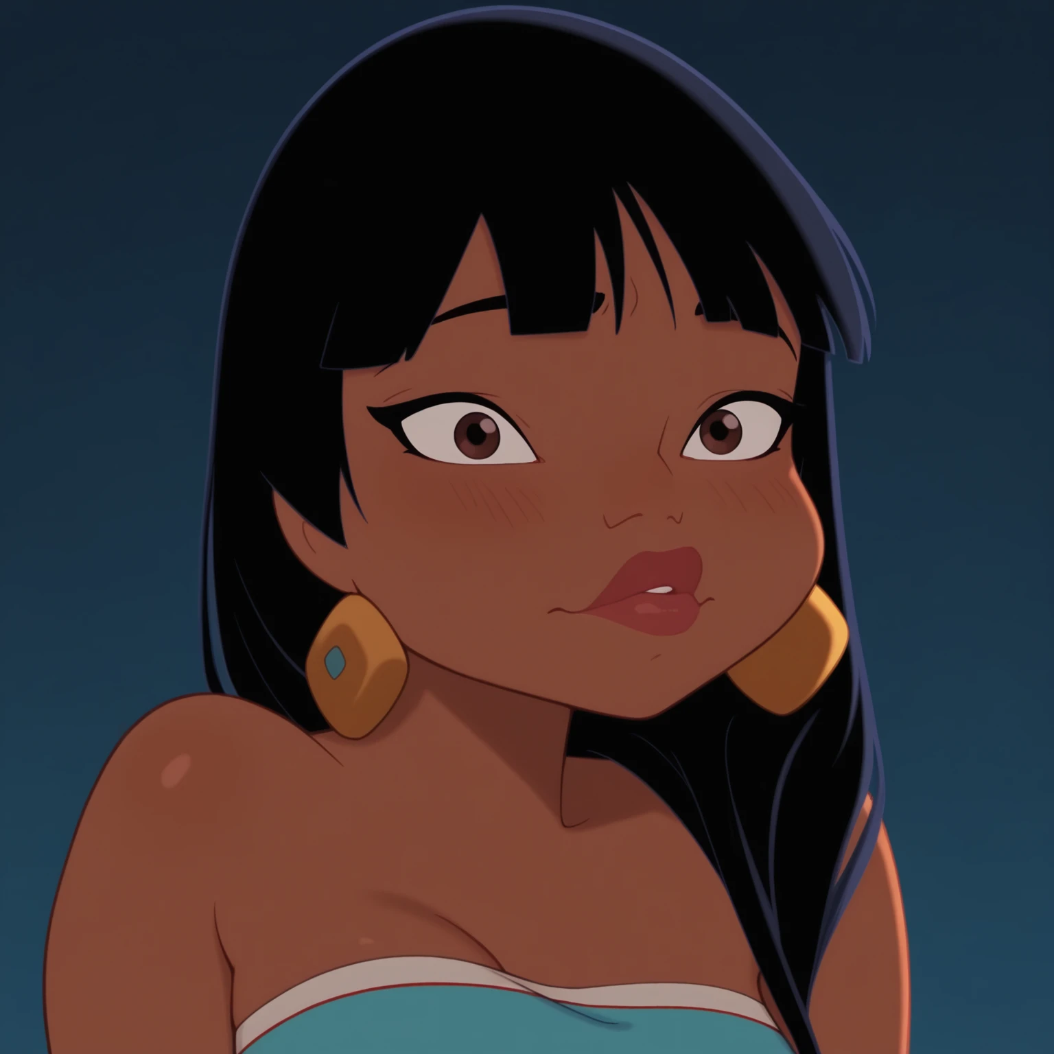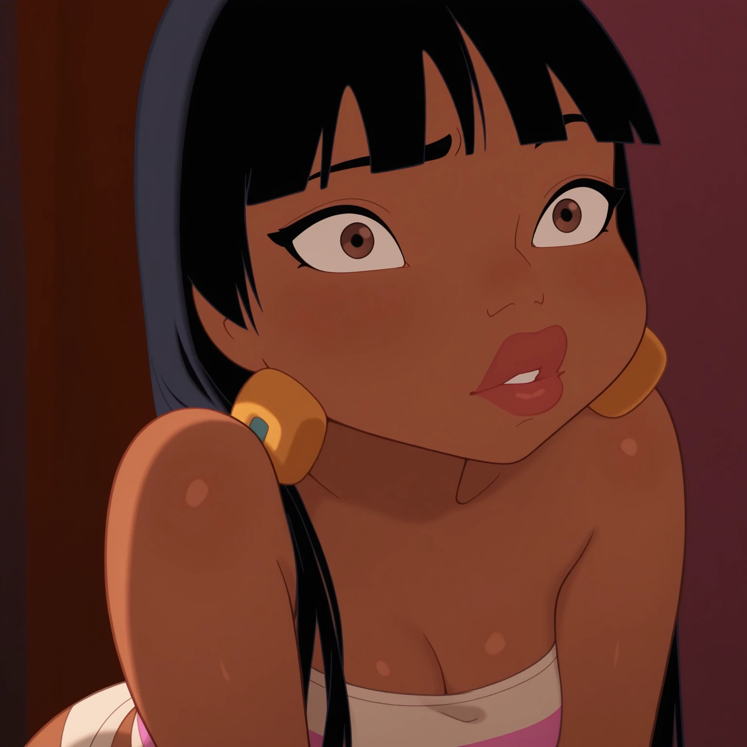 prompts: latina girl, dark-skinned female, bangs, long hair, black hair, brown eyes, wide hips, sexy body, fit body, thick lips, thick thighs, original style, cartoon coloring, cartoon screencap