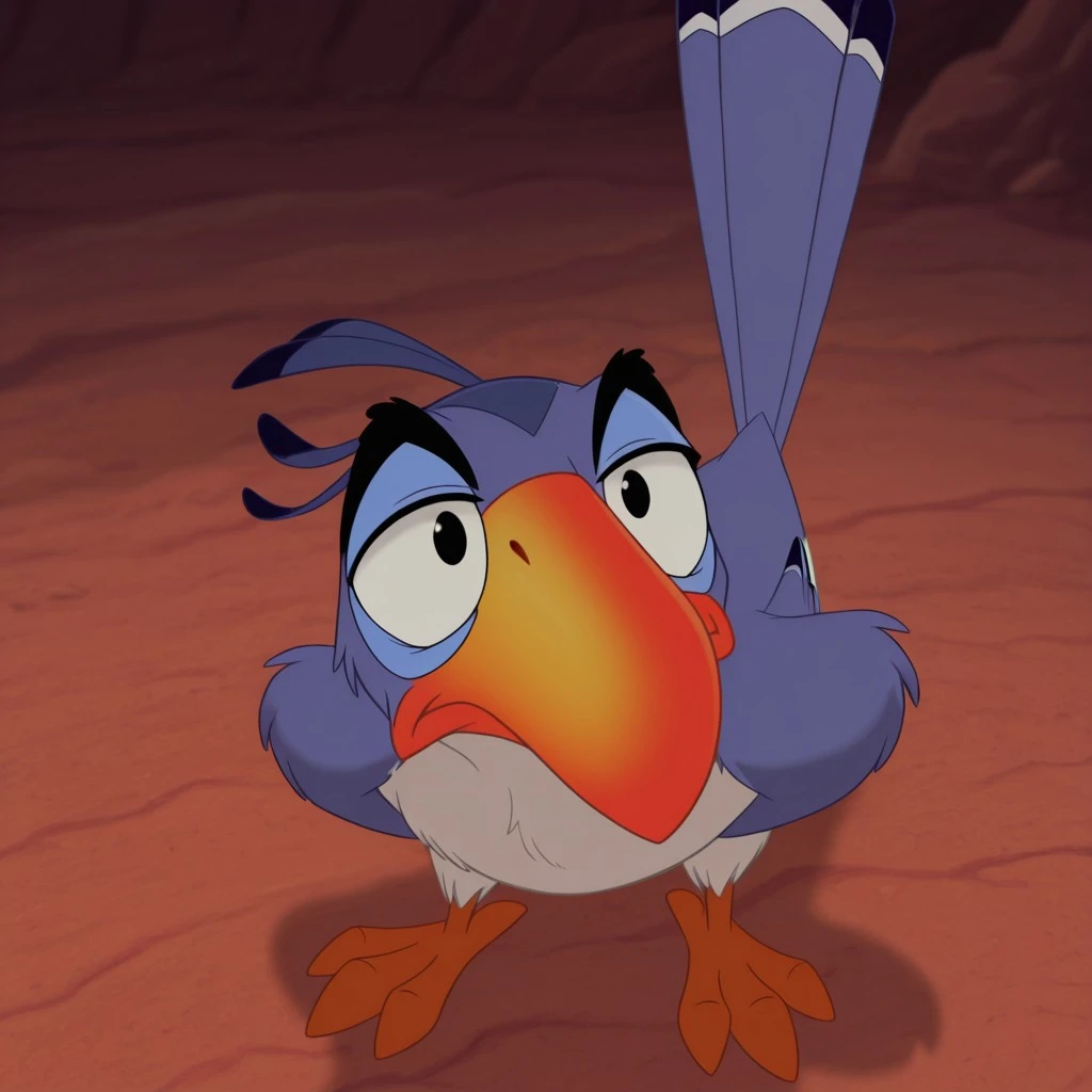feral, hornbill, avian, <Zazu>, male, blue feathers, beak, black eyes
