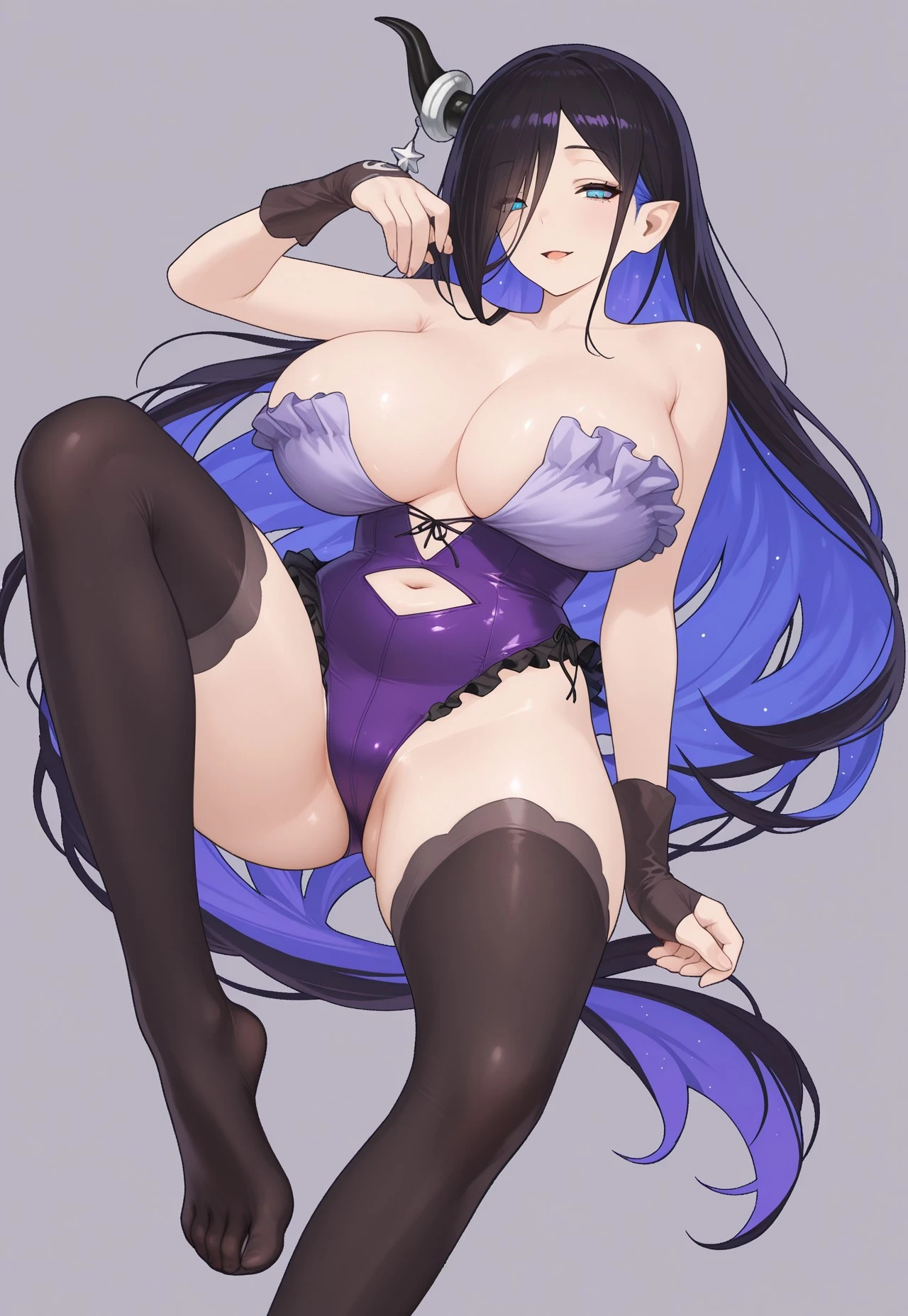 eclipsedef, huge_breasts, blue_eyes, long hair, black_hair, colored inner hair, multicolored hair, blue_hair, horns, broken_horn, accessories, purple_leotard, clevege, bare shoulders, frills, black_gloves, bat_wing_curtain, black_cutout_high_socks, toes,