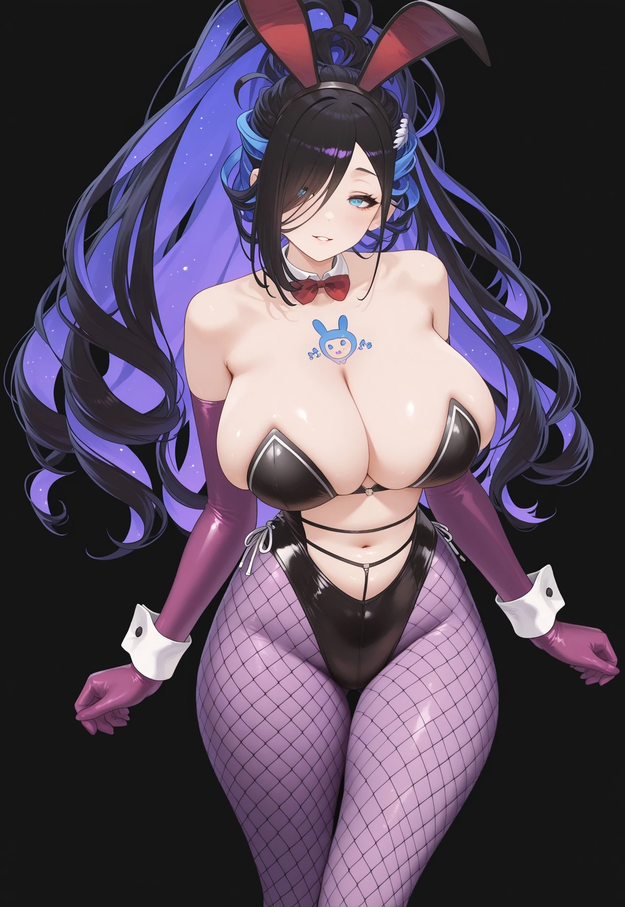 eclipsebunny, huge_breasts, blue_eyes, high ponytail, black_hair, colored inner hair, multicolored hair, blue_hair, black strapless bikini top, clevege cutout, black bunnysuit, stomach cutout, rabbit headband, tattoo, bowtie, evening gloves, bare shoulders, fishnet pantyhose, purple stocking, high heels,