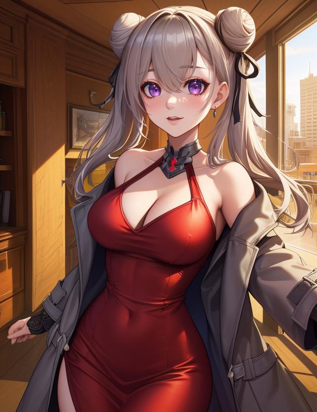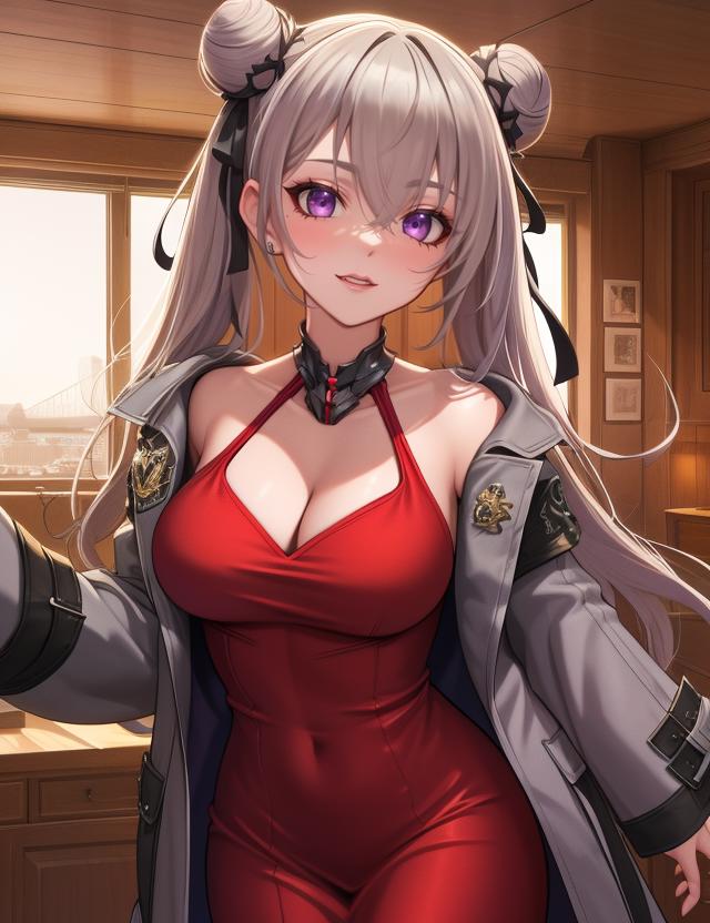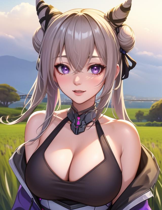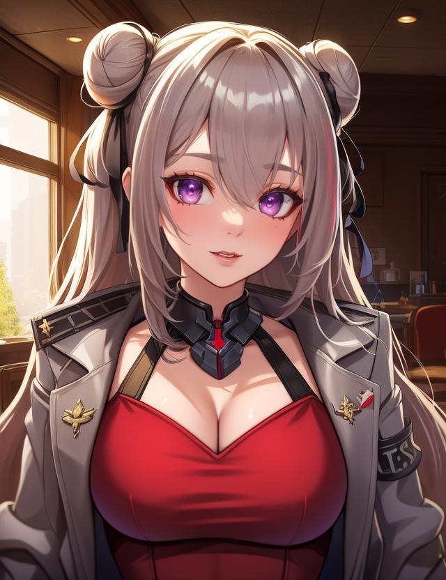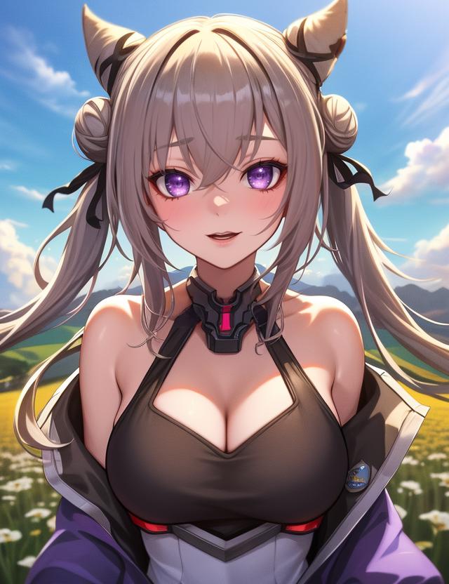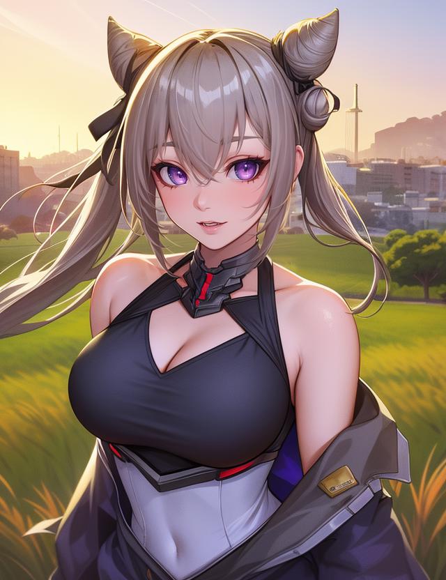 Cowboy shot, San Francisco \(Azur Lane\), Purple eyes, Gray hair, Double bun, Black top,