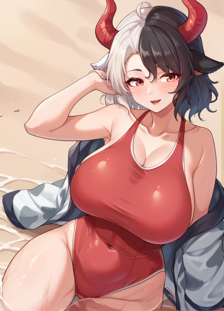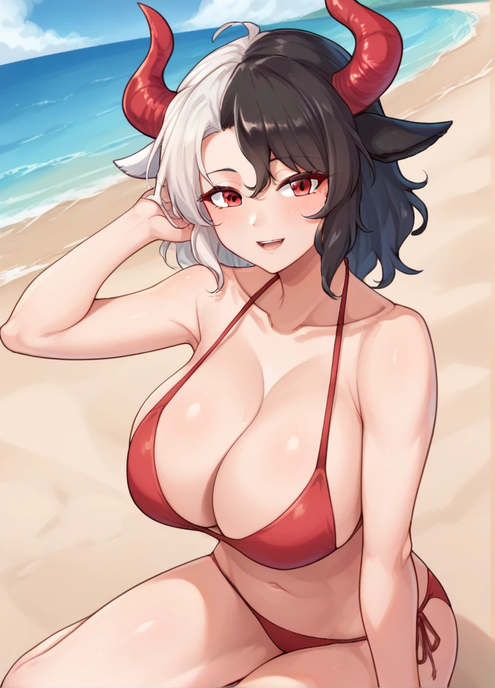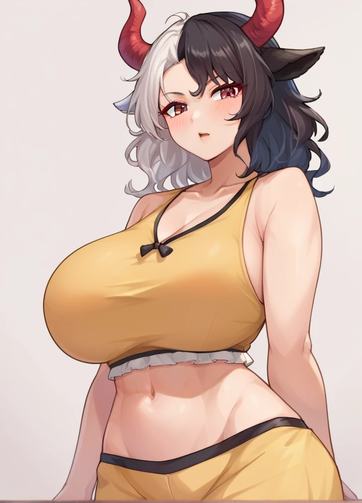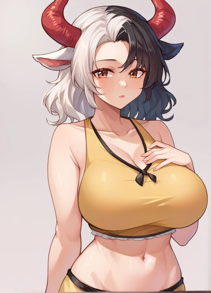 urumitouhou, cow horns, red horns, red eyes, black hair, white hair, large breasts, short hair,