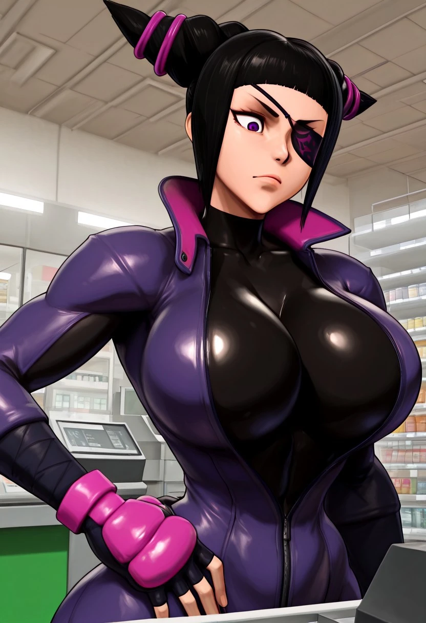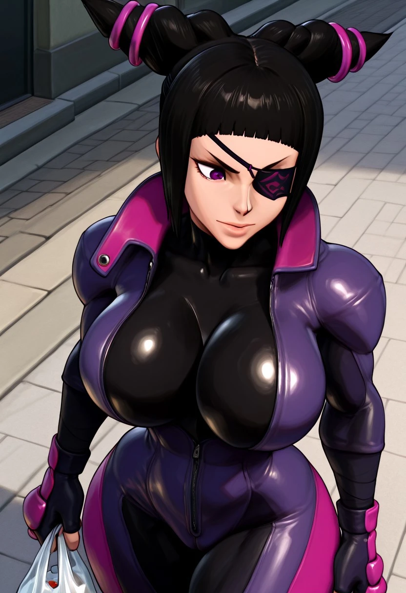 purple jumpsuit, black , pink gloves, fingerless gloves,