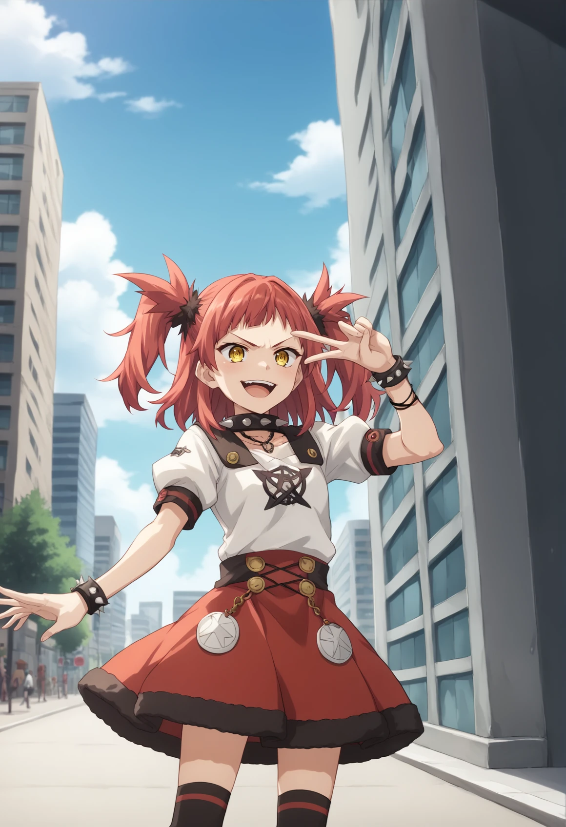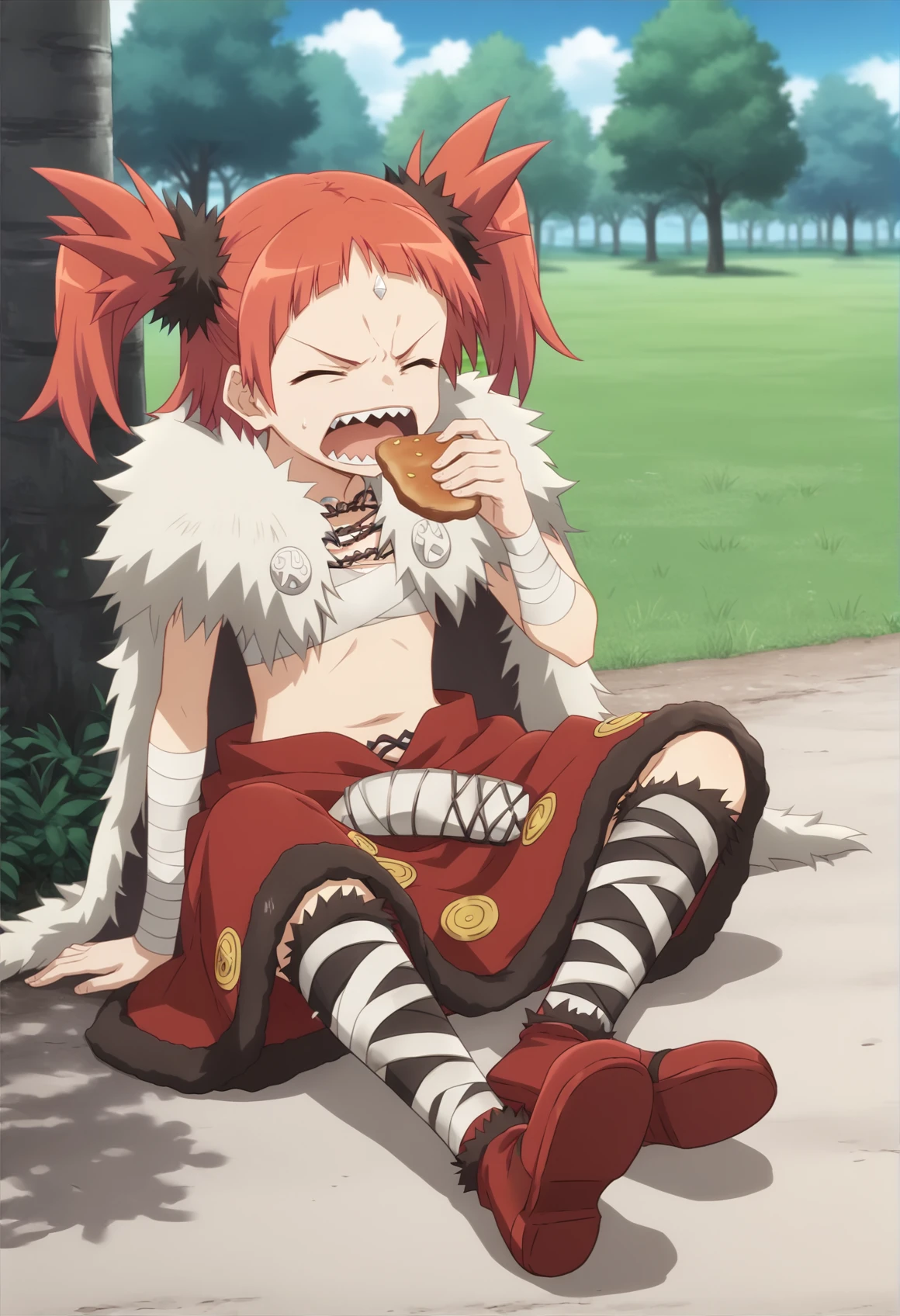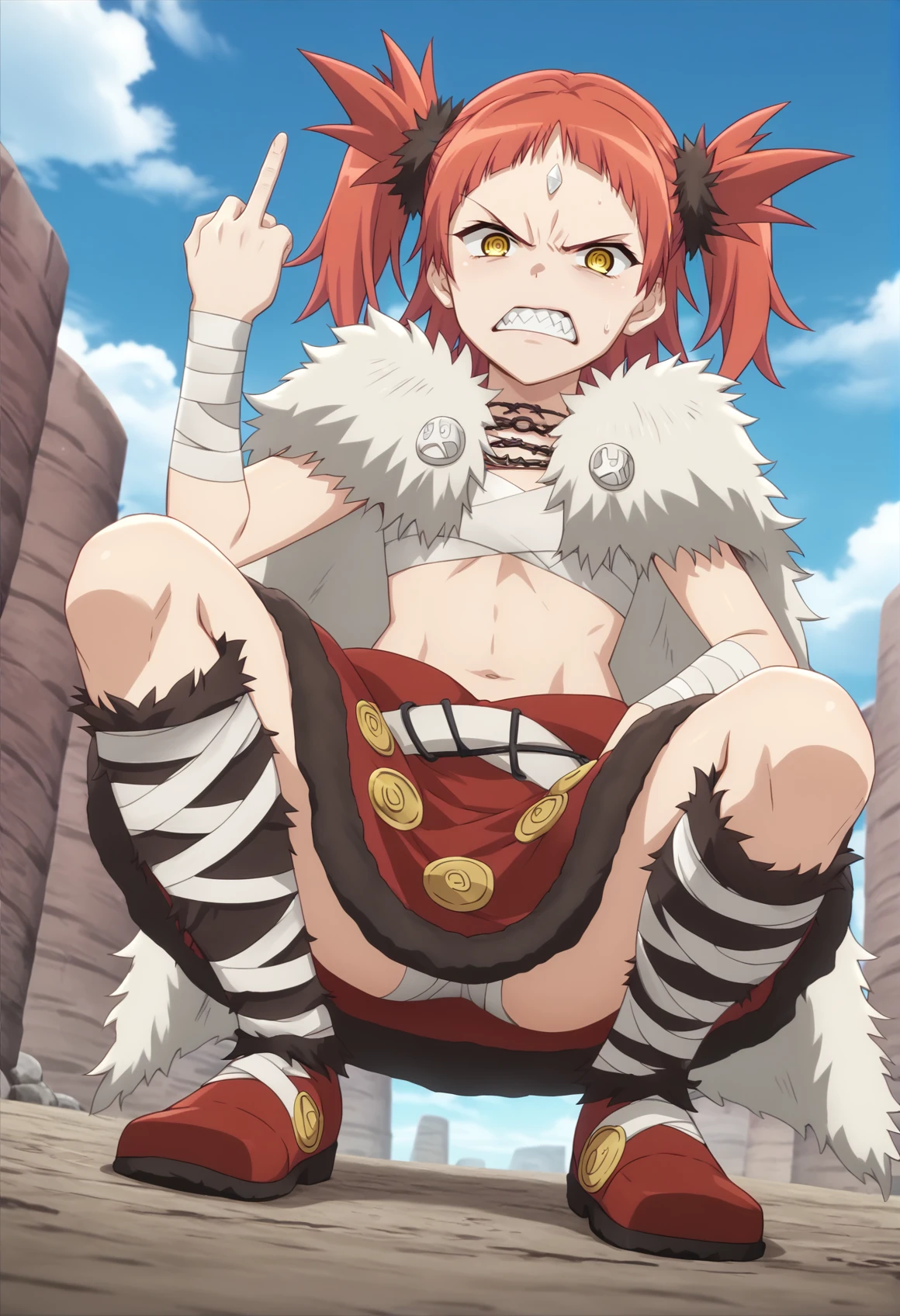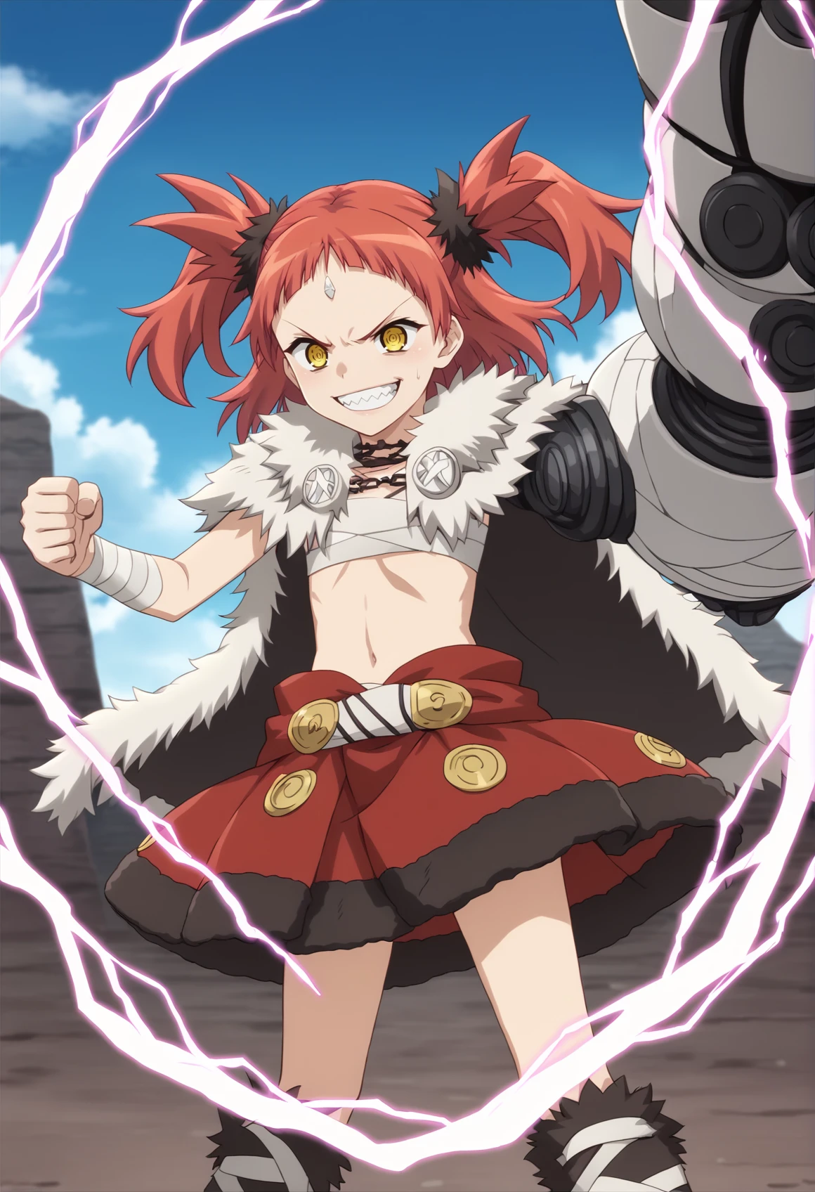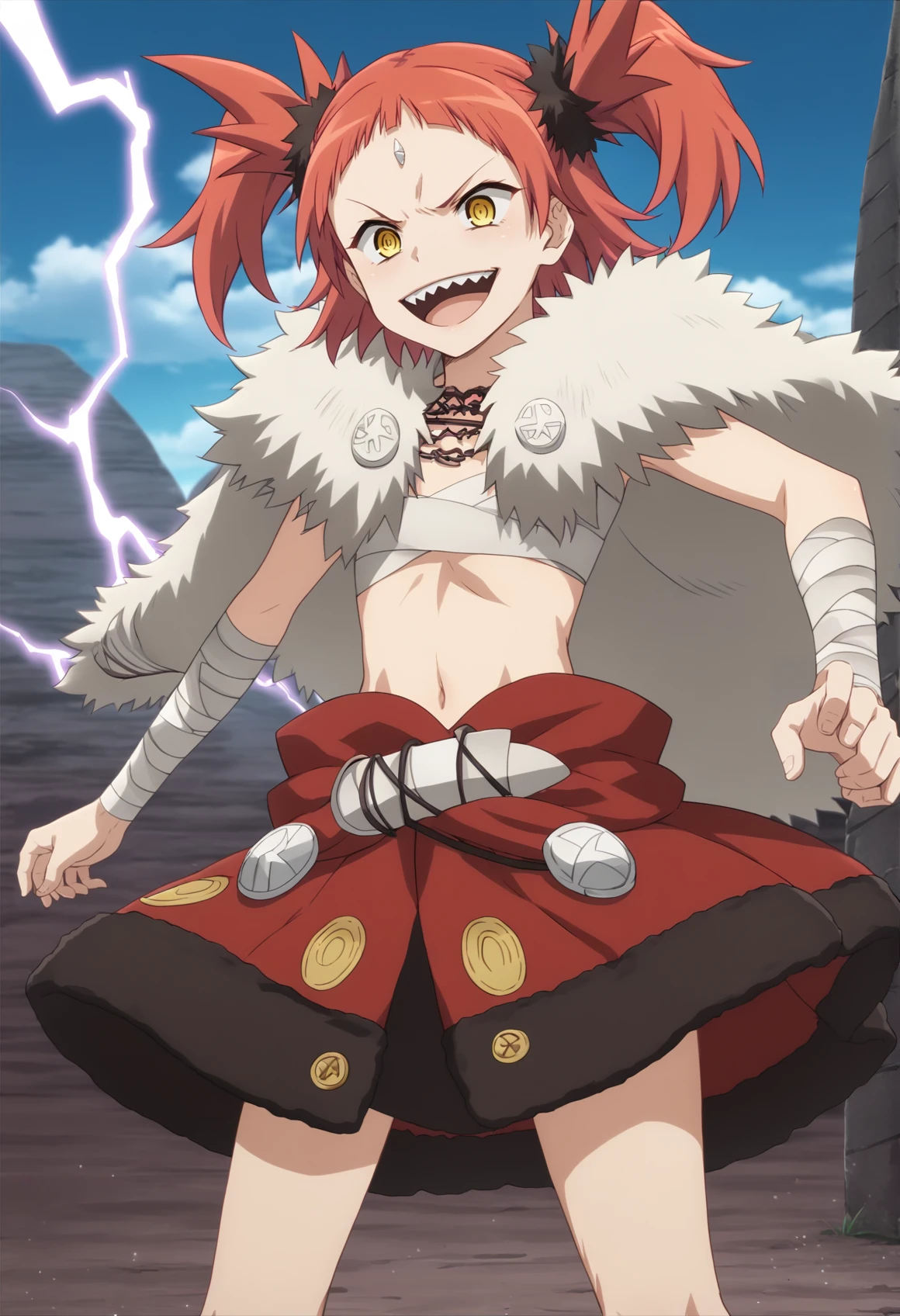 Notable tags: red hair, medium hair, twintails, yellow eyes, forehead jewel, sarashi, barbarian, fur trim, fur cape, bandages, bandaged arm, cape, skirt, boots, sharp teeth,
