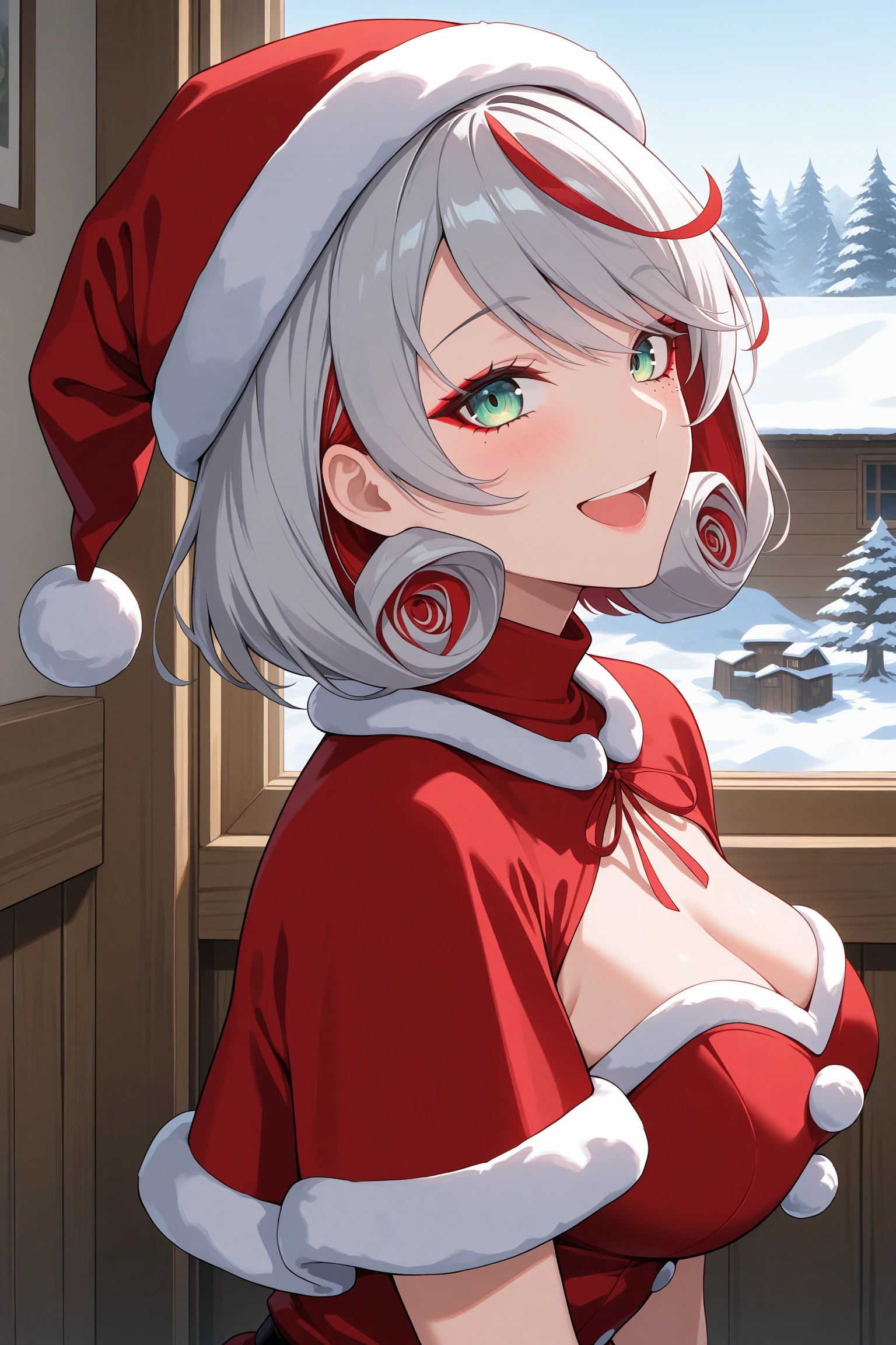destiny (takt op.), anna schneider, multicolored hair, short hair, grey hair, red hair, ahoge, hair ornament, hair flower, crown of thorns, green eyes, makeup, red eyeshadow, mark under eye, red nails, red rings, rose, jewelry, necklace, dress, red dress, detached sleeves, black corset, black pantyhose, red highheelDescription