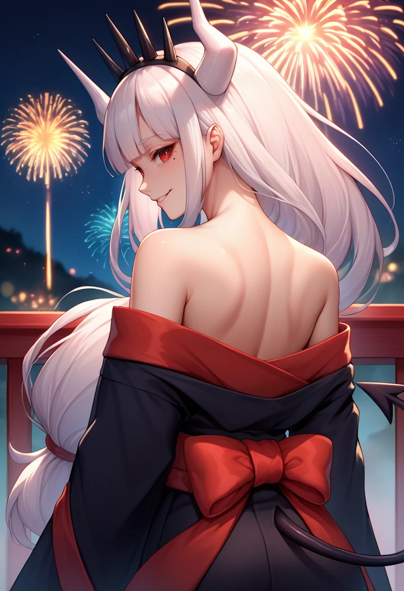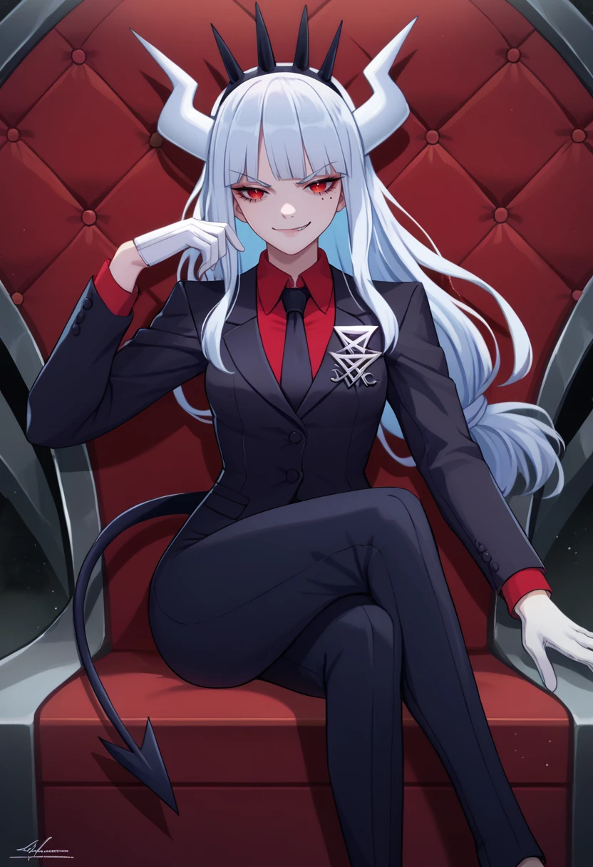 Default Outfit: luciferdef, mole under eye, long hair, crown, white horns, demon horns, formal, business suit, black jacket, badge, long sleeves, red shirt, black necktie, white gloves, black pants, demon tail