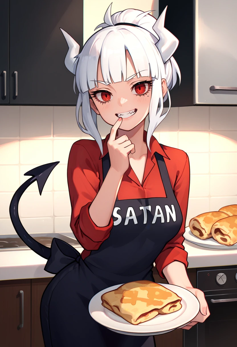 Apron: luciferapron, mole under eye, ponytail, white horns, demon horns, red shirt, sleeves rolled up, black apron, clothes writing, demon tail