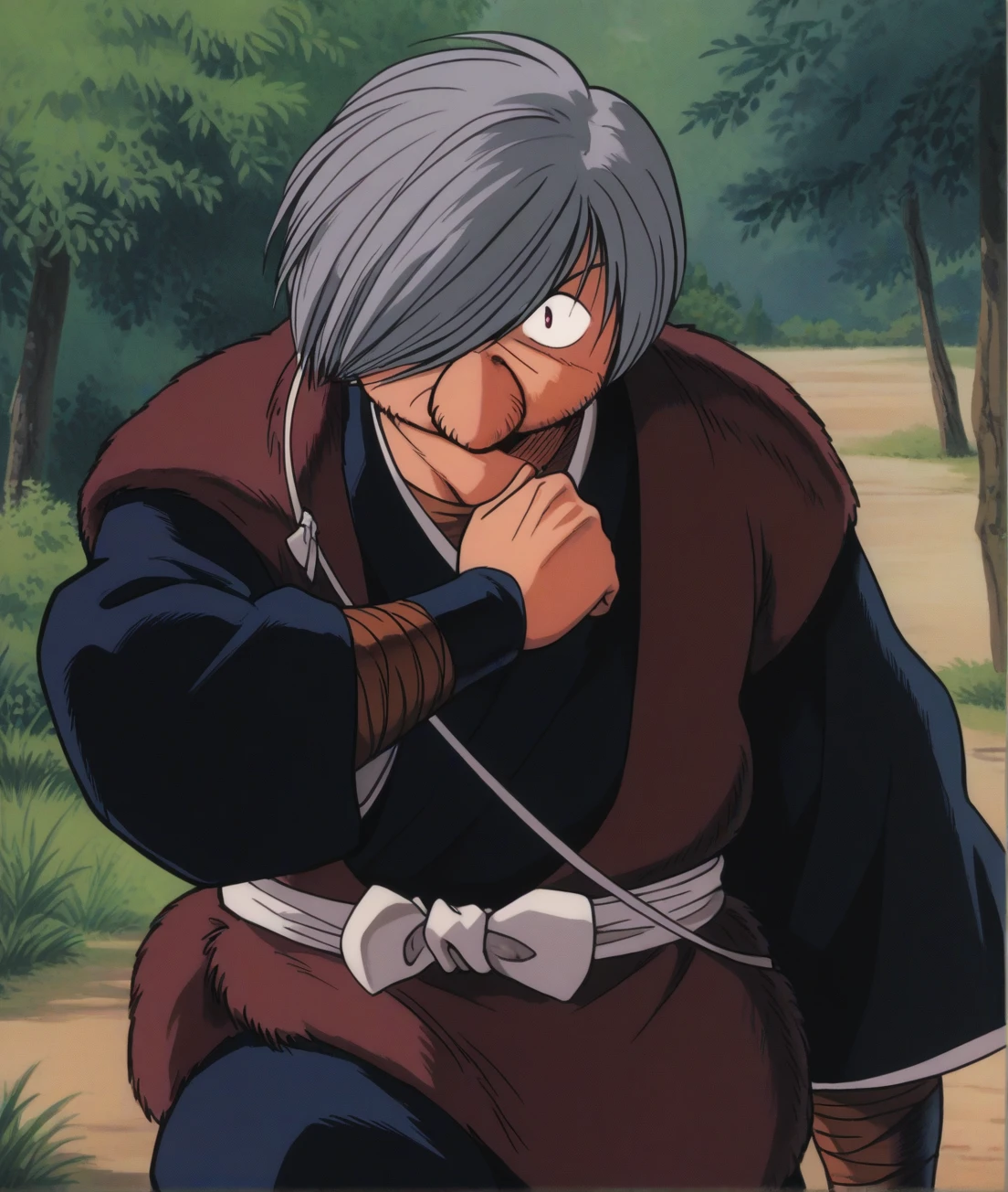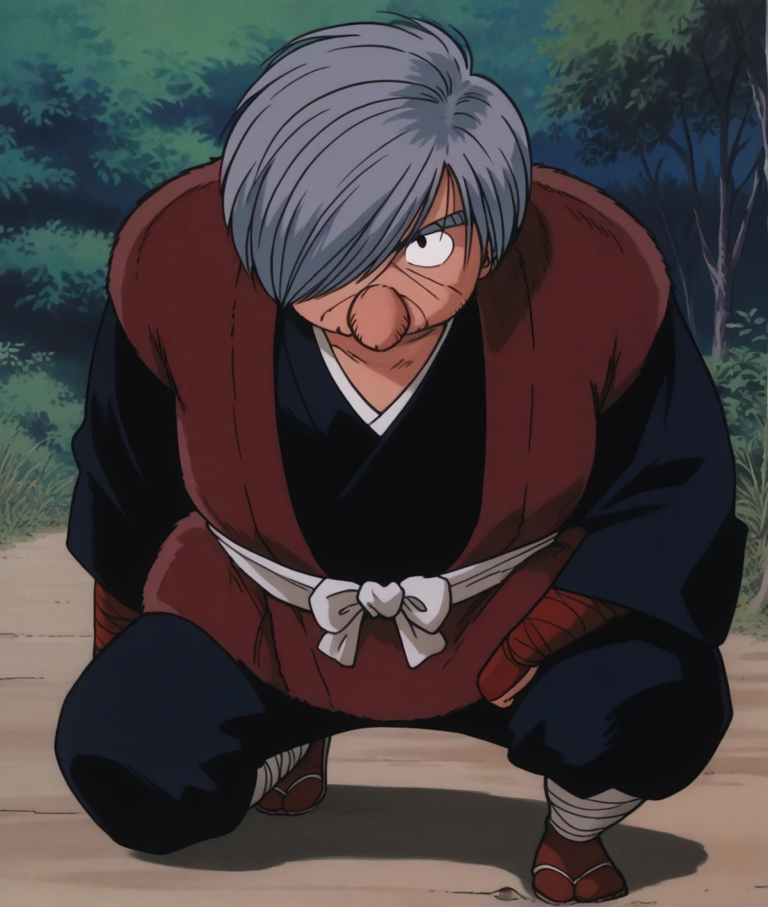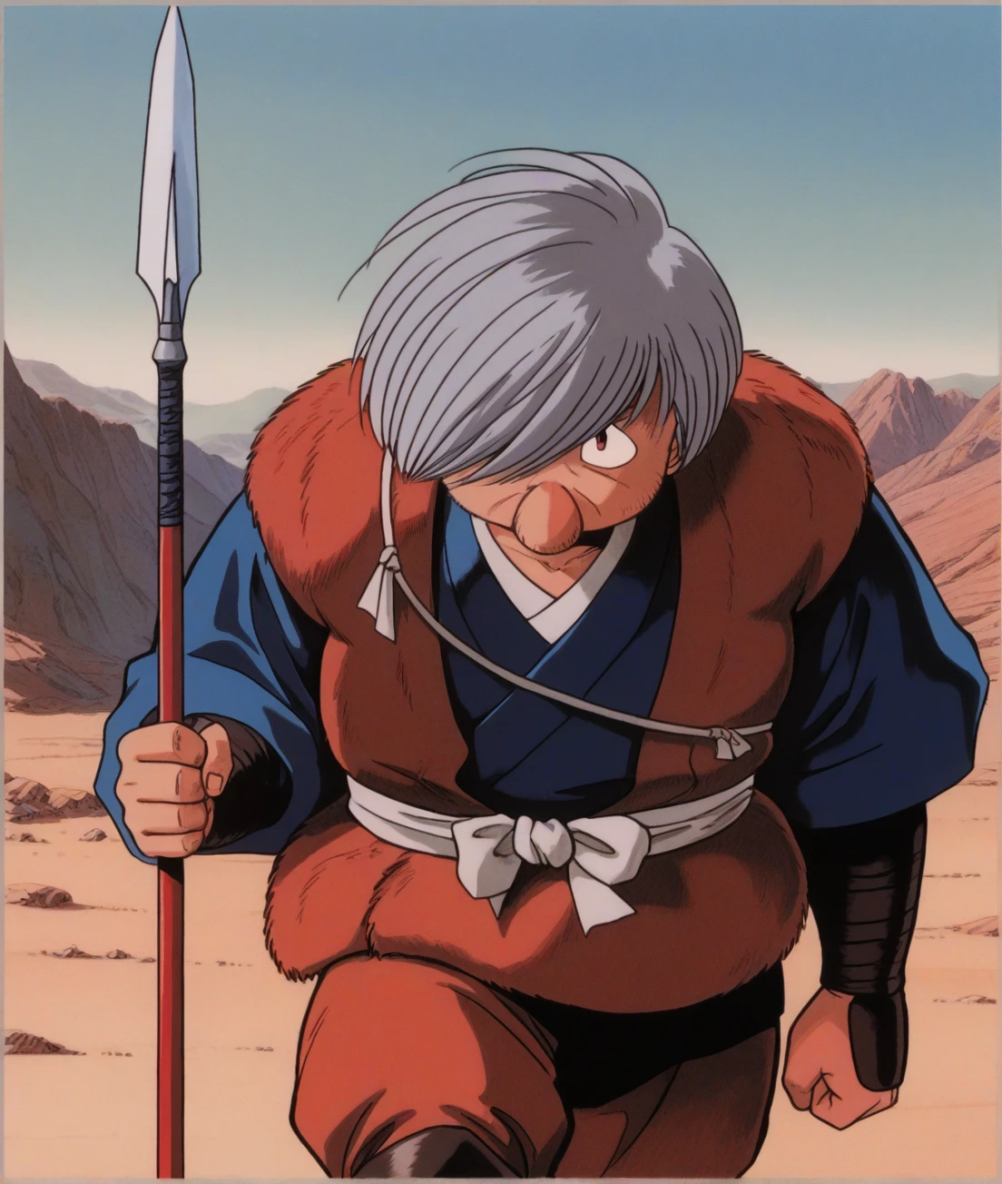 shikanme, gray hair, Hair over one eye, fat man, large nose, ninja clothes, black kimono,black pants, || holding spear, long spear,