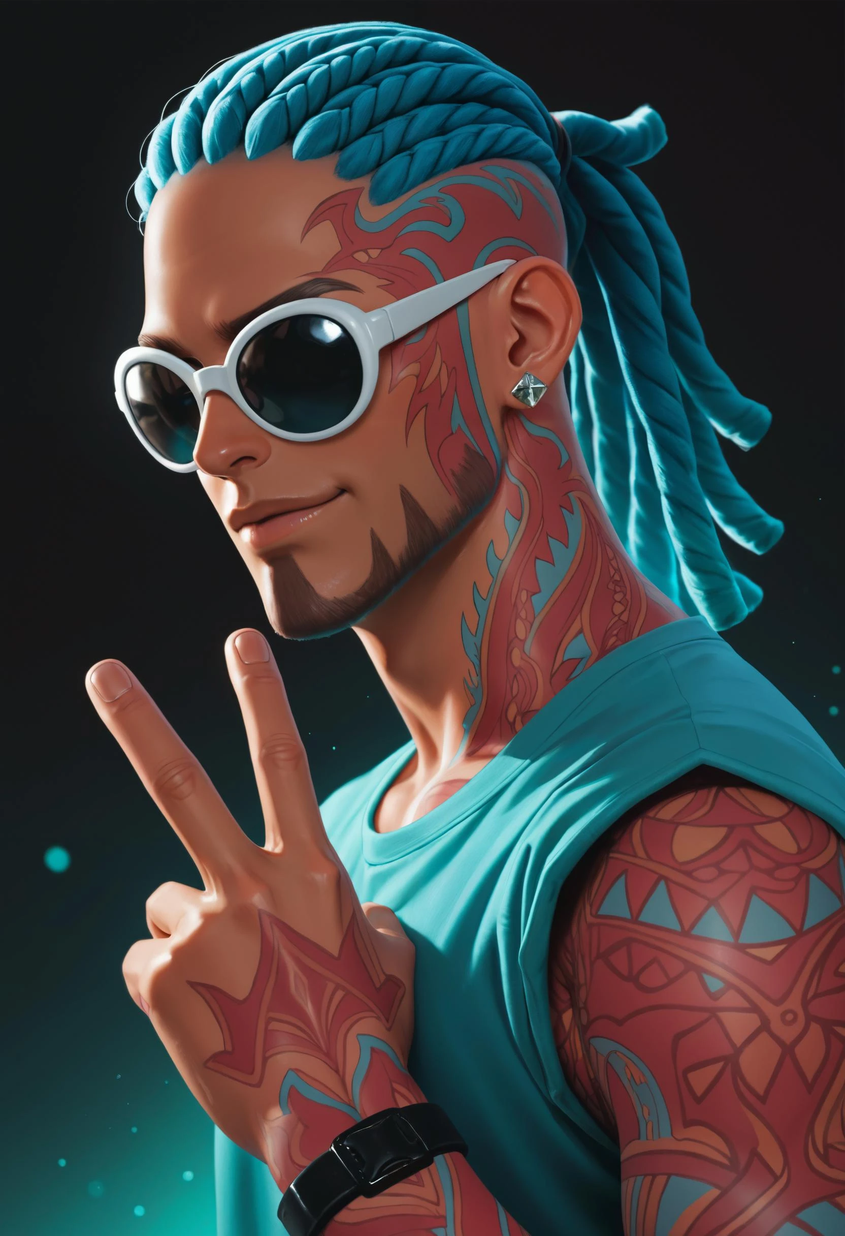 Trigger words: kkrab, white thick round sunglasses, black lenses, braided cornrows on top, thick rope-like dreads, hair color cyan top, teal-to-green,red base tattoos with cyan flame motifs, serpentine lines, diamond stud earrings
