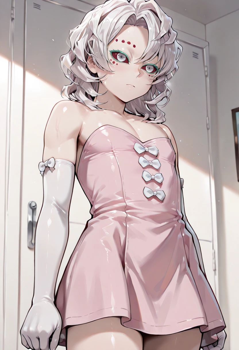 Rui,white hair,clored sclera,red sclera, white eyes,dots on iris,light green eyelashes,light green nail polish,no eyebrows,face painting