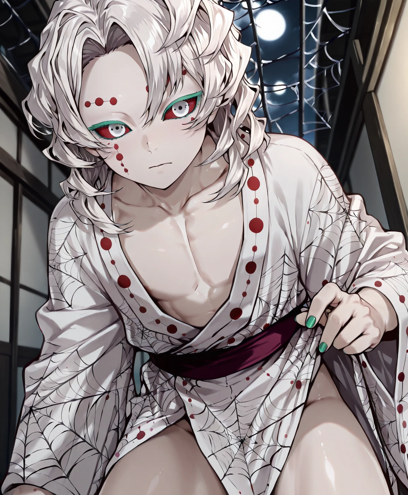 Also: white kimono, spider web pattern,