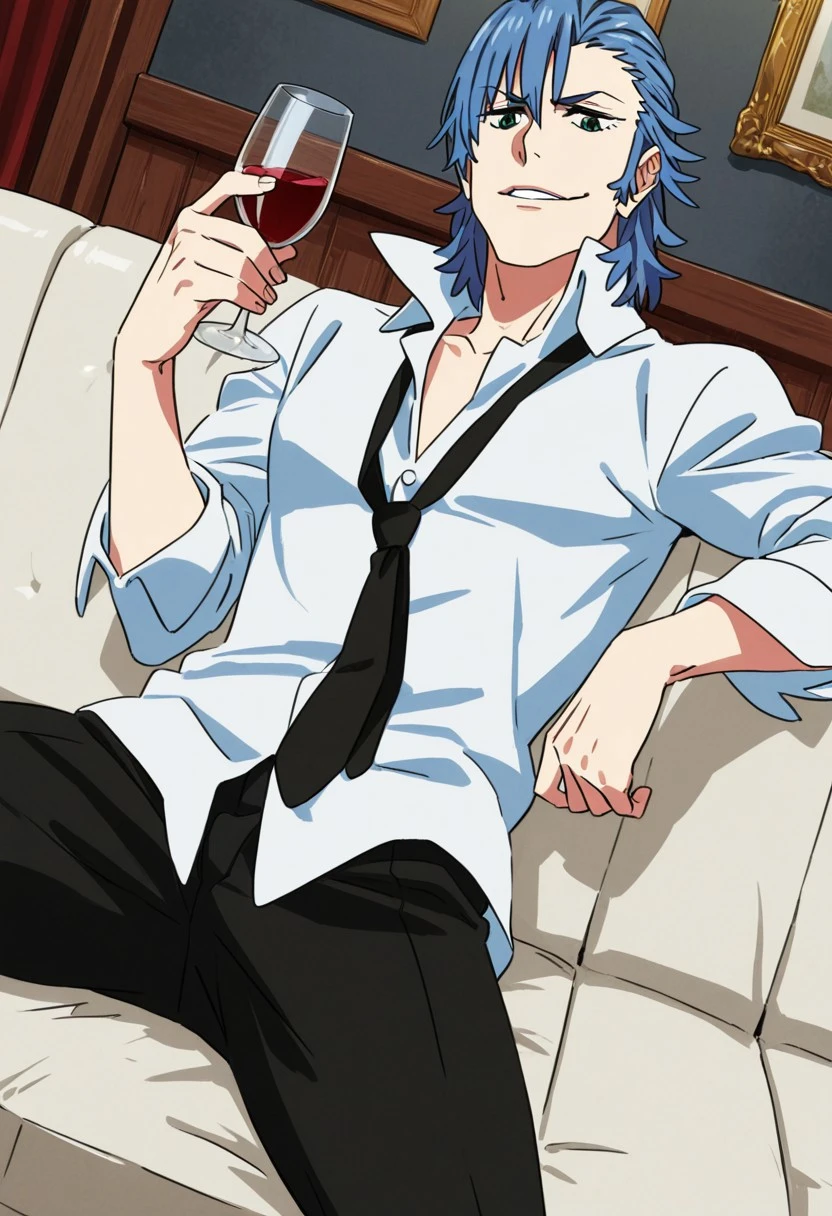 Aikuro Mikisugi, blue hair, blue-green eyes, white collared shirt, popped collar, low neckline, black necktie, black pants, black shoes