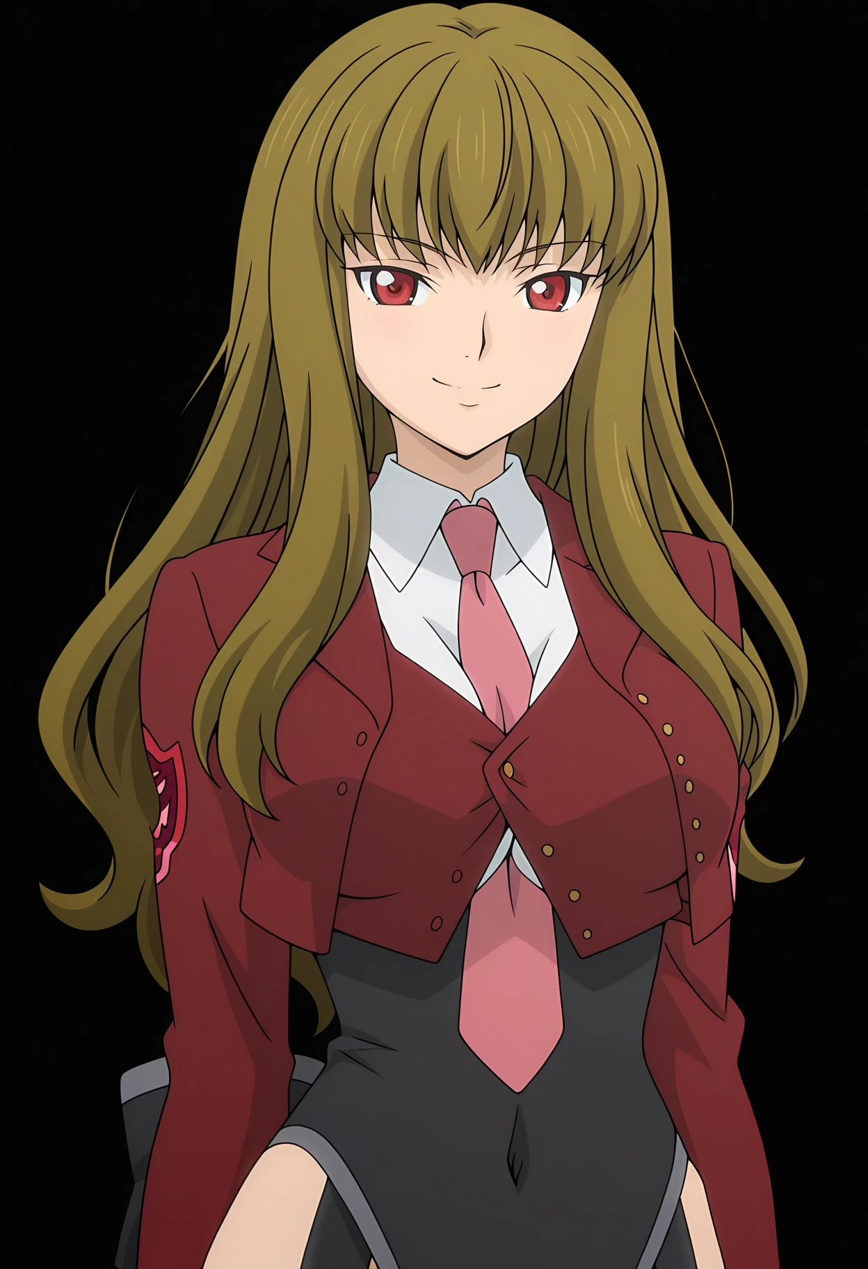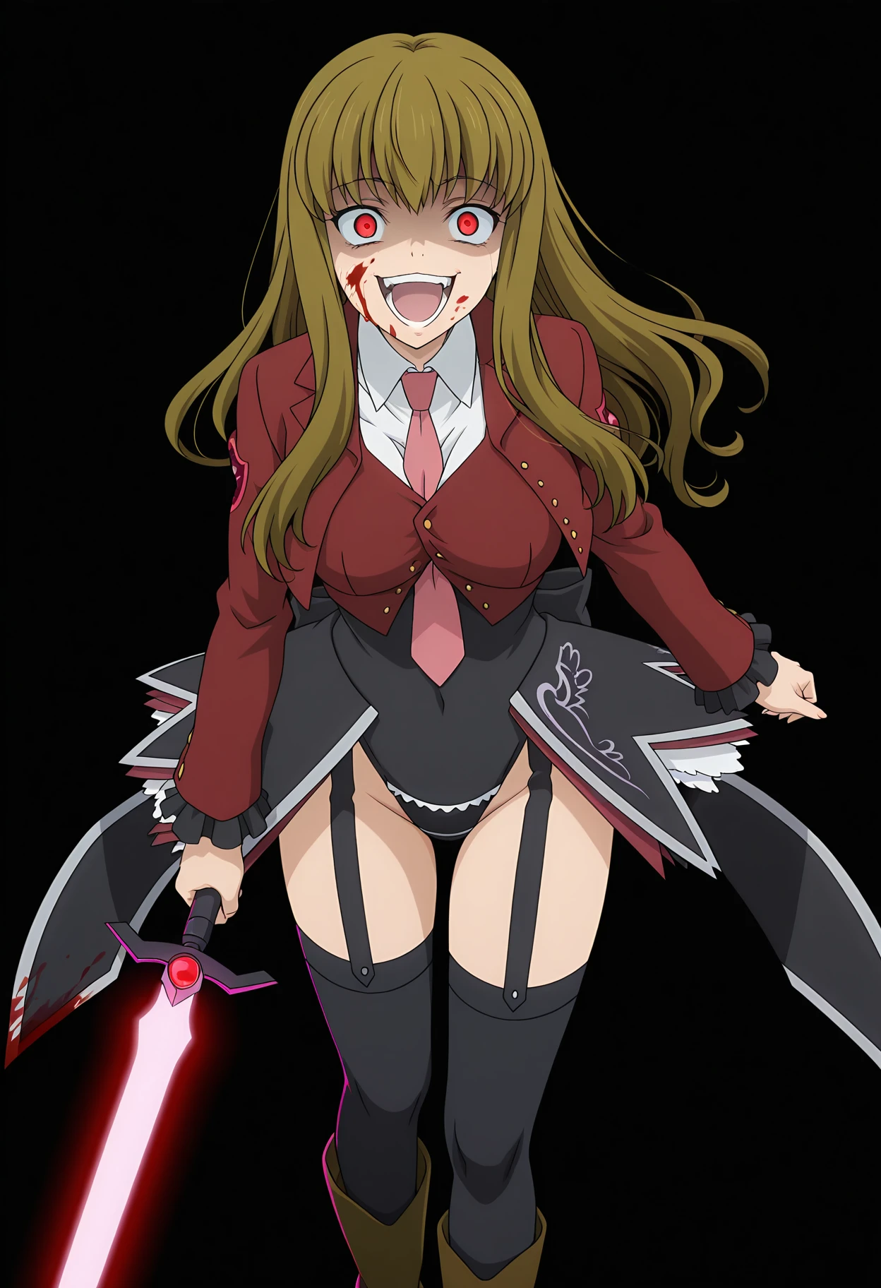 1girl, solo, mammon, stakes of purgatory, long hair, brown hair, blonde hair, bangs, red eyes,