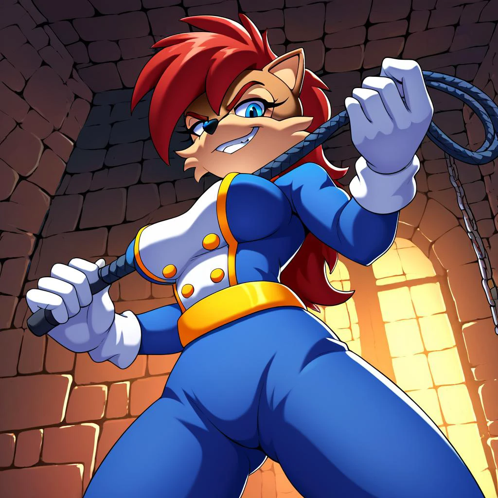 whip, holding whip, dark blue boots with black trim, dark boots with black trim, dark blue uniform with black trim, dark uniform with black trim, black buttons, black belt, anti sally acorn_alt, 3d,