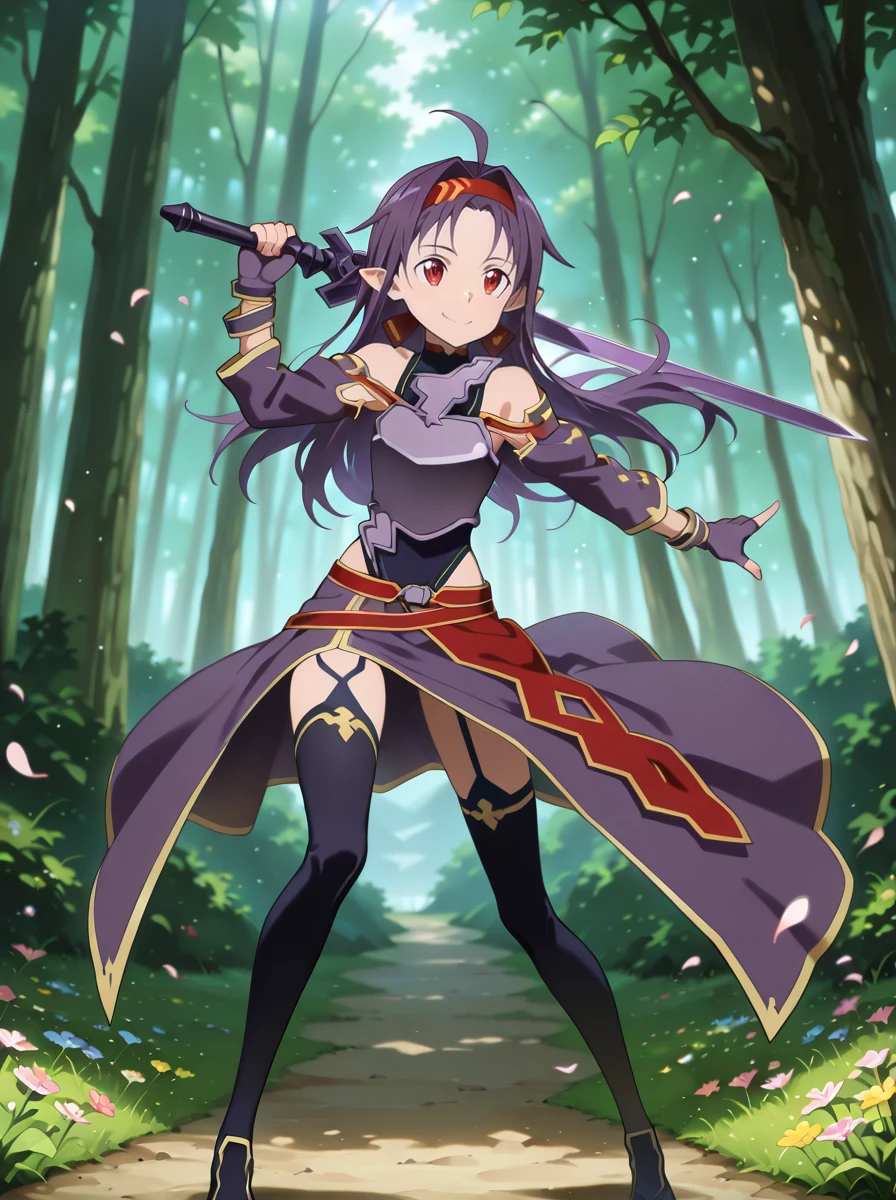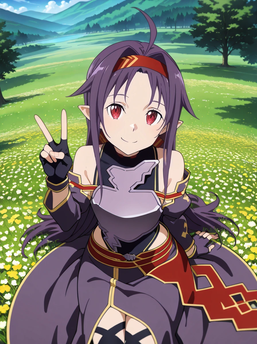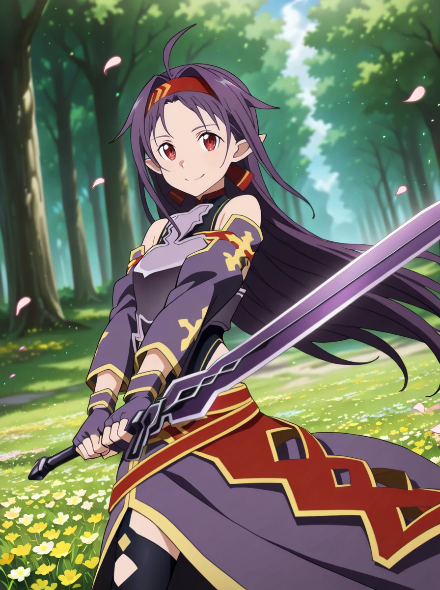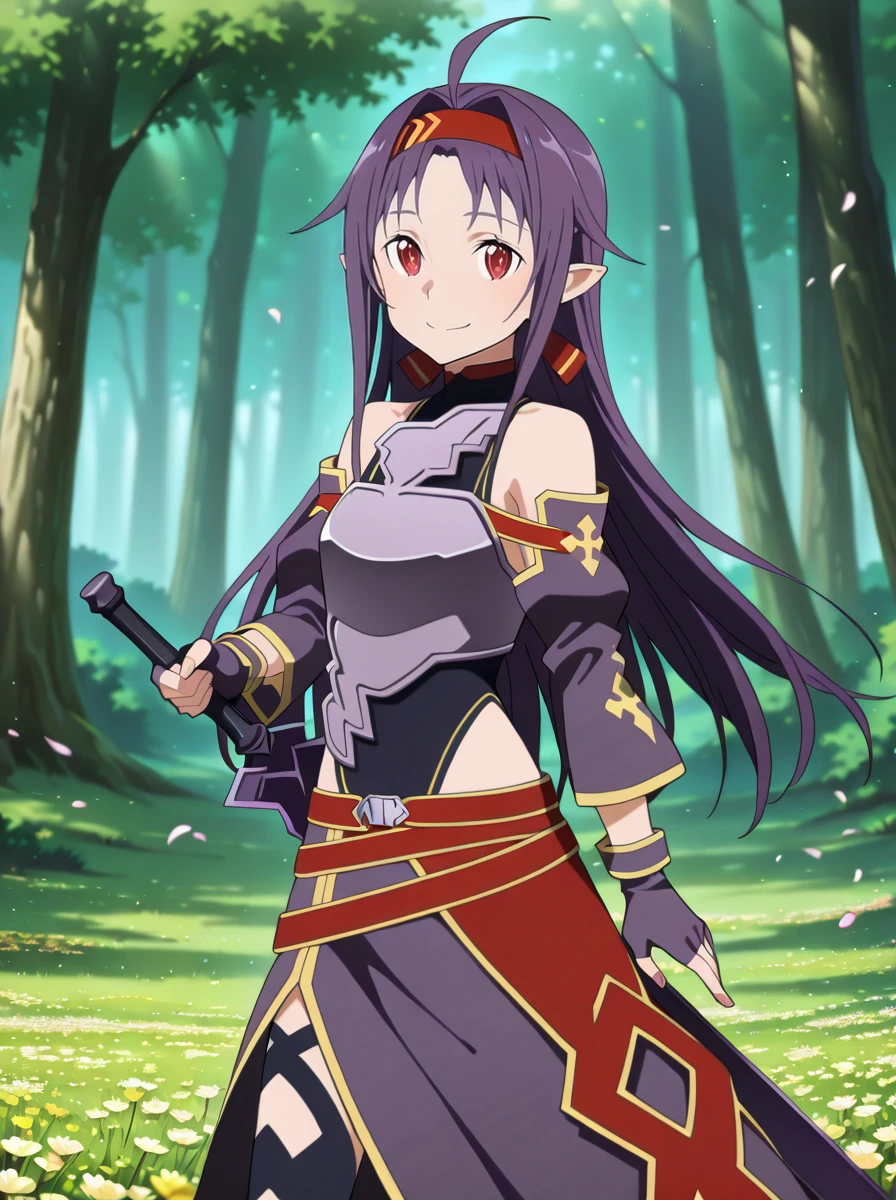 Prompts: 1girl, purple hair, long hair, red eyes, pointy ears, gloves, fingerless gloves, breastplate, armor, hairband, , detached sleeves, ahoge, red hairband