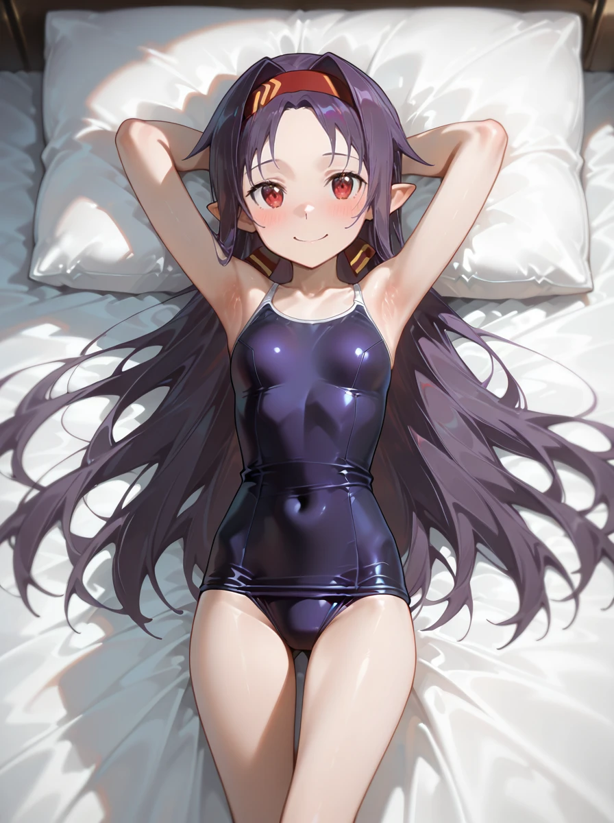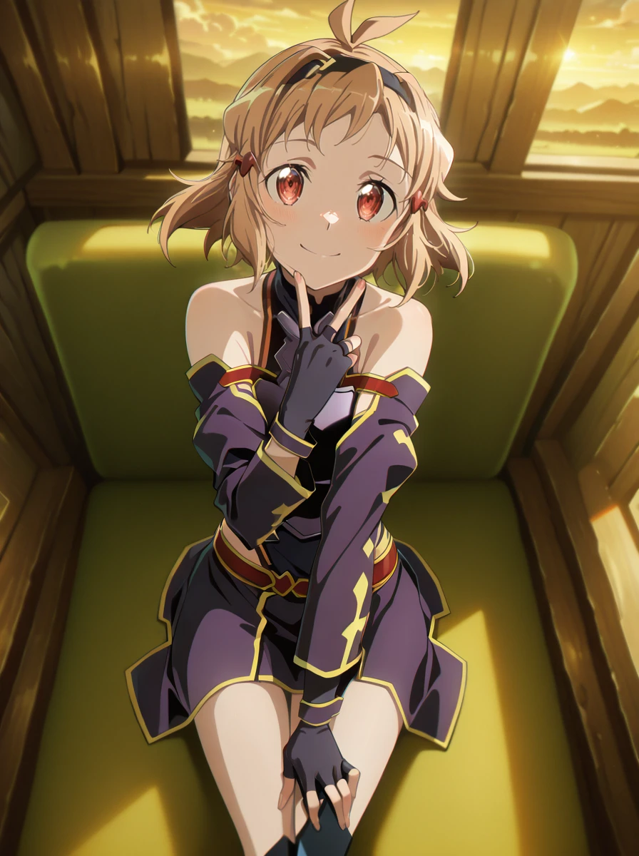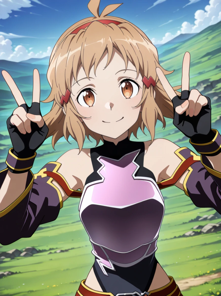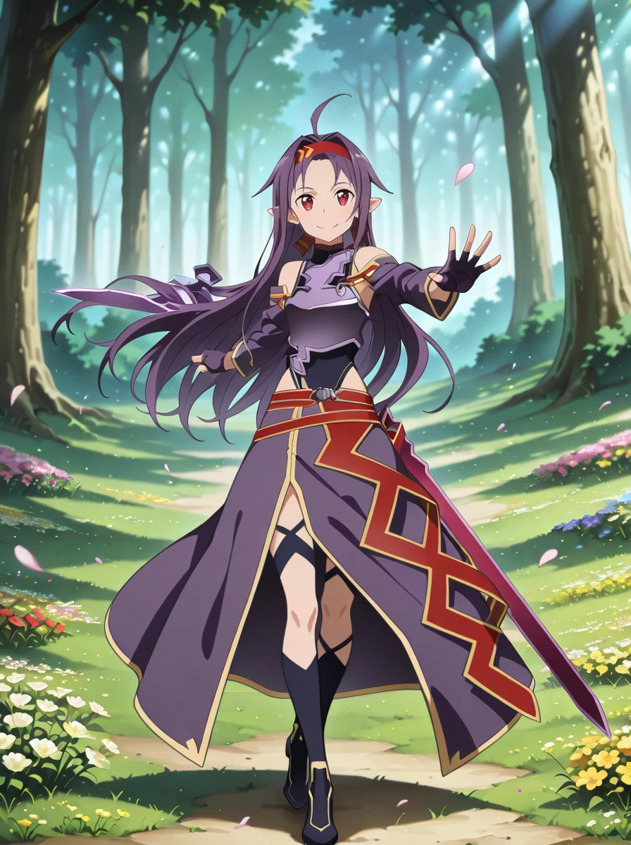 Prompts: 1girl, purple hair, long hair, red eyes, pointy ears, gloves, fingerless gloves, breastplate, armor, hairband, , detached sleeves, ahoge, red hairband