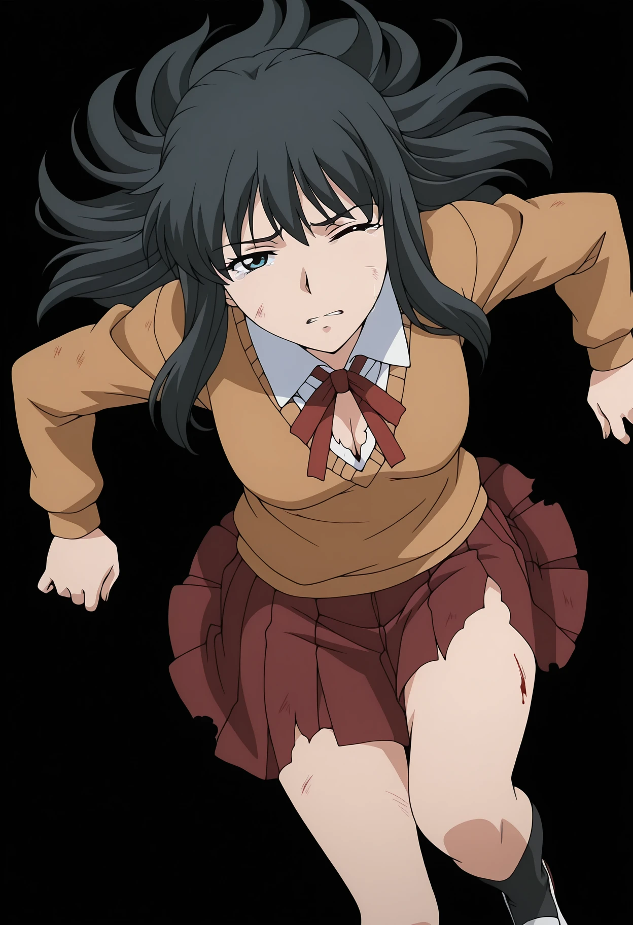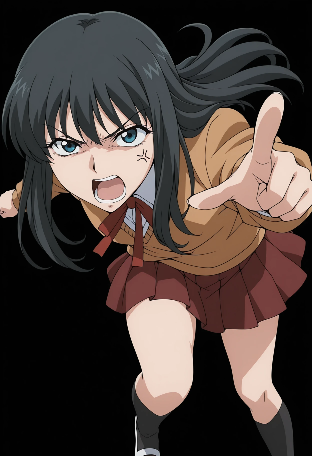 school uniform, neck ribbon, red ribbon, white shirt, collared shirt, sweater, long sleeves, red skirt, pleated skirt, black socks, kneehighs, uwabaki
