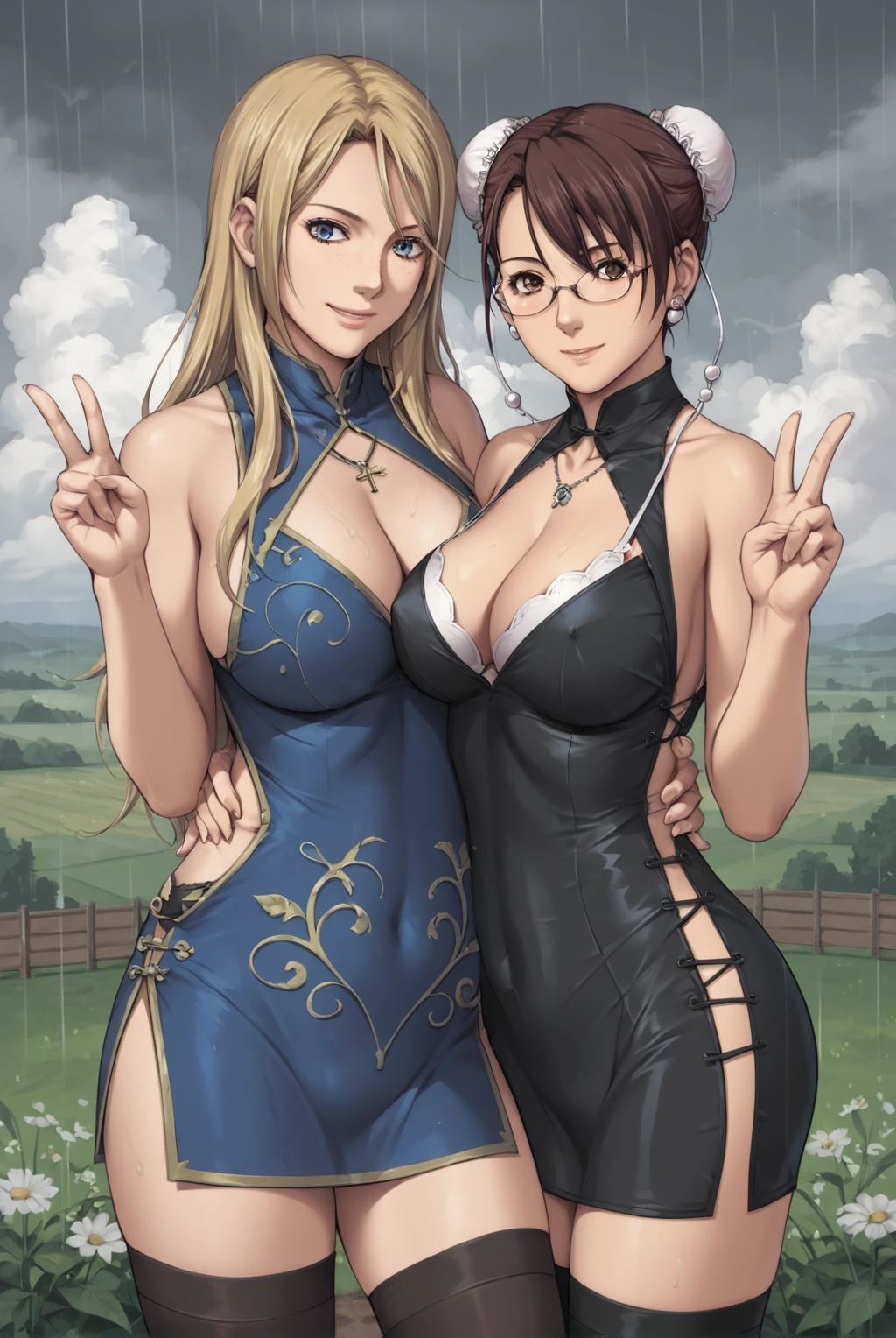 Yukari Kimijima, brown eyes, short hair, glasses, bun cover, double bun, hair between eyes, large breasts, cleavage, bare shoulders, earrings, sleeveless, white thighhighs, blue dress, short dress, china dress, curvy, side slit, bun cover, microdress