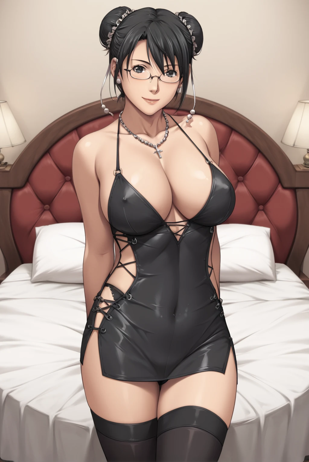 Francesca Maty, long hair, breasts, blue eyes, large breasts, blonde hair, cleavage, bare shoulders, black thighhighs, necklace, black dress, parted bangs, short dress, side slit, cross-laced clothes, sideless outfit, microdress, cross-laced slit