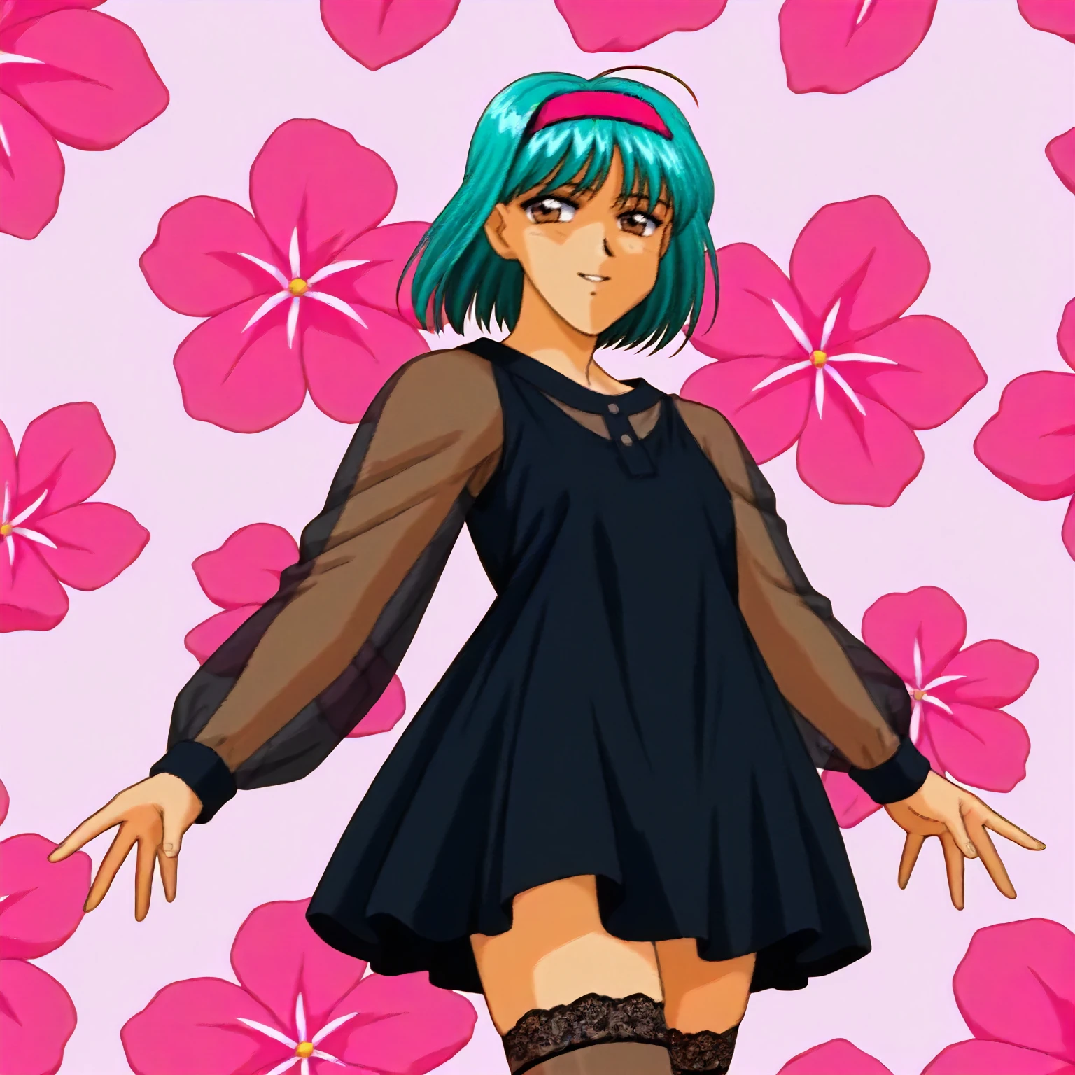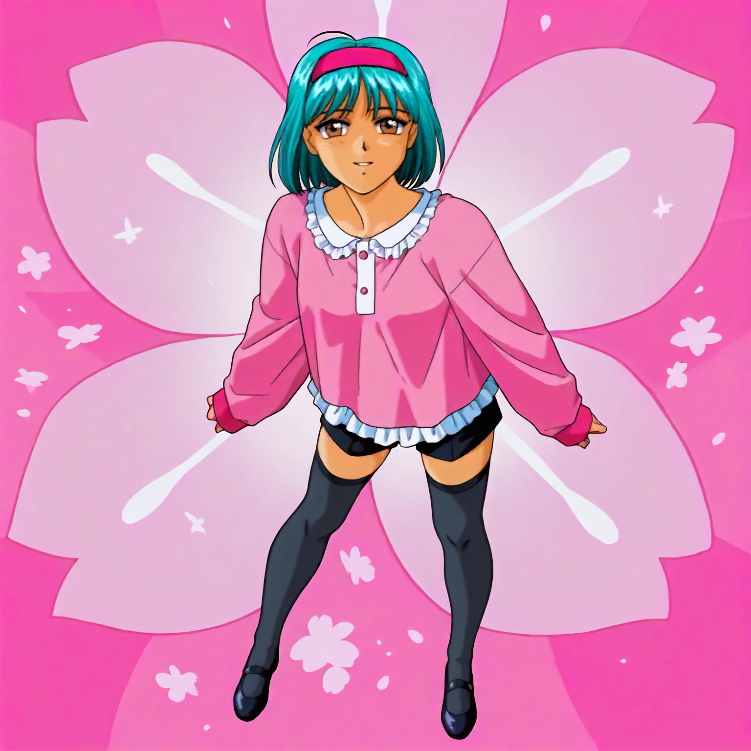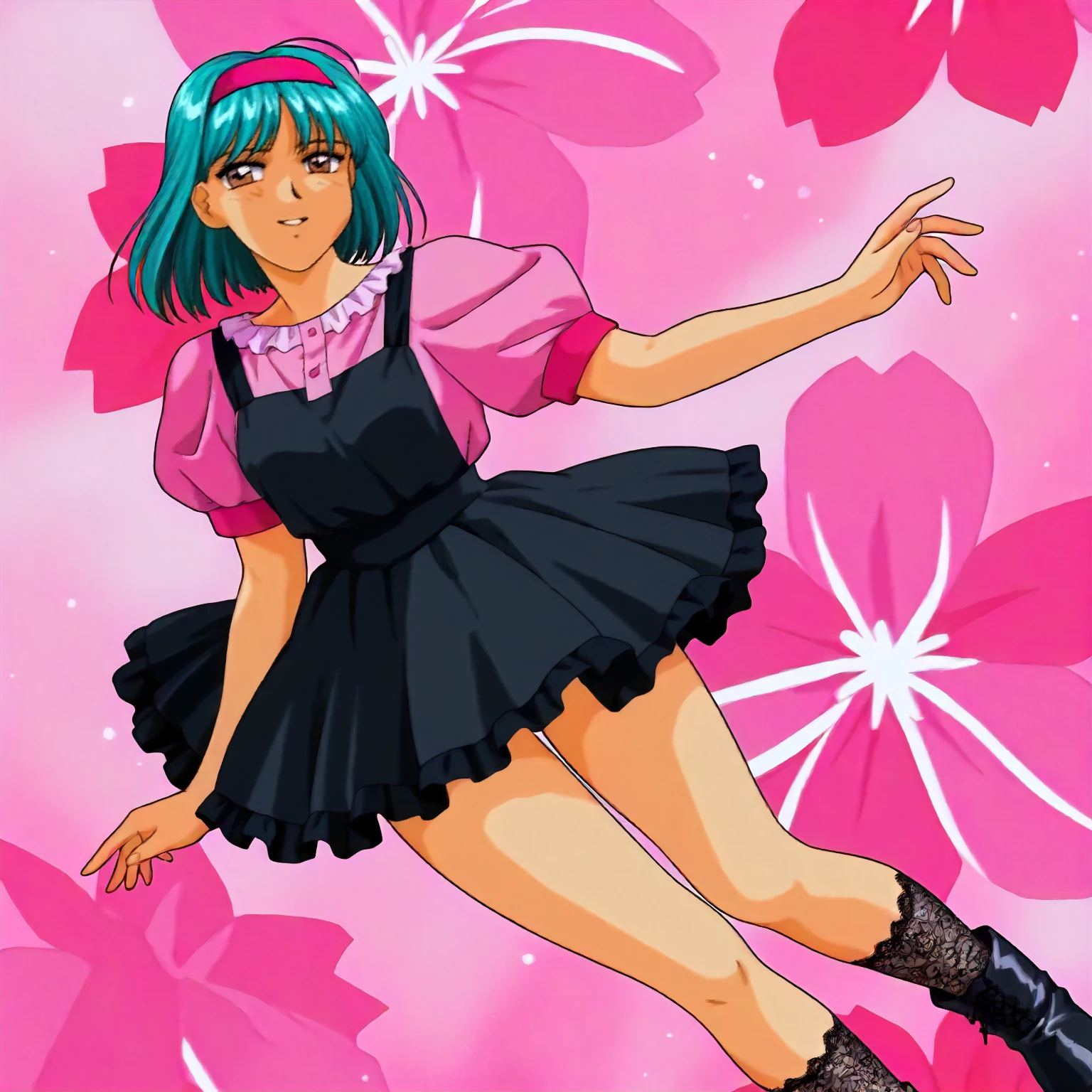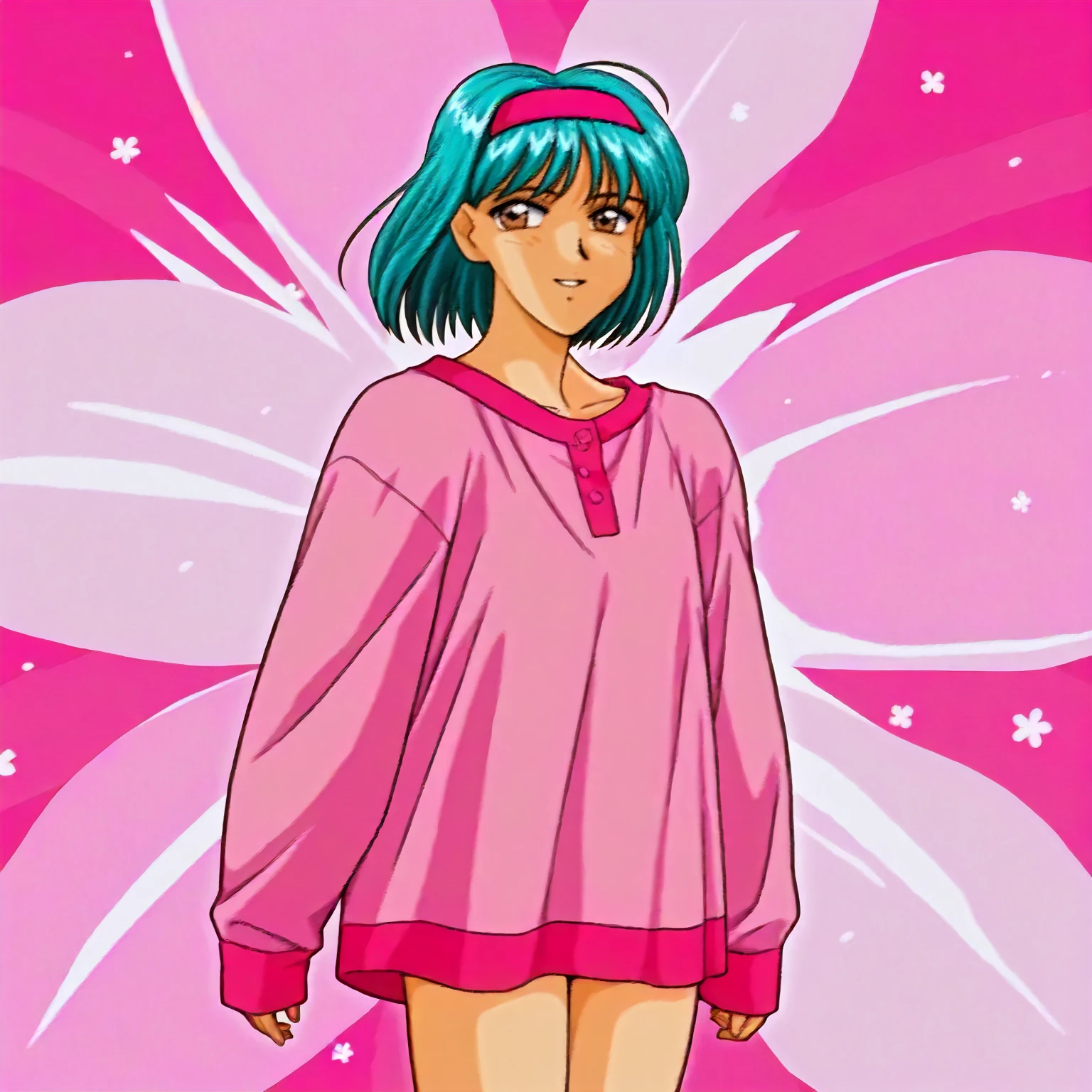 anime coloring,retro artstyle,1990s \(style\), jirai_onna\(tour_parrty\),1girl,aqua hair,short hair,pink_hairband,ahoge,brown eyes,