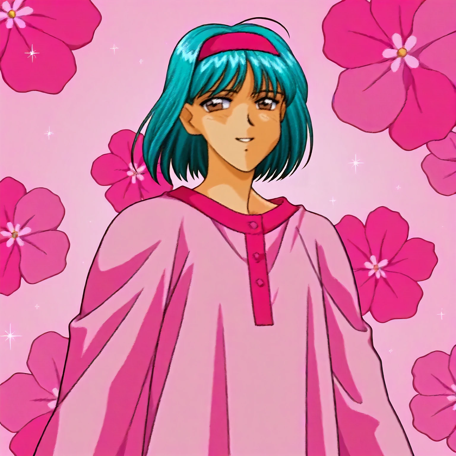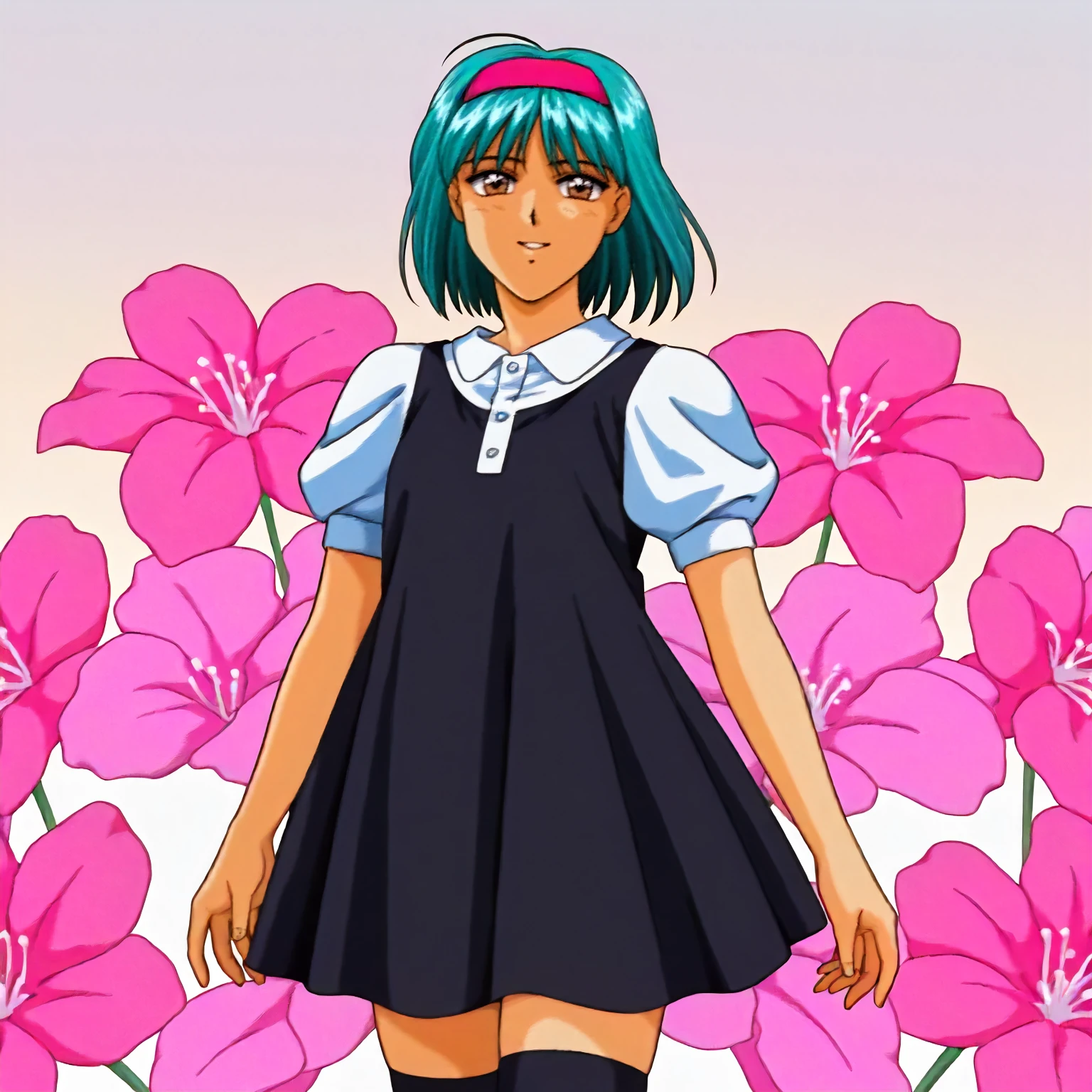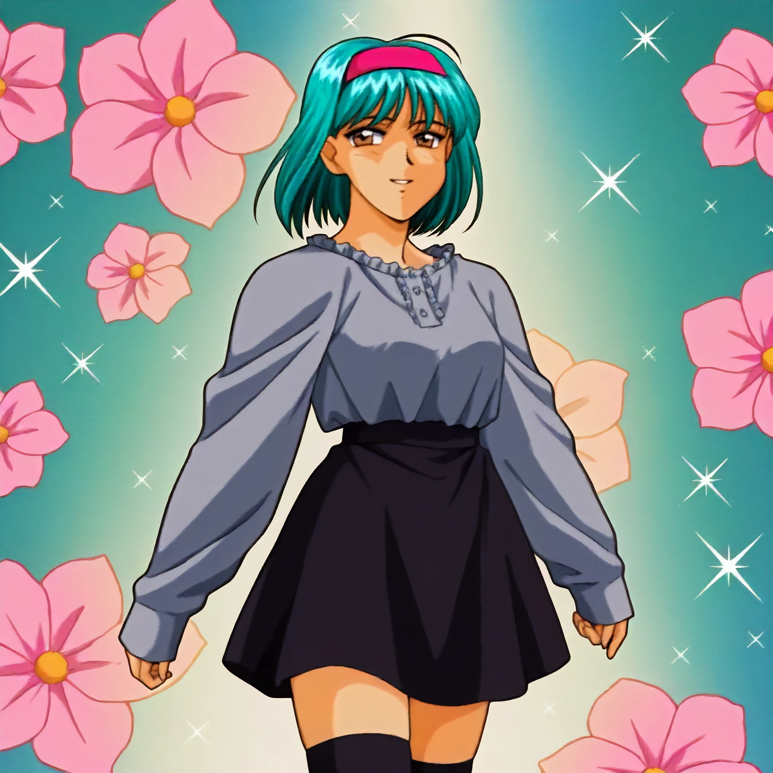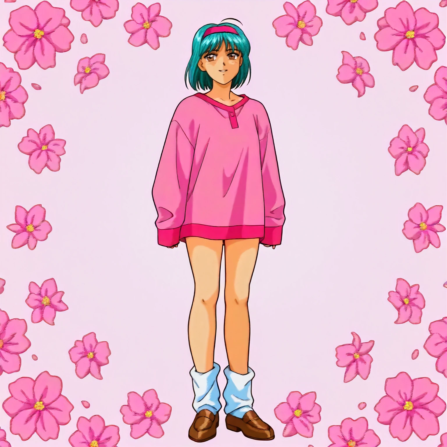 anime coloring,retro artstyle,1990s \(style\), jirai_onna\(tour_parrty\),1girl,aqua hair,short hair,pink_hairband,ahoge,brown eyes,