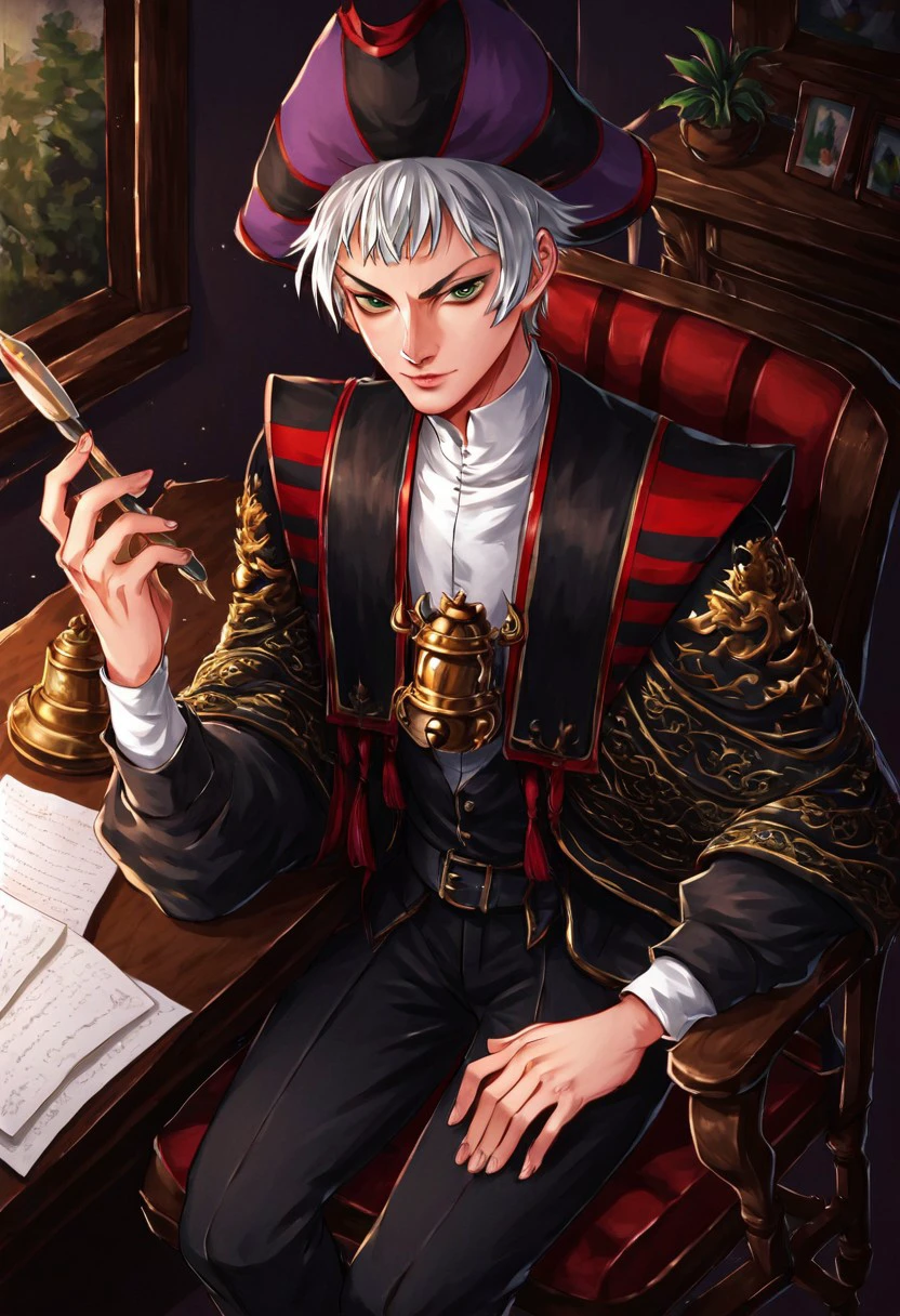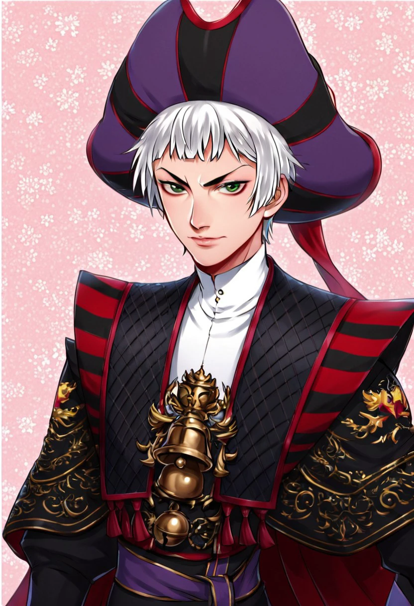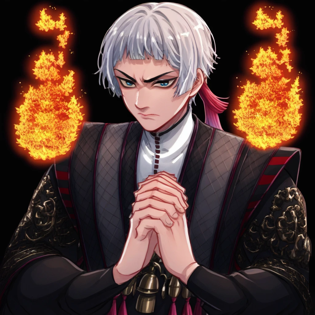 grey with streaks of white hair,choppy bangs,grey sideburns, heavy eye-bags,lips are thin and pale,sanpaku eyes,short hair