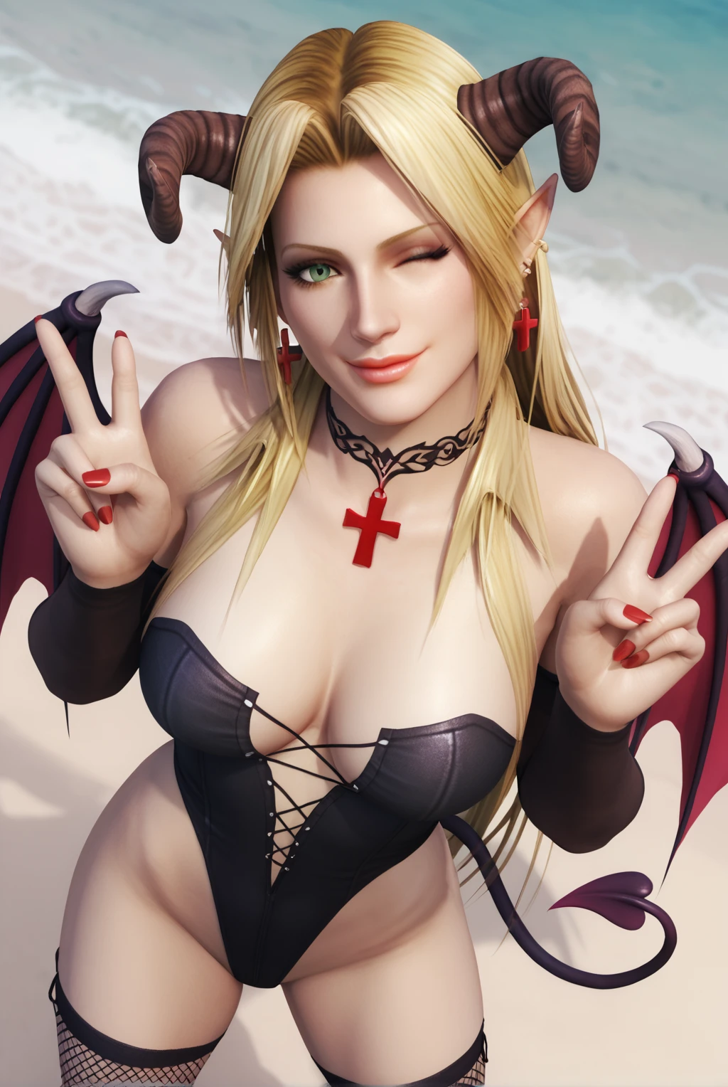 earrings, detached sleeves, choker, pointy ears, elbow gloves, black thighhighs, demon girl, bat wings, demon horns, fishnets, demon tail, black leotard, highleg leotard, demon wings, fishnet thighhighs, demon girl outfit, cross-laced one-piece swimsuit, cross-laced
