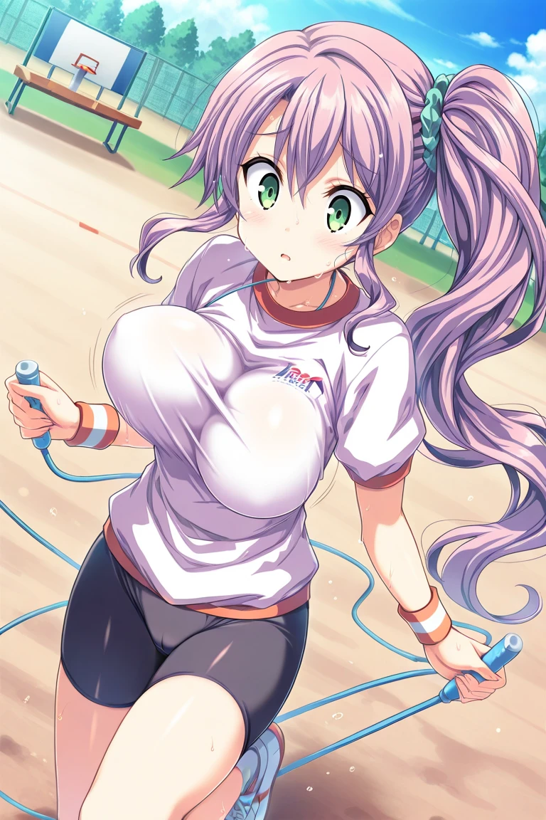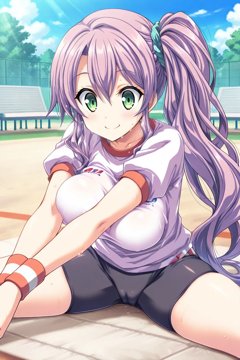 gym outfit, white shirt, wristband, bike shorts, black shorts, side ponytail,