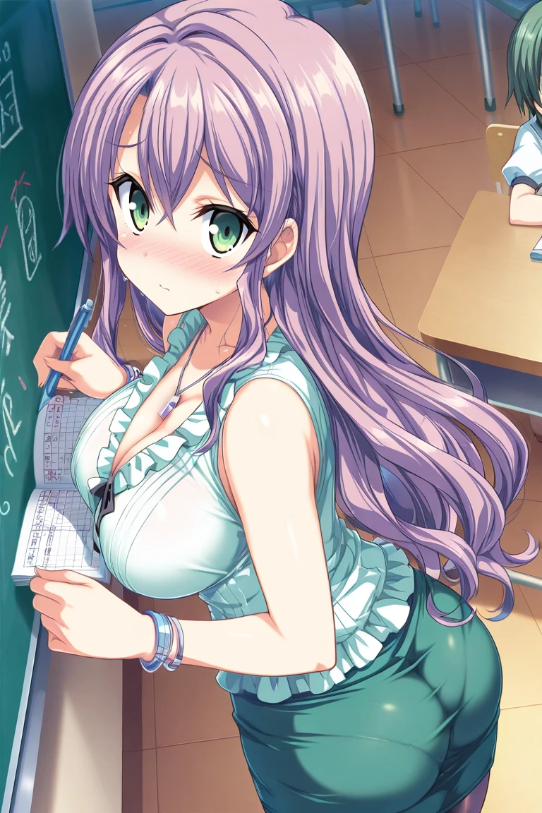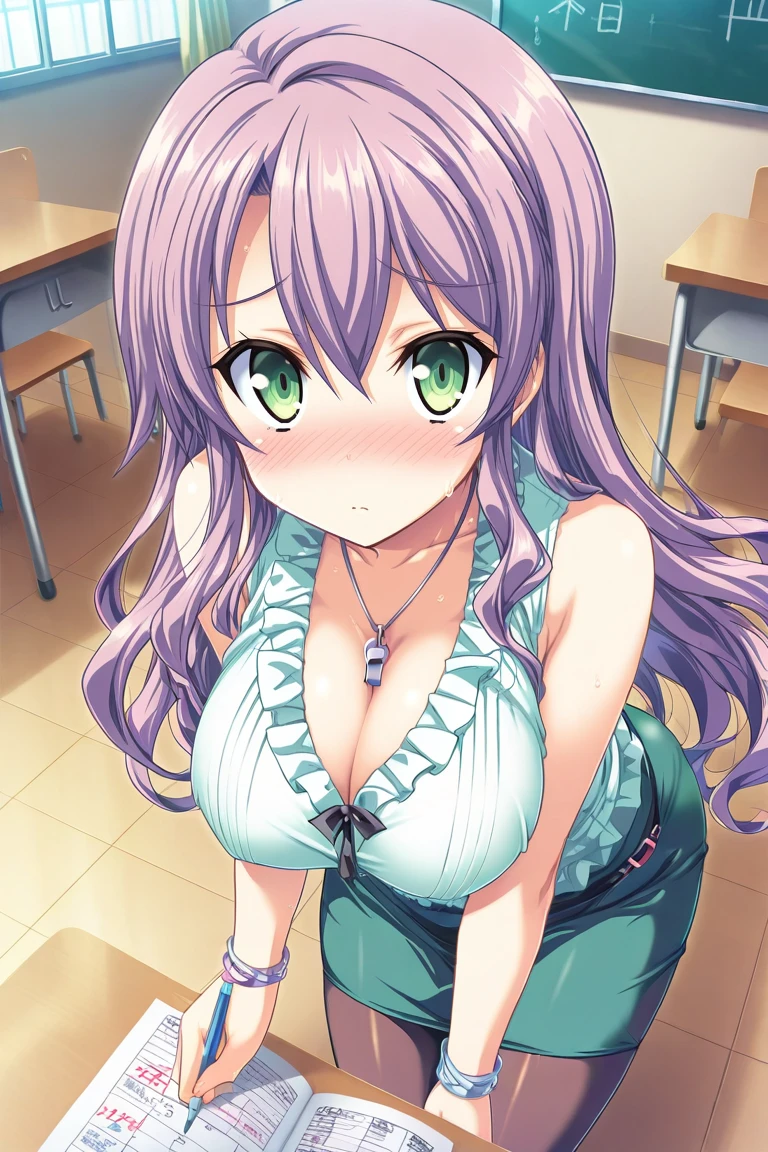 default outfit, white shirt, ruffled shirt, sleeveless, cleavage, whistle necklace, bracelet, green skirt, pencil skirt, pantyhose,