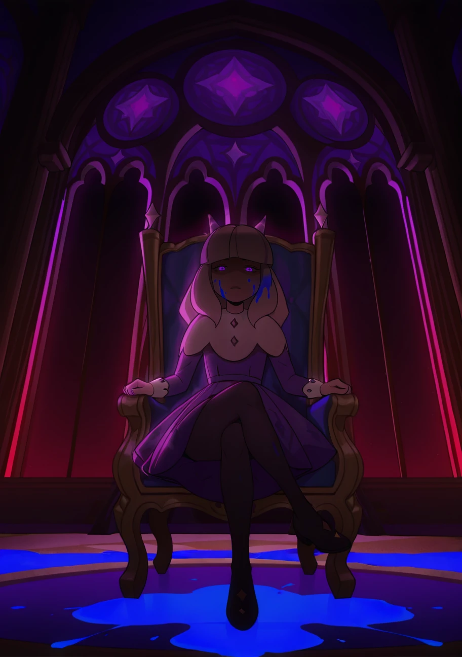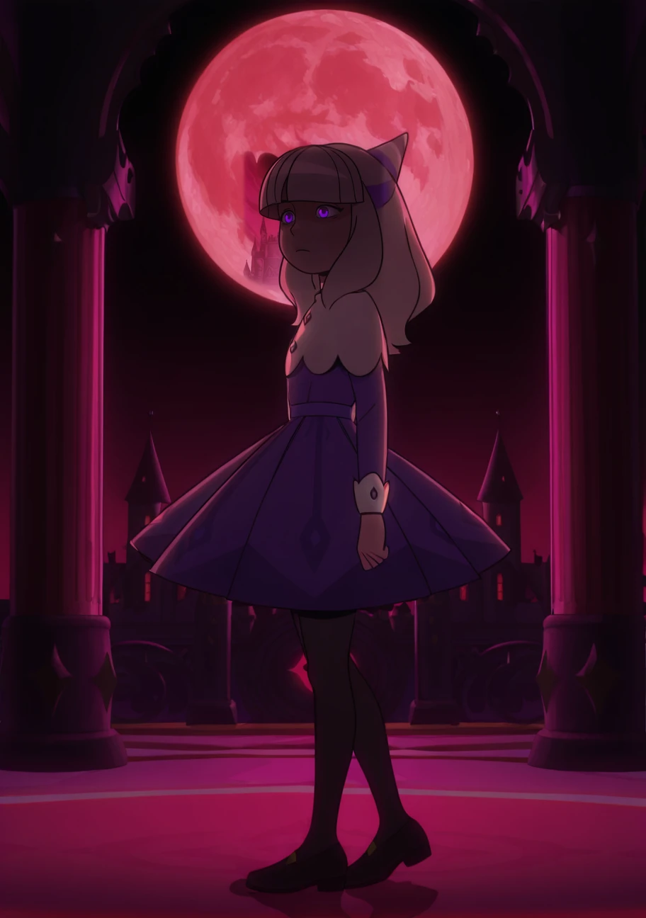 olivia_park_illus, dress, purple dress, bangs, pantyhose, purple eyes, blunt bangs, long sleeves, black pantyhose, horns,