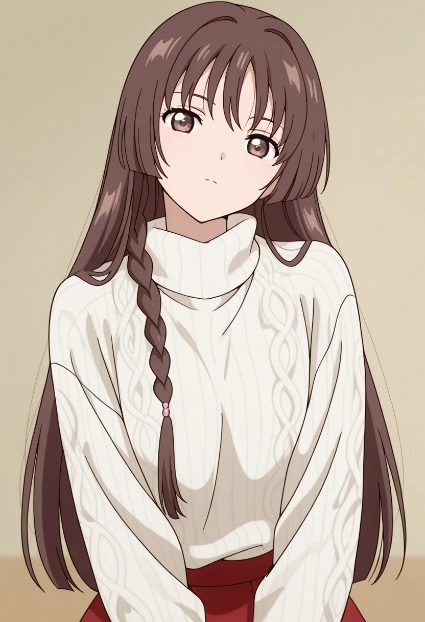 Pour générer leur tenue de clear card - nakuru akizuki \(cardcaptor sakura\), long hair, brown hair, braided sidelock, brown eyes, white sweater, turtleneck, long sleeves, red skirt