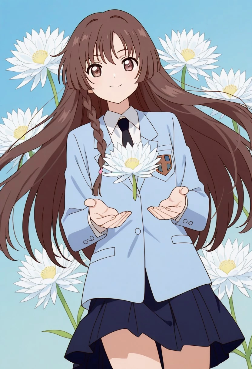 Pour générer leur tenue d'uniforme scolaire d'hiver - nakuru akizuki \(cardcaptor sakura\), long hair, brown hair, braided sidelock, brown eyes, white shirt, black necktie, pastel blue blazer, long sleeves, dark blue skirt, blue knee-high socks, black loafer