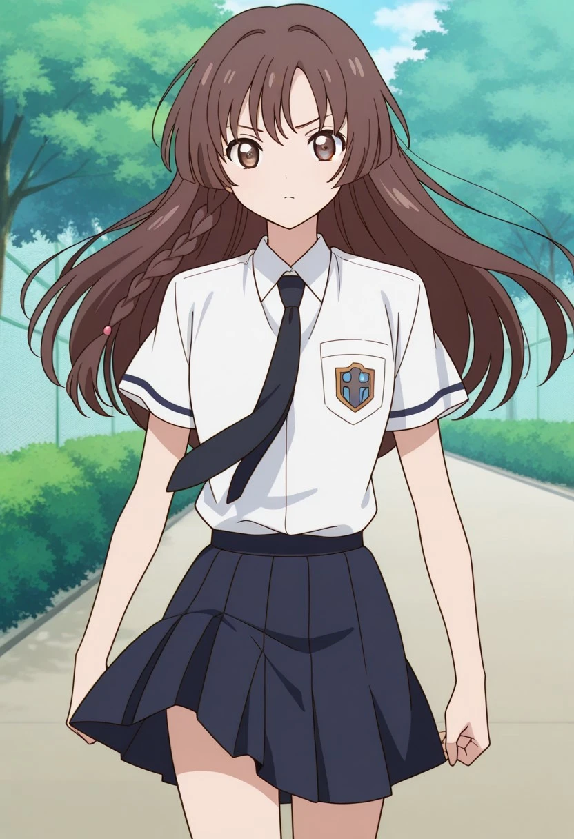 Pour générer leur tenue d'uniforme scolaire d'été - nakuru akizuki \(cardcaptor sakura\), long hair, brown hair, braided sidelock, brown eyes, white shirt, black necktie, short sleeves, dark blue skirt, blue knee-high socks, black loafer