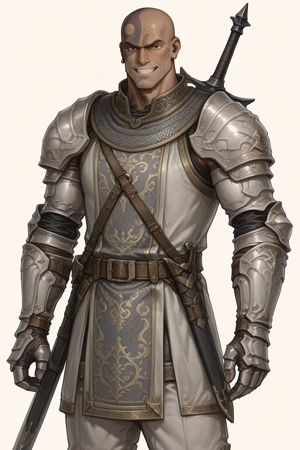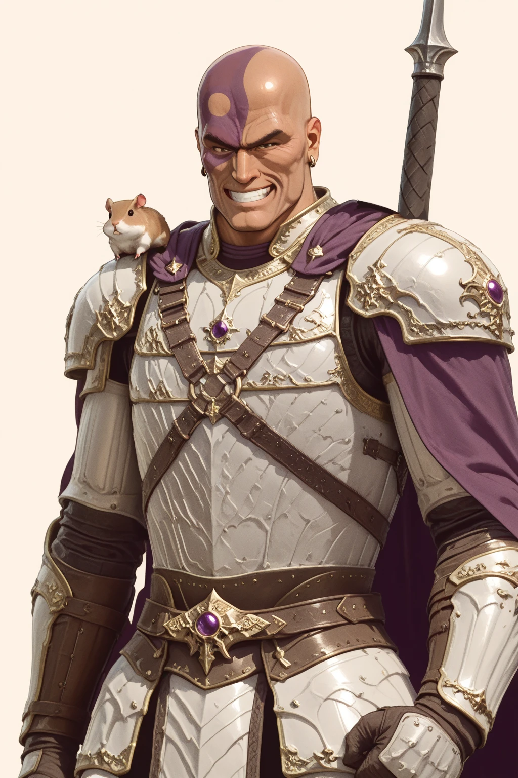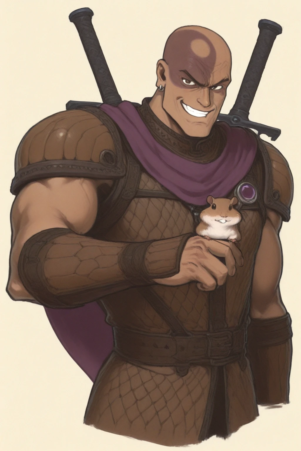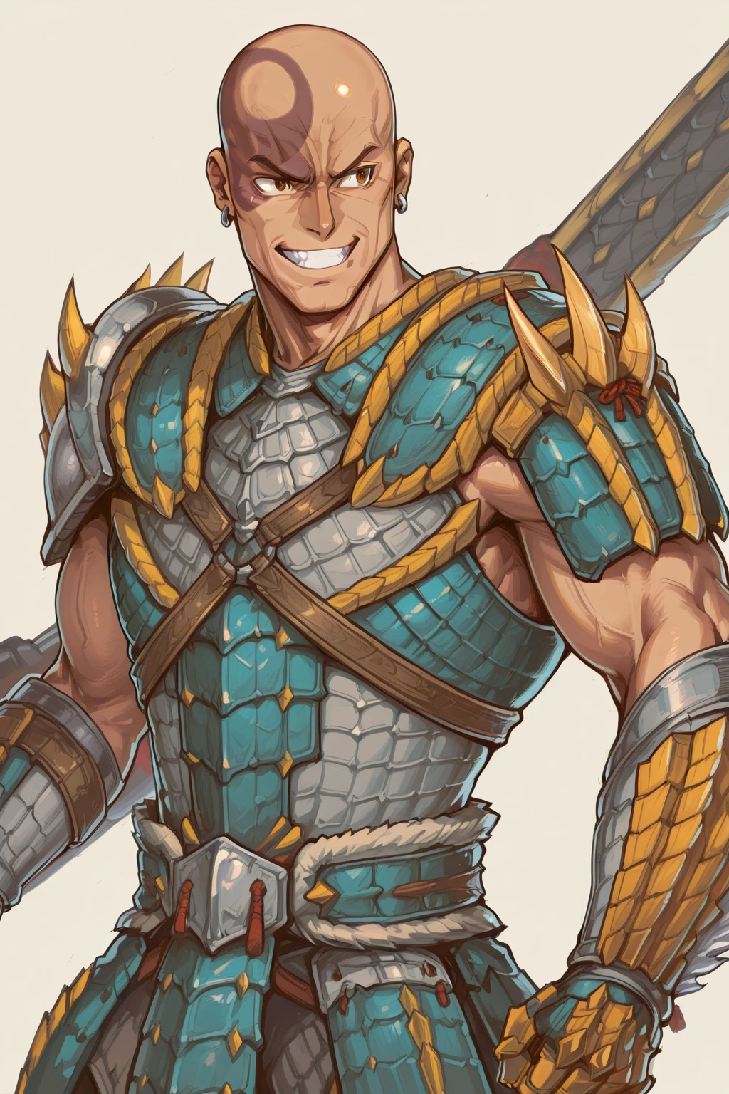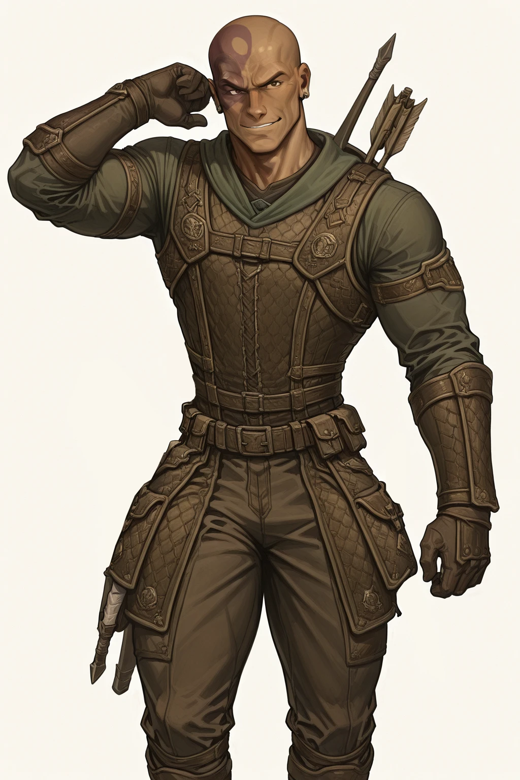 bgminsc, 1boy, male focus, muscular, bald, facial tattoo, manly, brown eyes, earrings, dark brown leather armor, pauldrons, harness, arm guards, pants, boots, weapon on back,