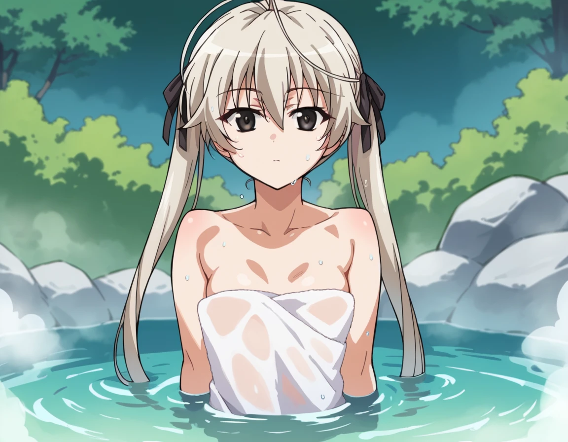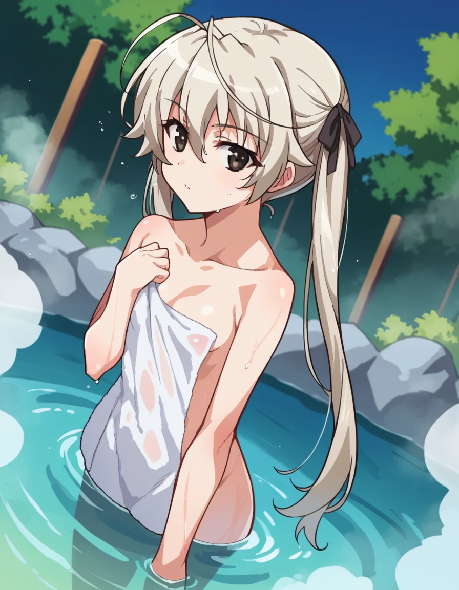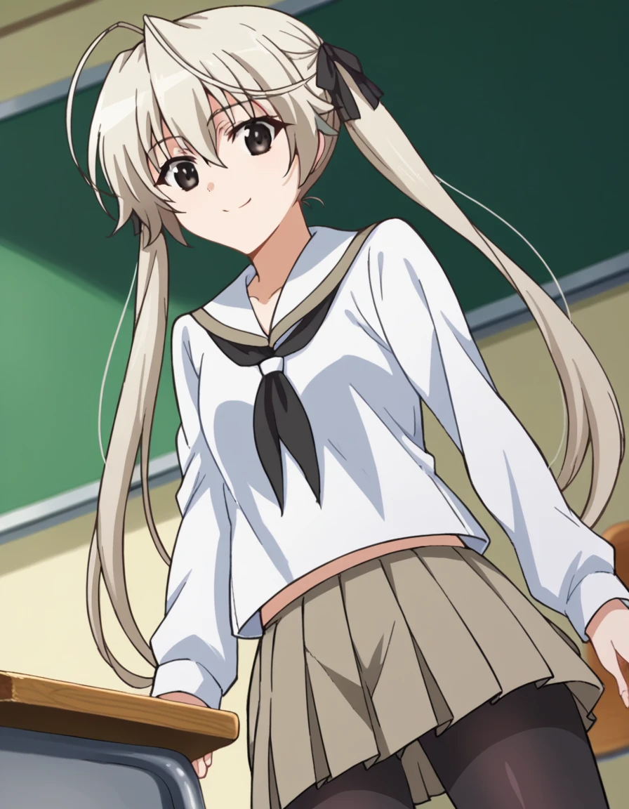 sora kasugano, ahoge, black eyes, hair between eyes, hair ribbon, long hair, twintails, black ribbon, white hair,