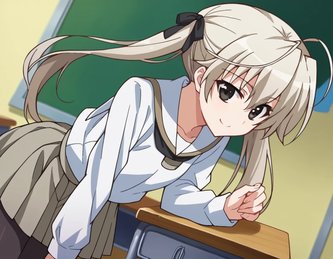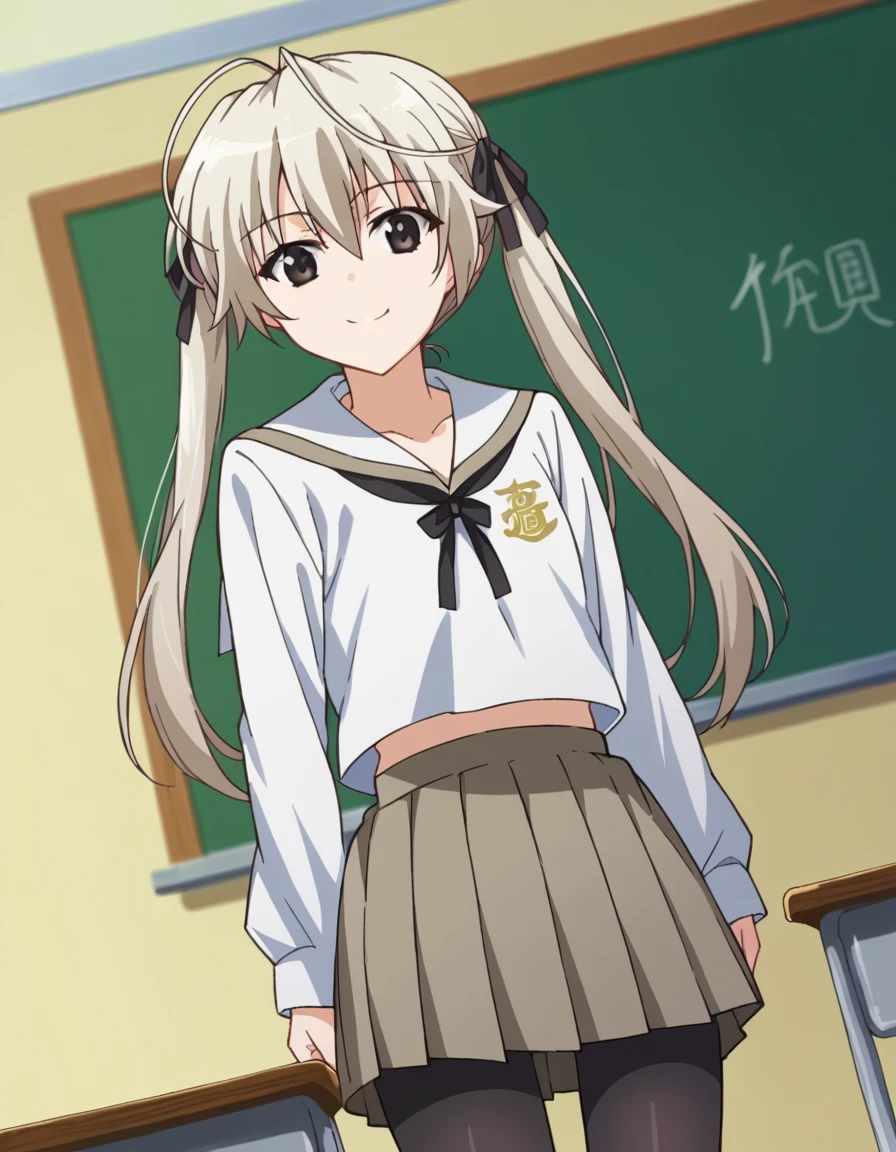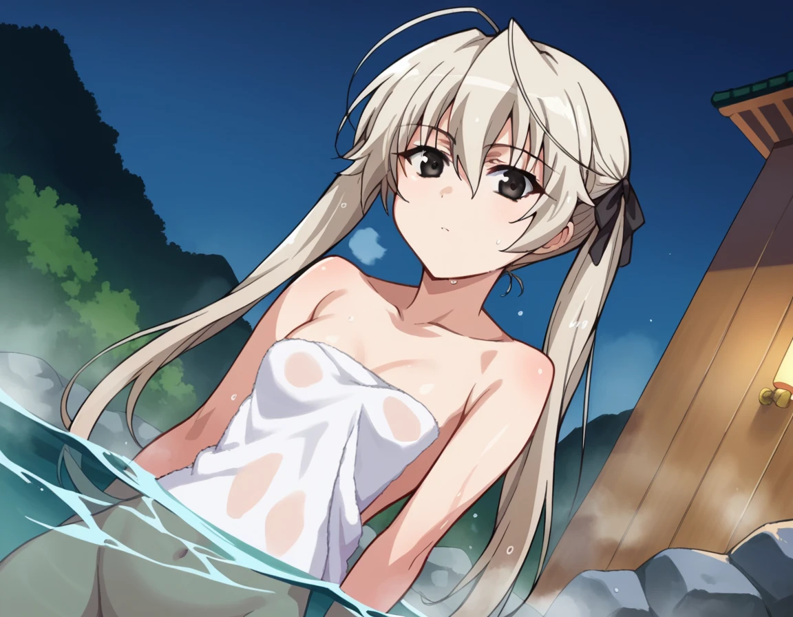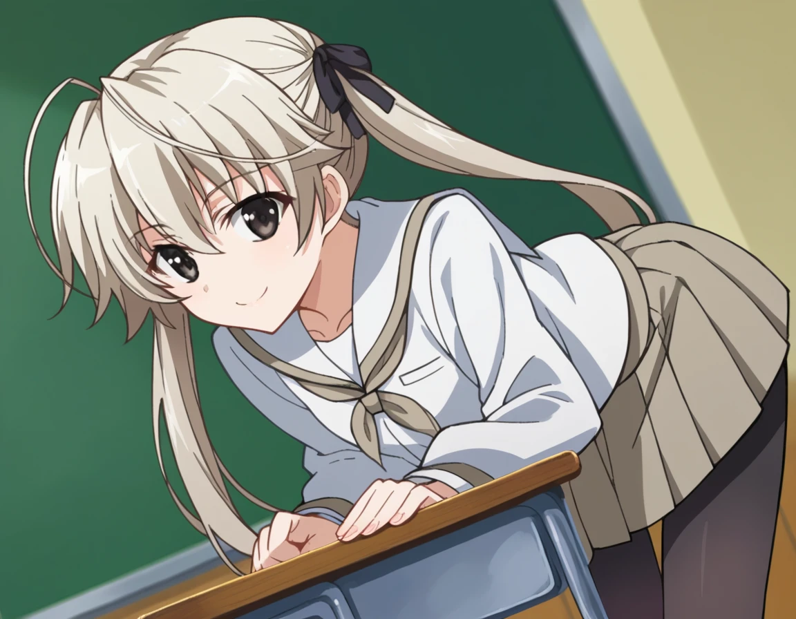 sora kasugano, ahoge, black eyes, hair between eyes, hair ribbon, long hair, twintails, black ribbon, white hair,