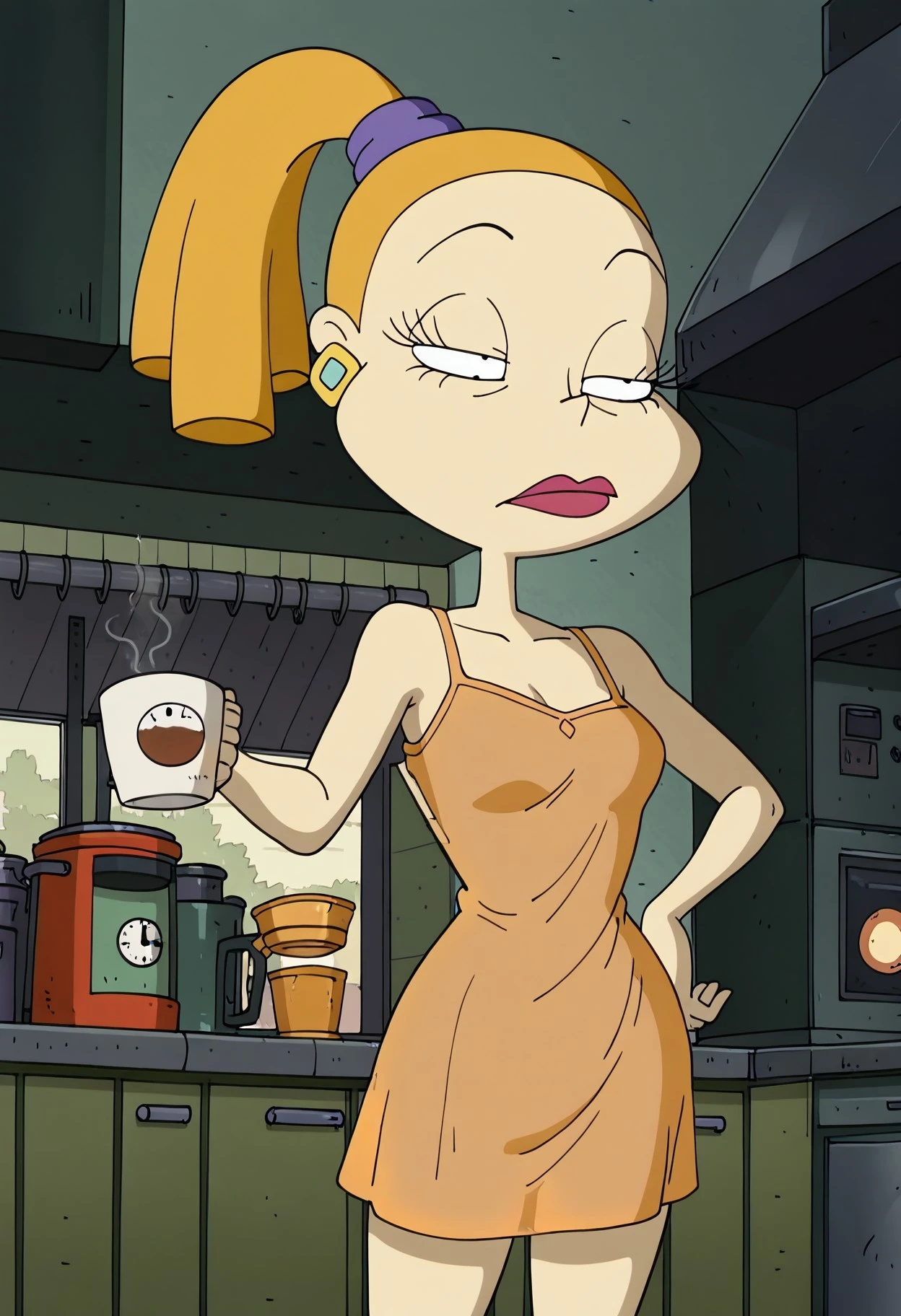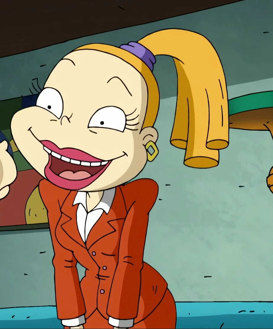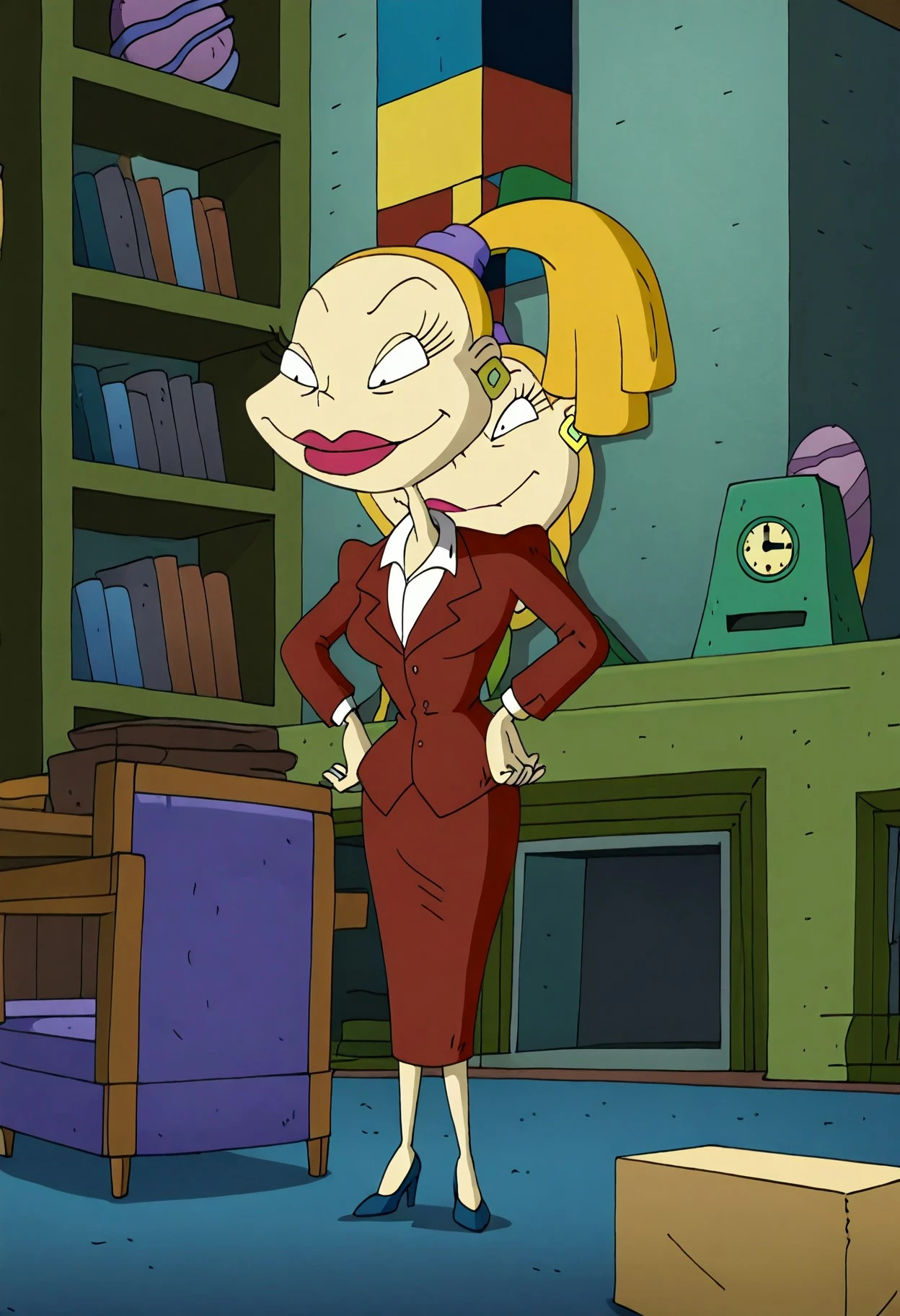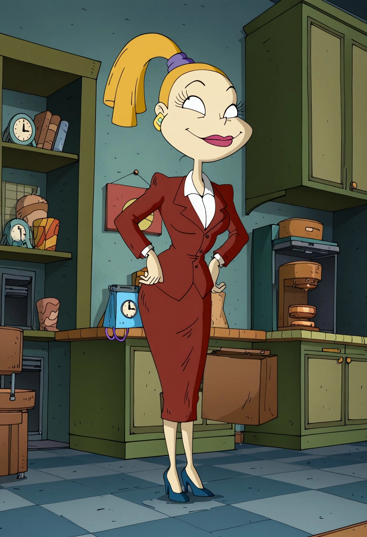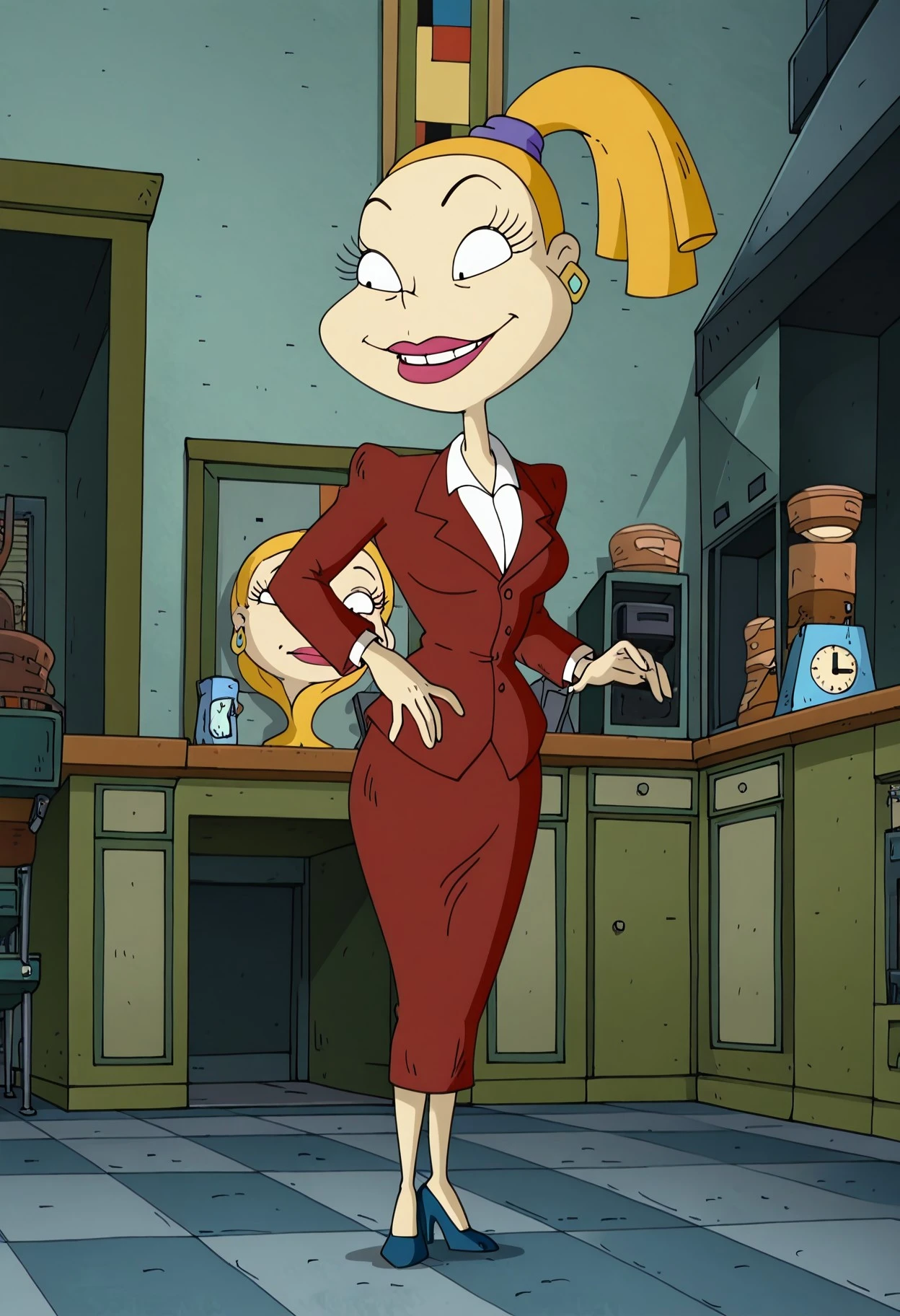 Charlotte Pickles, 1woman, blonde hair in a ponytail, purple hair tie, gold earring, burgundy suit with skirt, white undershirt, blue high heels