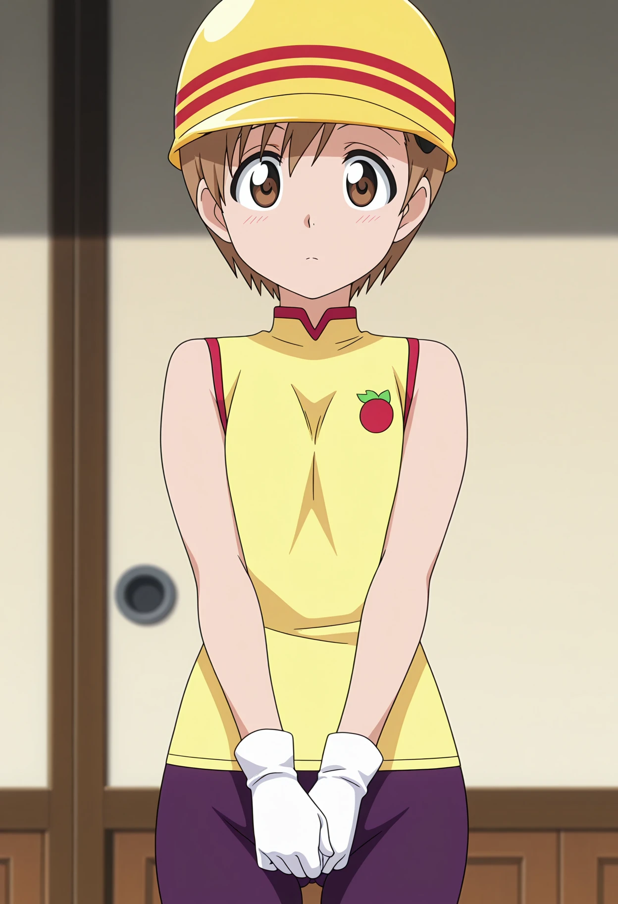 yellow helmet, sleeveless shirt, yellow shirt, purple bike shorts, white gloves