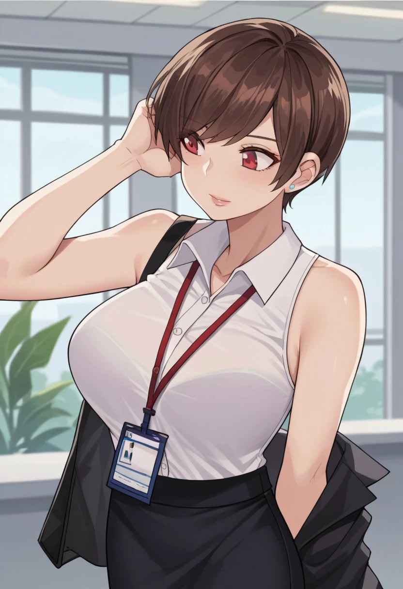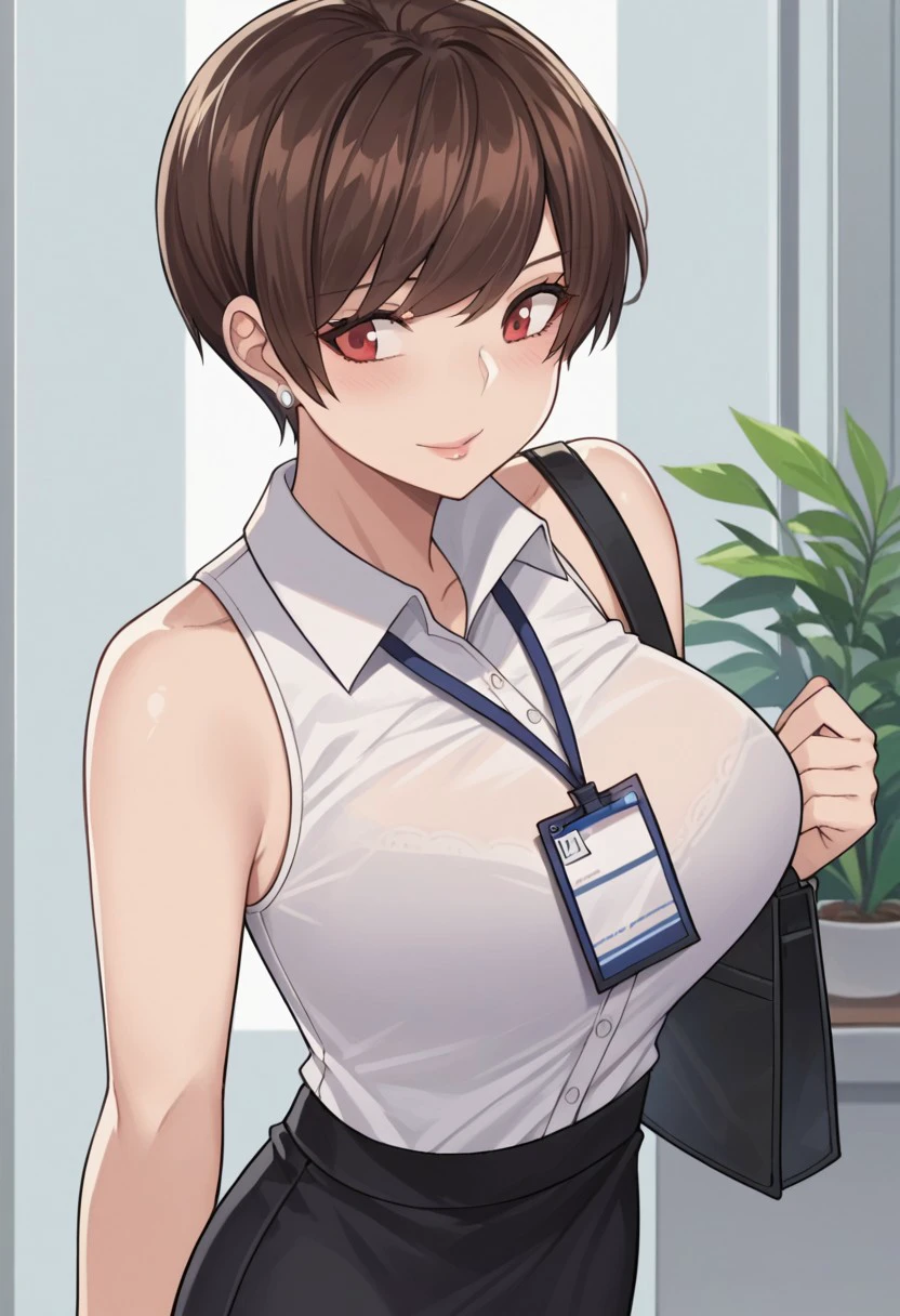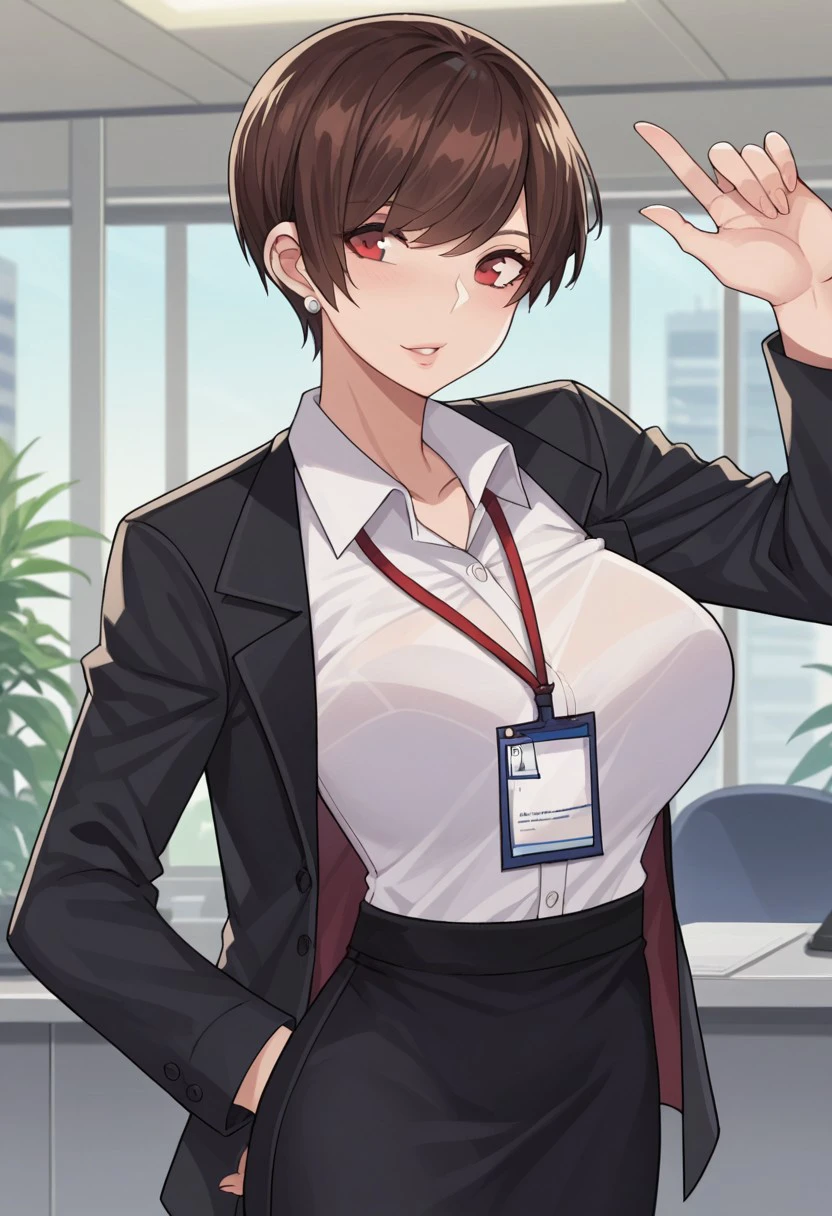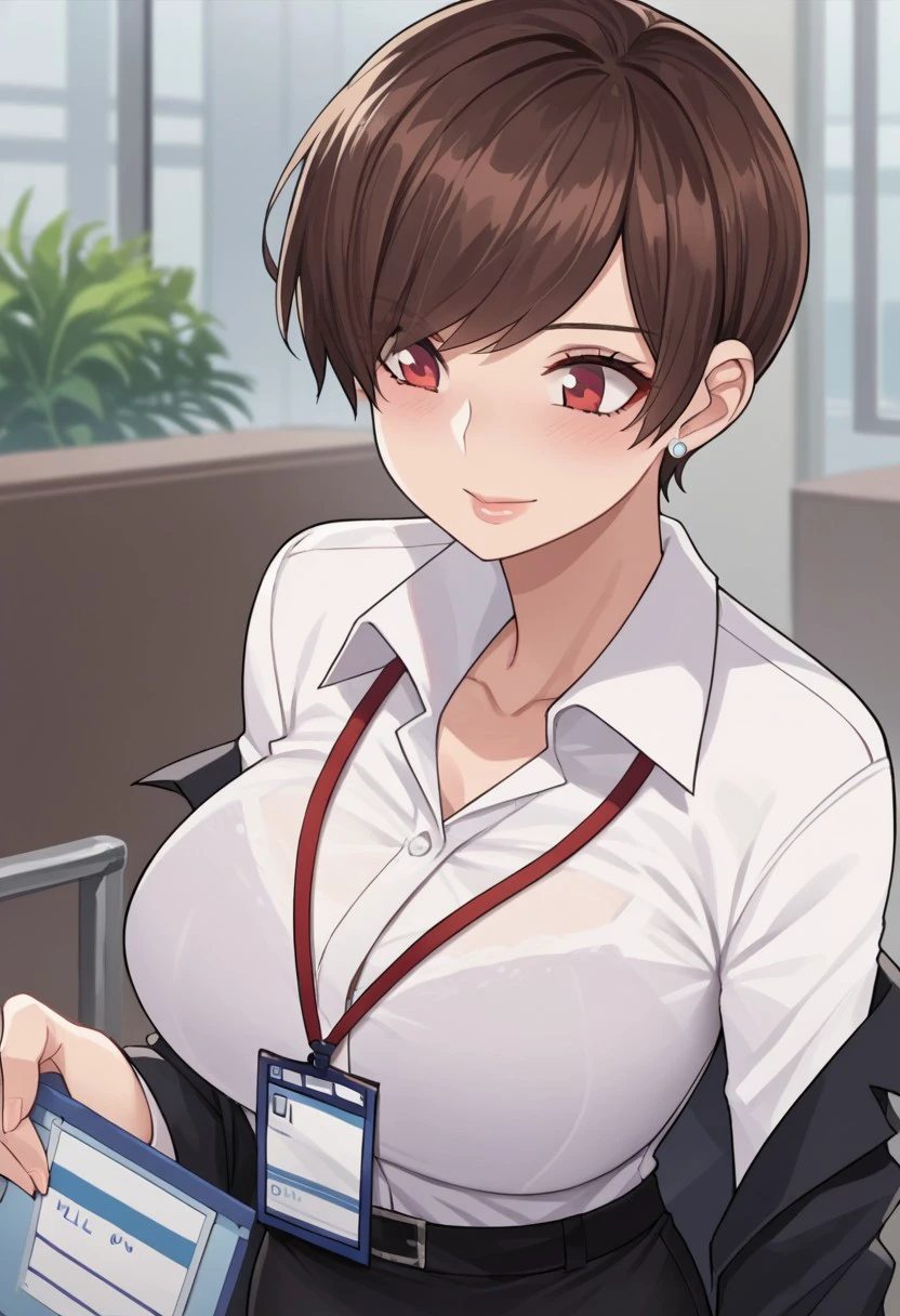 Base4 : olive laurentia, 1girl, short hair, brown hair, red eyes, large breasts, hair over one eye,