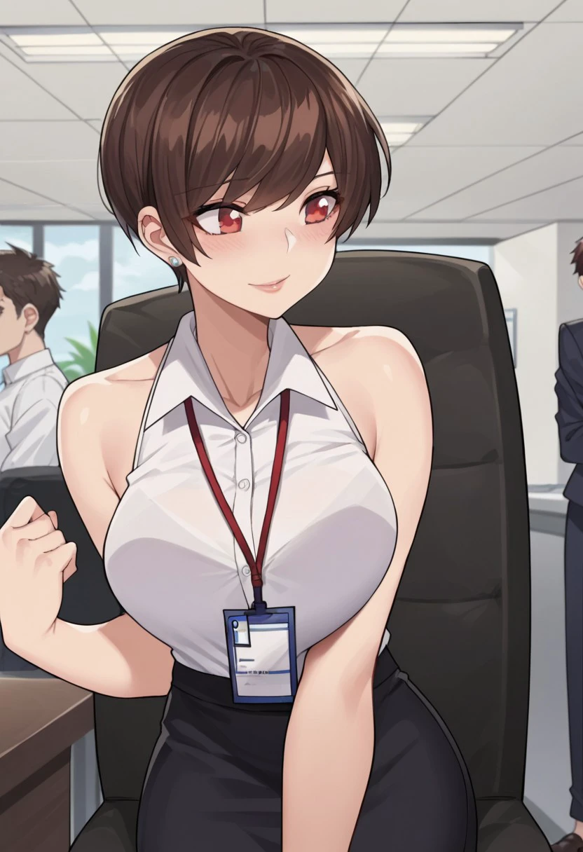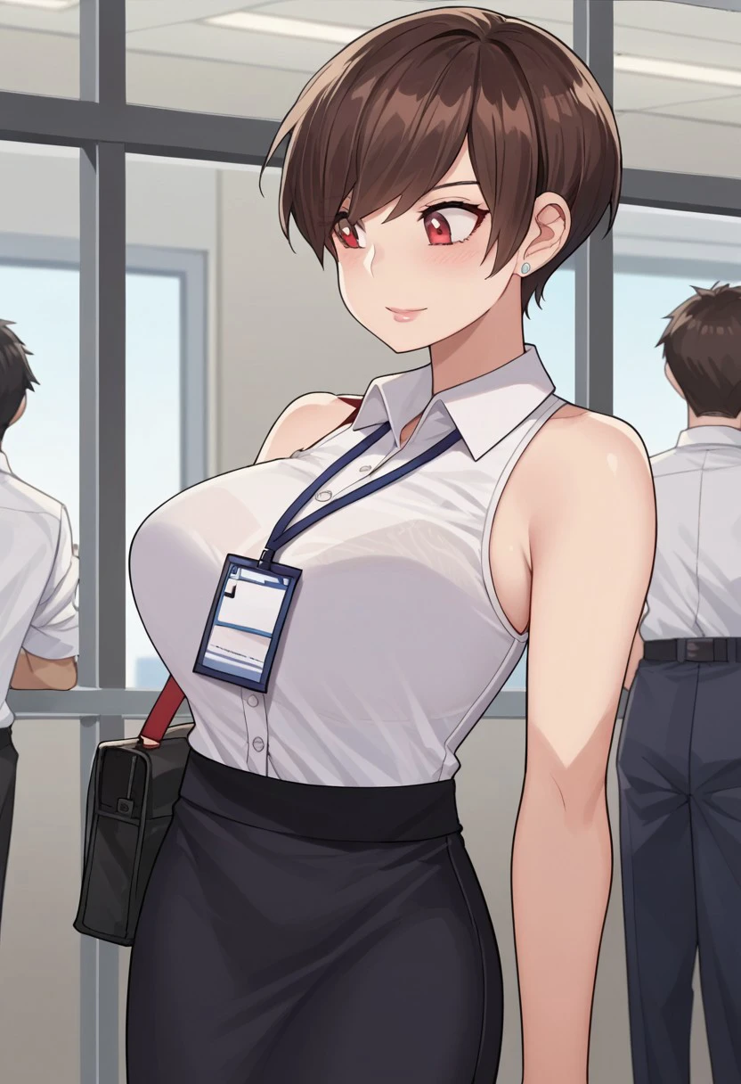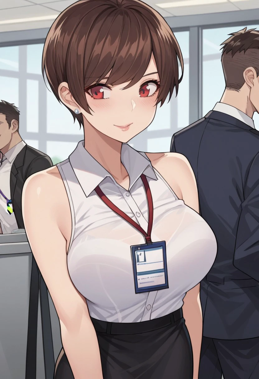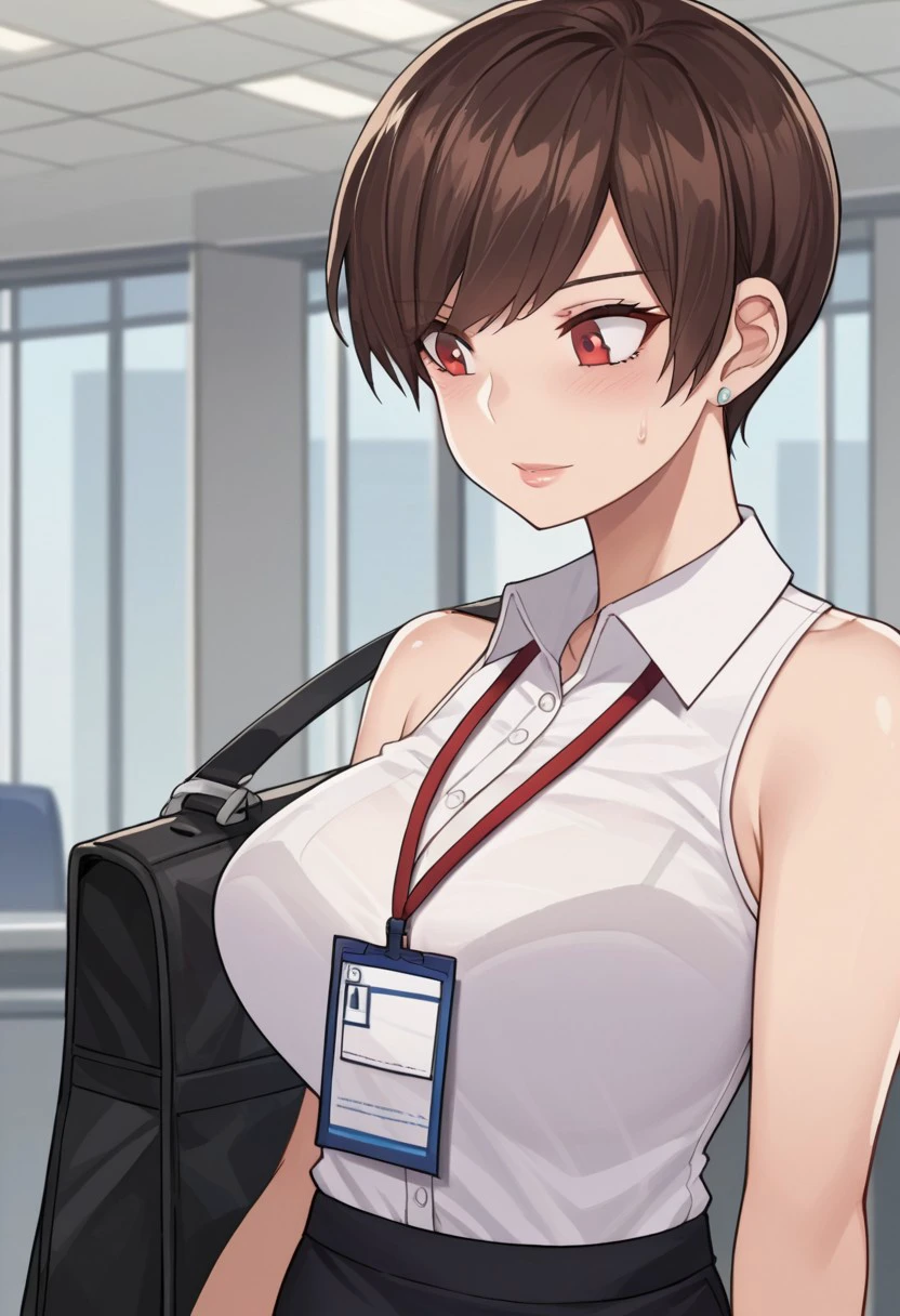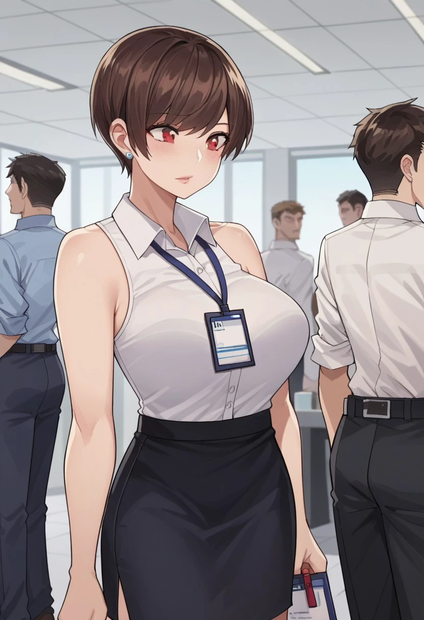 Base4 : olive laurentia, 1girl, short hair, brown hair, red eyes, large breasts, hair over one eye,