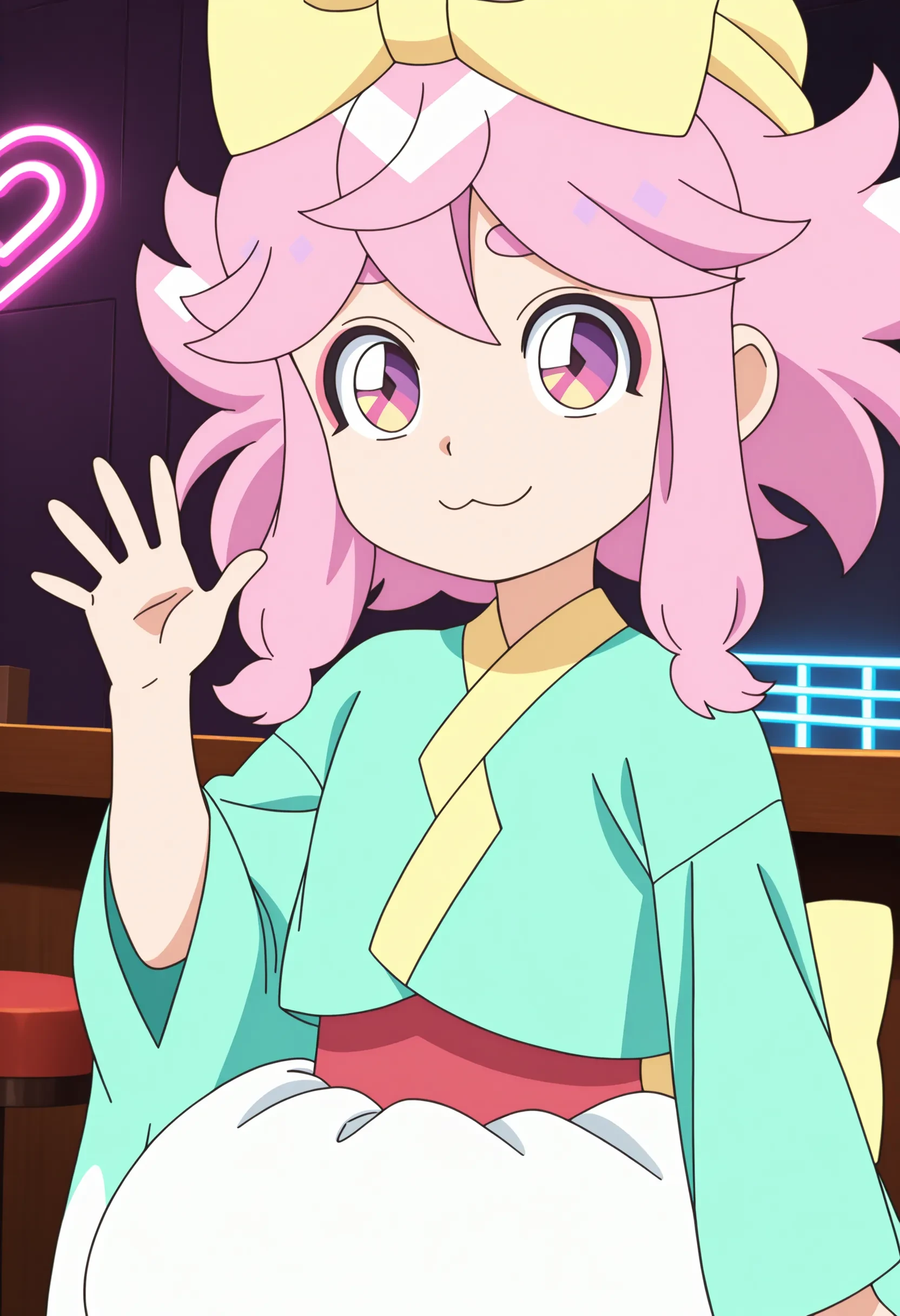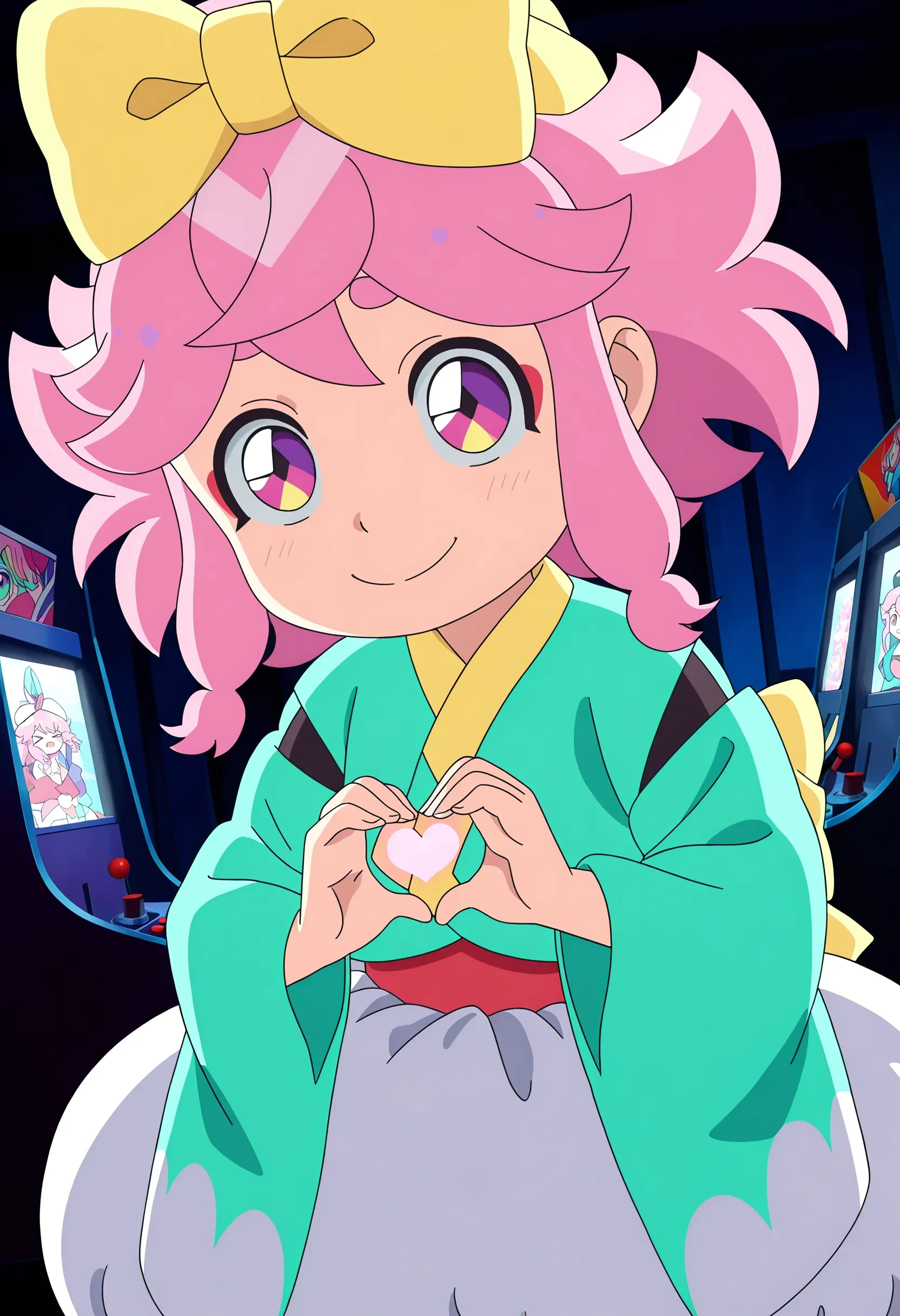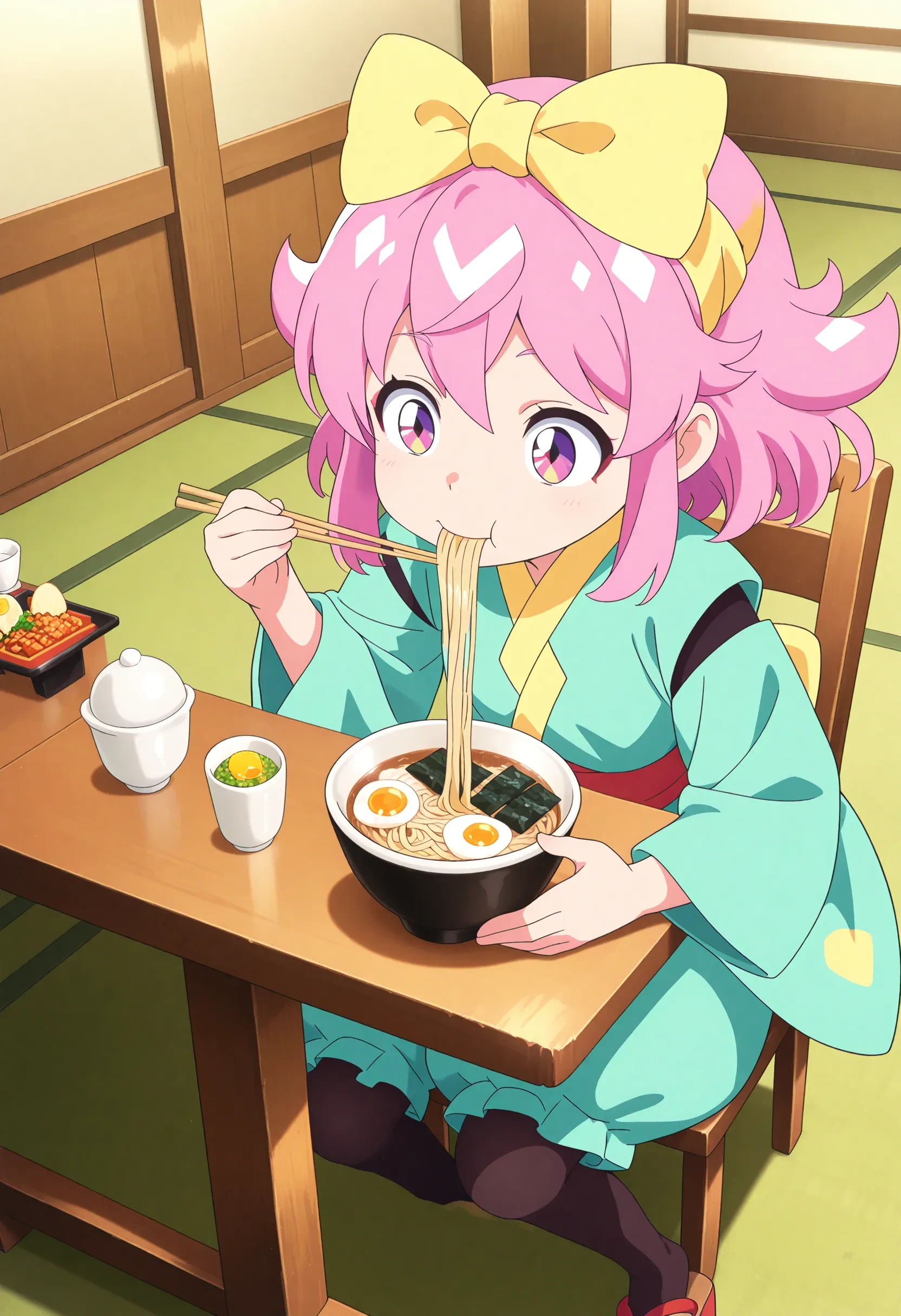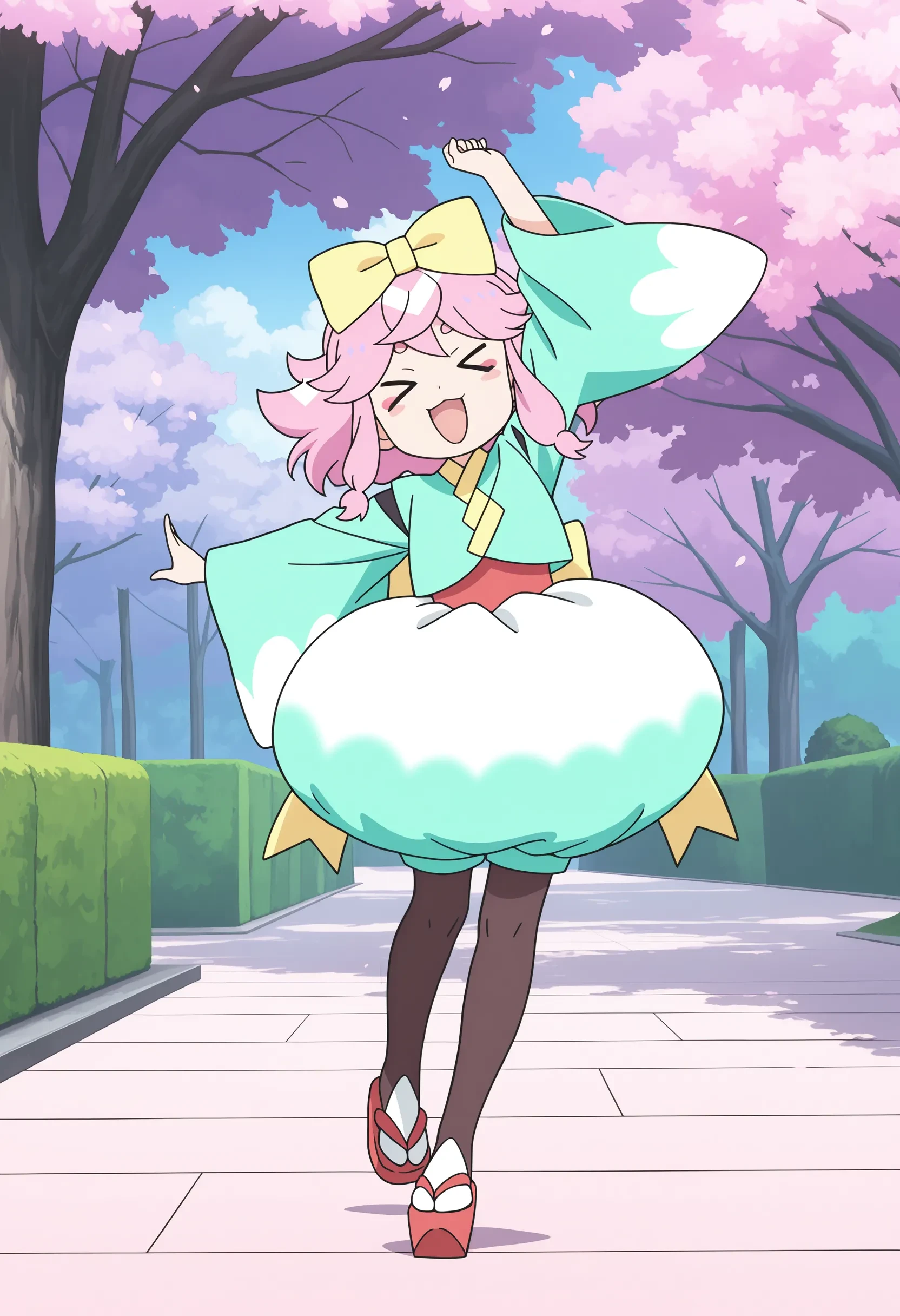 maro, pink hair, medium hair, purple eyes, multicolored eyes, hikimayu, hat ribbon, makeup, aqua kimono, red obi, puffy shorts, back ribbon, pantyhose, red geta,