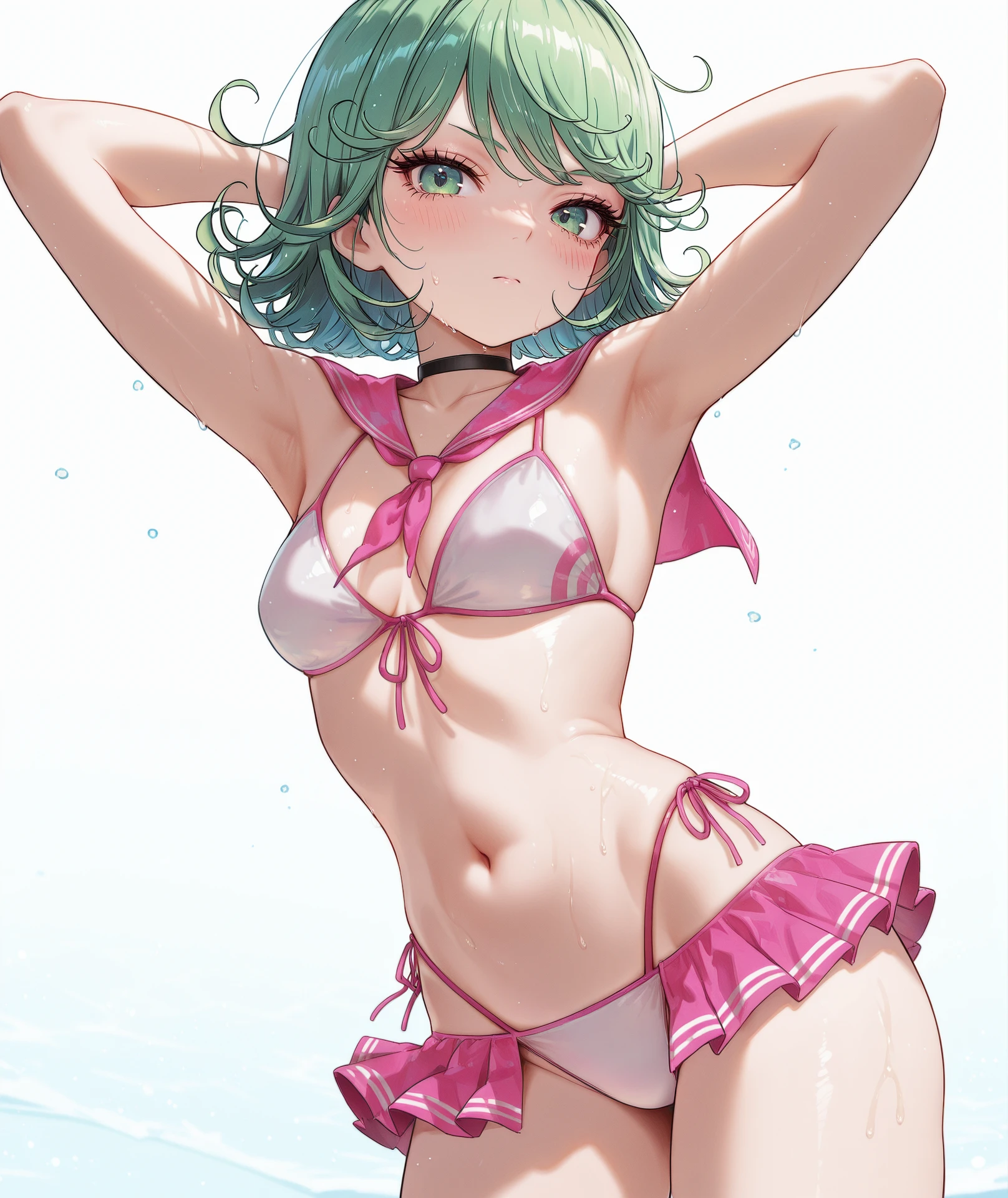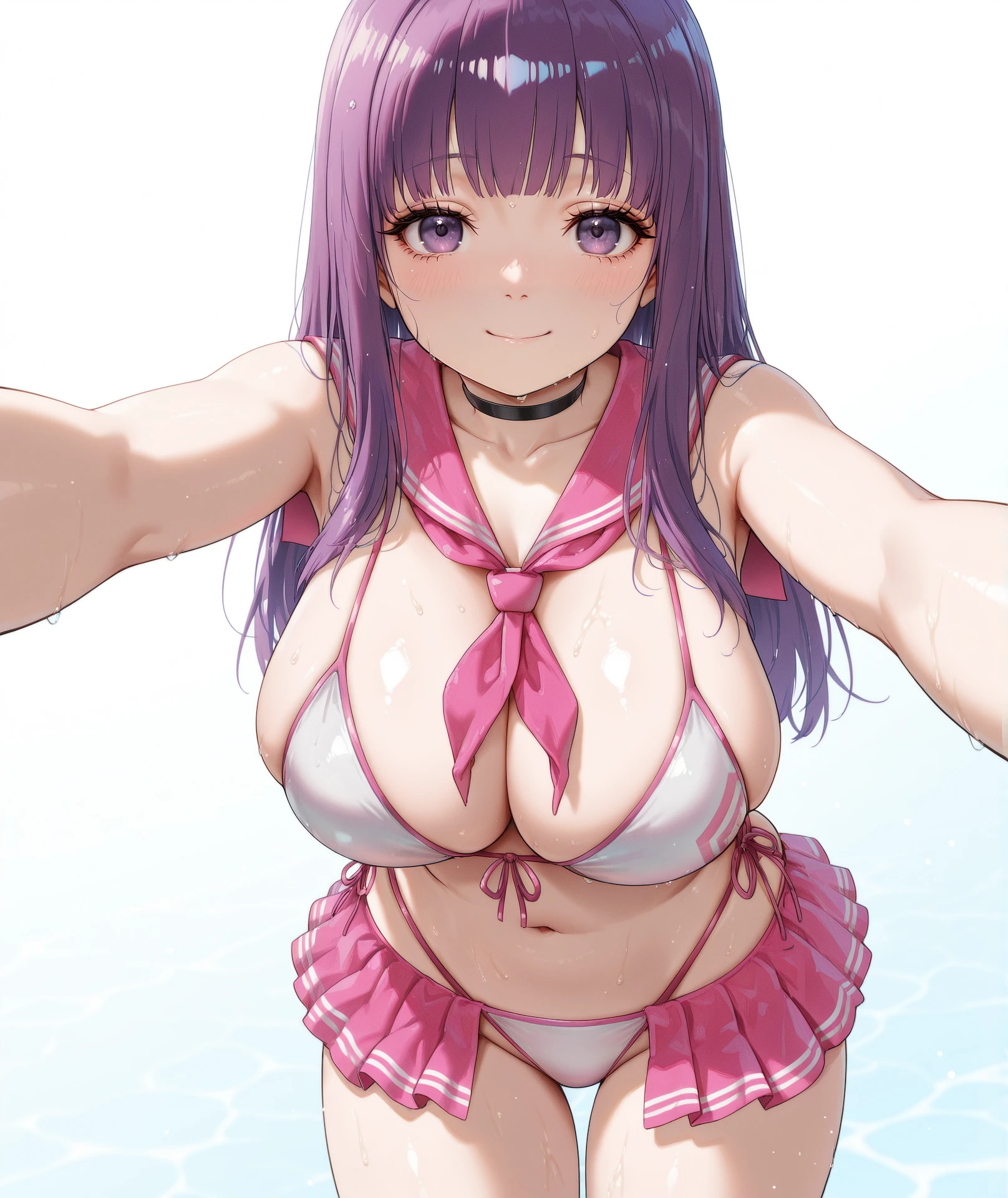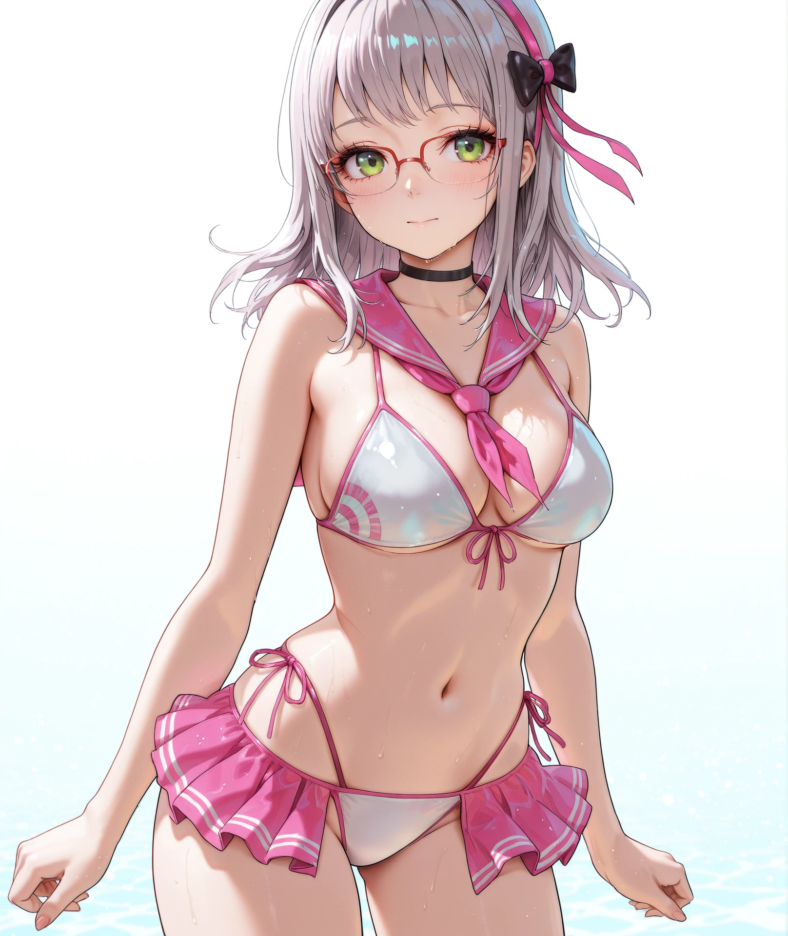 breasts, navel, cleavage, bare shoulders, collarbone, stomach, swimsuit, bikini, choker, sailor collar, neckerchief, black choker, side-tie bikini bottom, white bikini, front-tie top, pink neckerchief, sailor bikini, front-tie bikini top, pink bikini, pink sailor collar, skirt, thighs, pleated skirt, highleg, pink skirt, microskirt, highleg bikini, bikini skirt,
