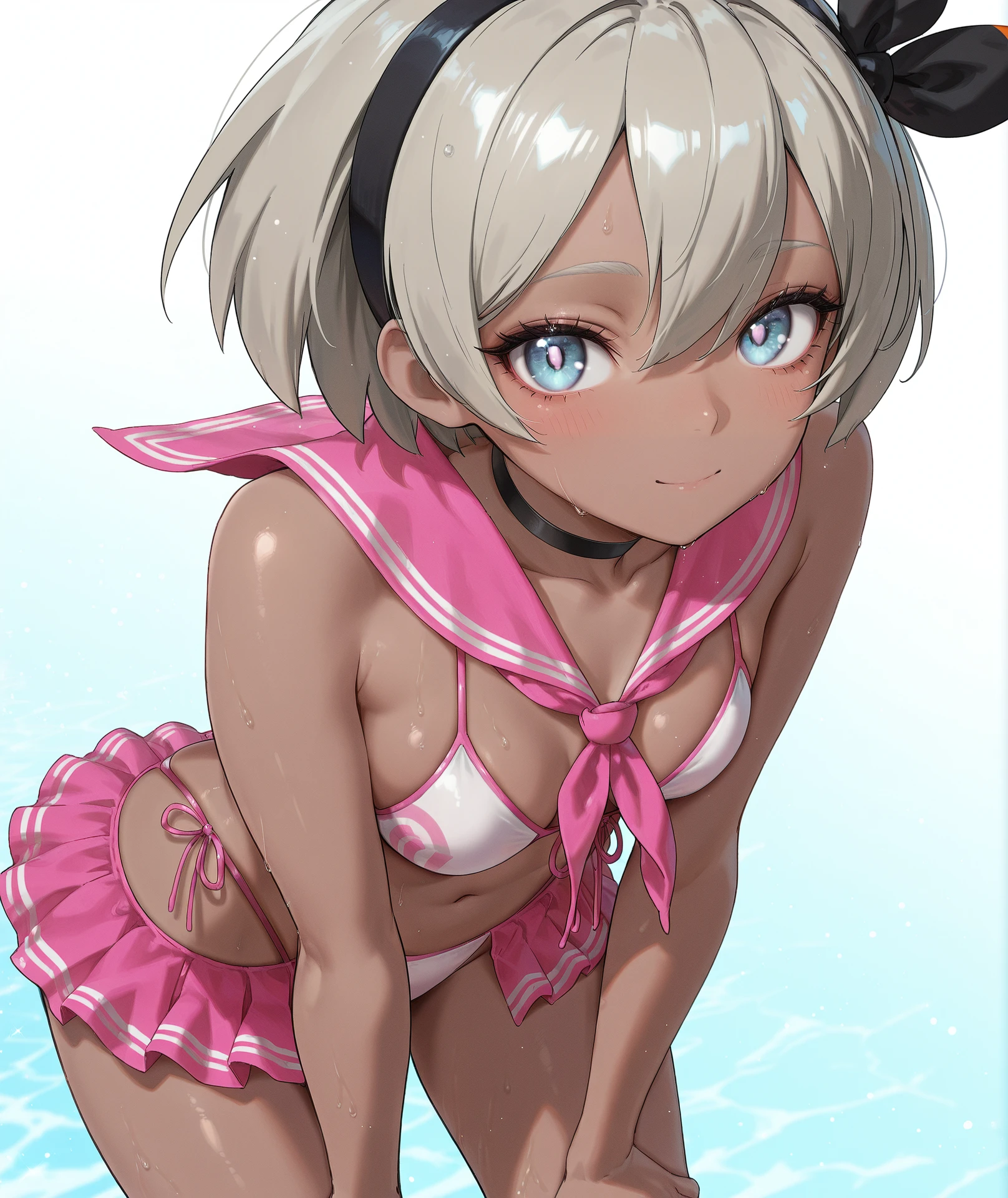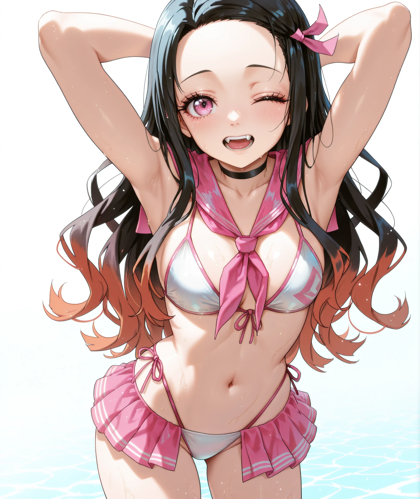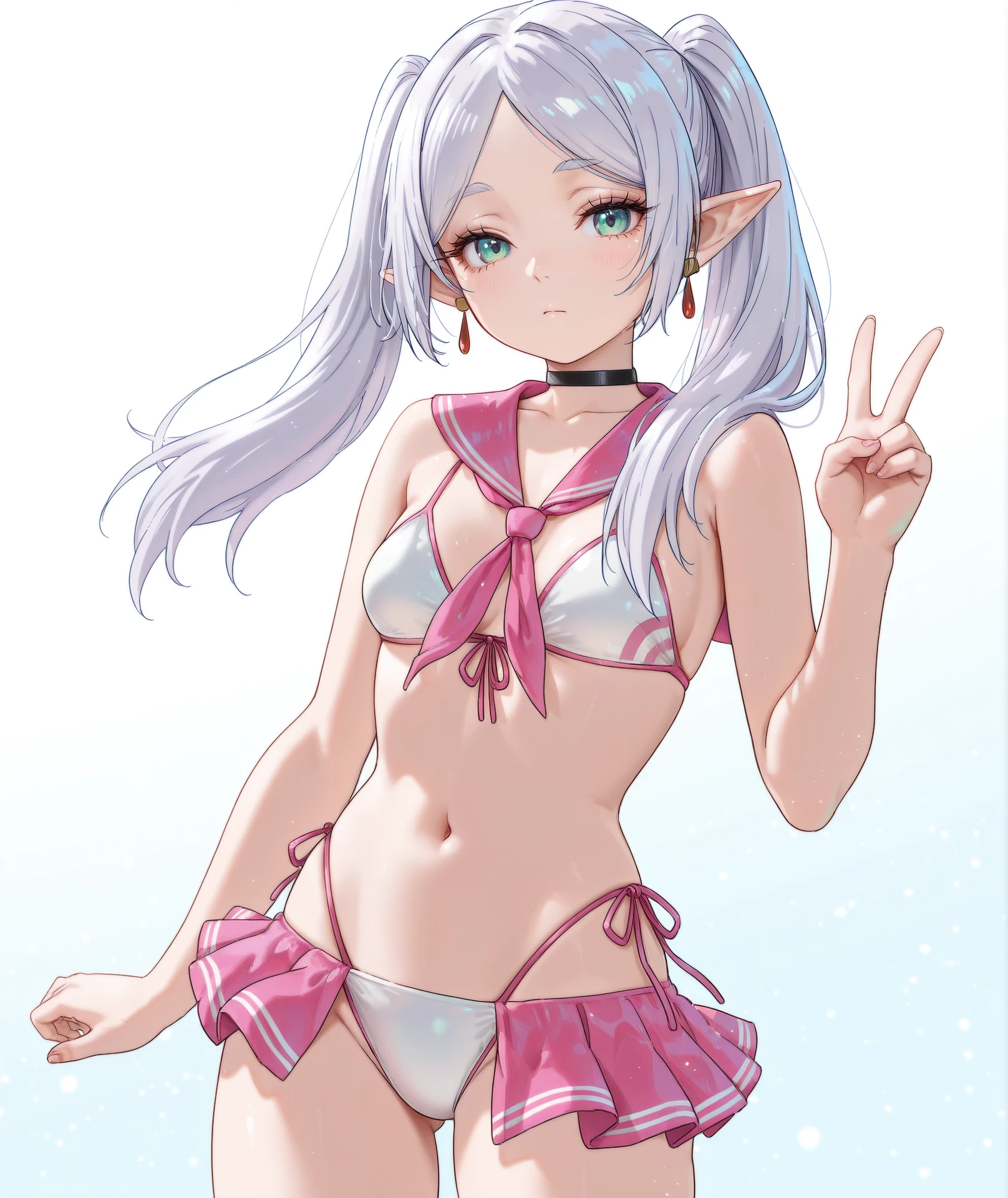 breasts, navel, cleavage, bare shoulders, collarbone, stomach, swimsuit, bikini, choker, sailor collar, neckerchief, black choker, side-tie bikini bottom, white bikini, front-tie top, pink neckerchief, sailor bikini, front-tie bikini top, pink bikini, pink sailor collar, skirt, thighs, pleated skirt, highleg, pink skirt, microskirt, highleg bikini, bikini skirt,